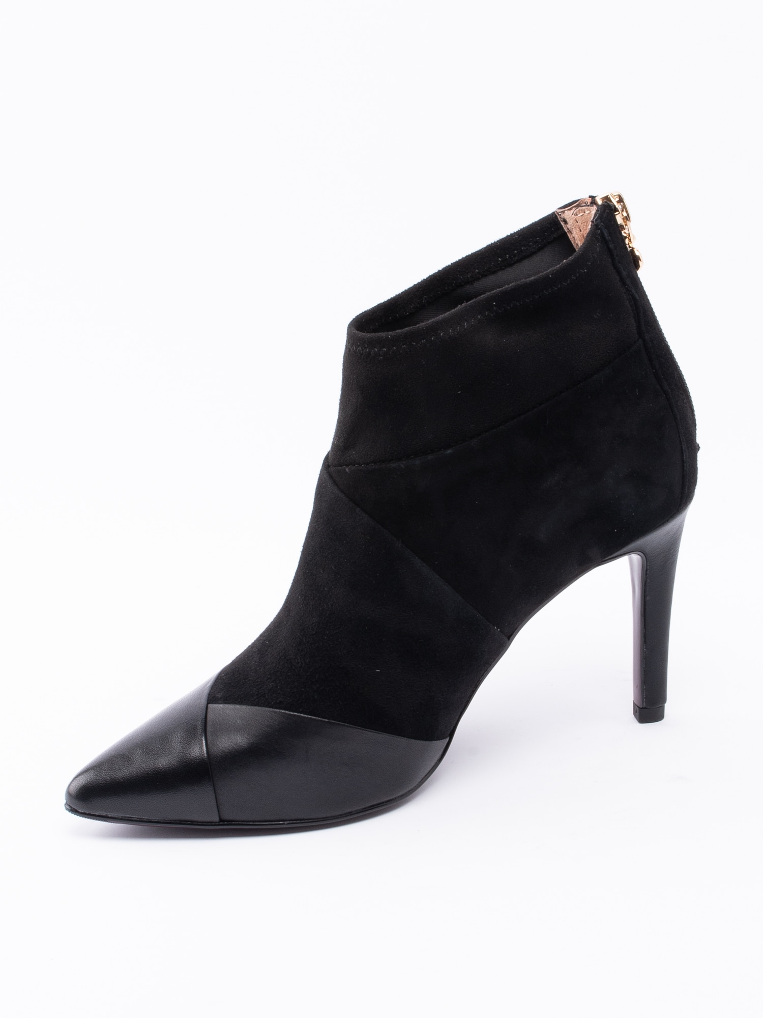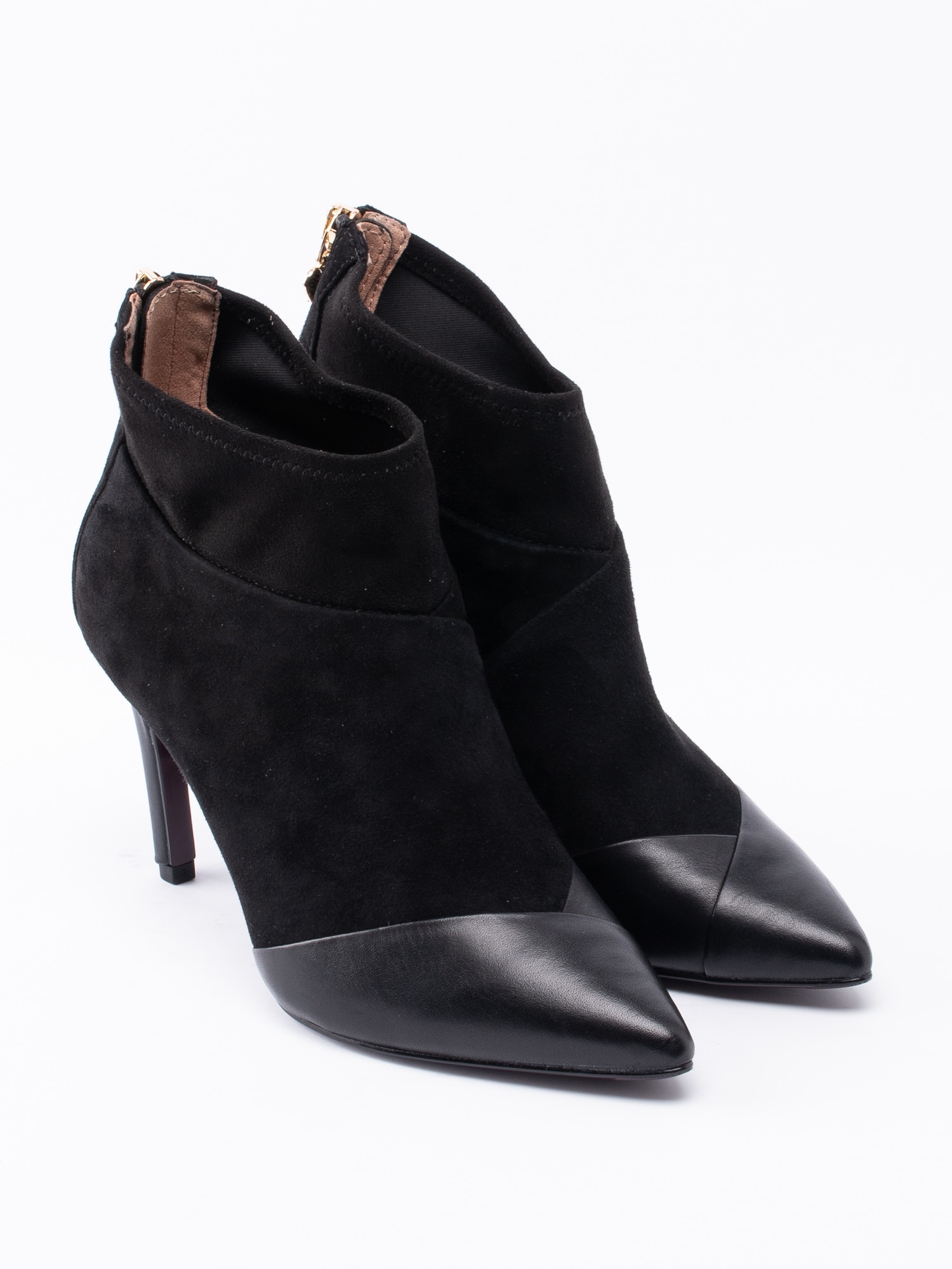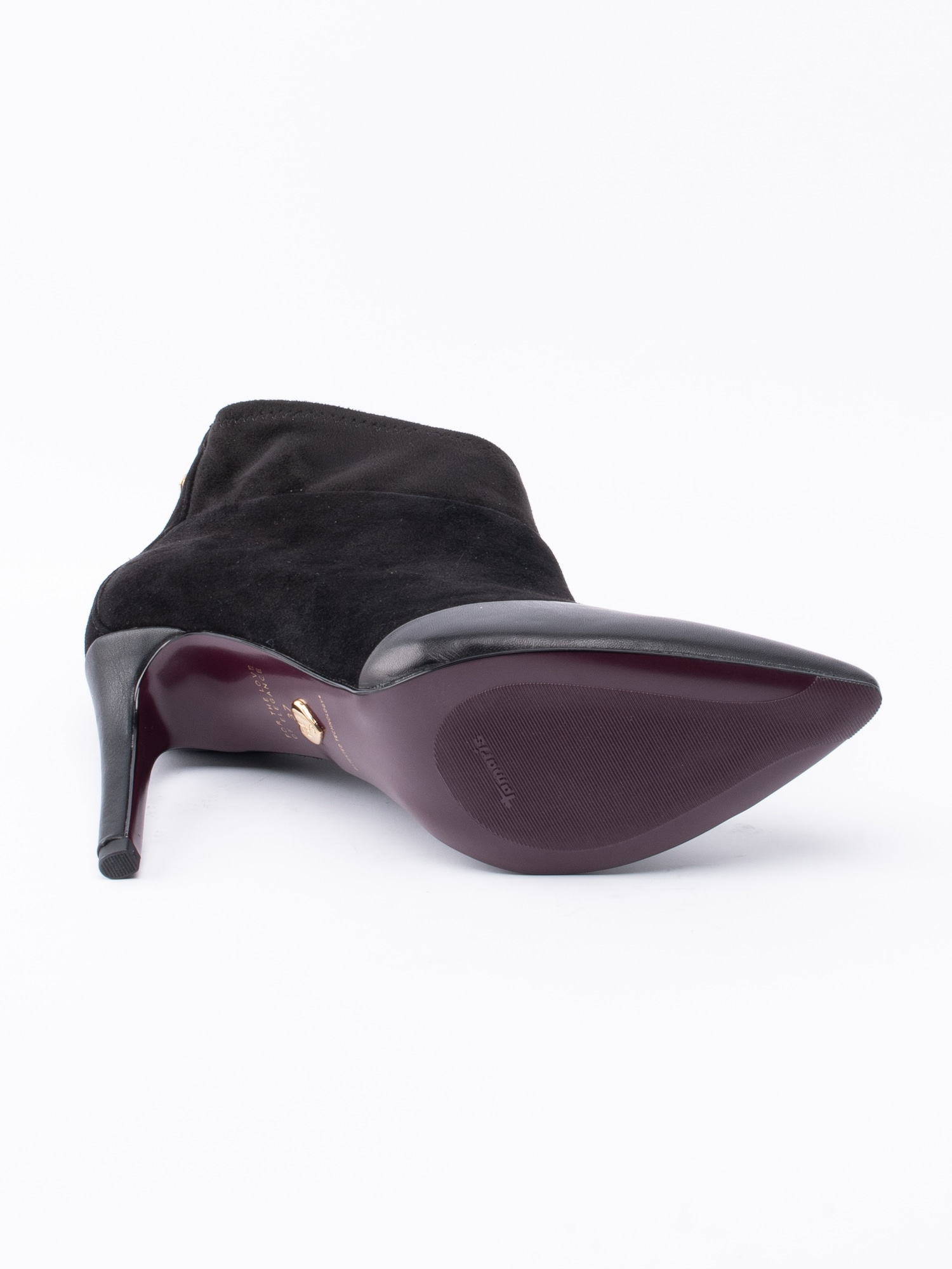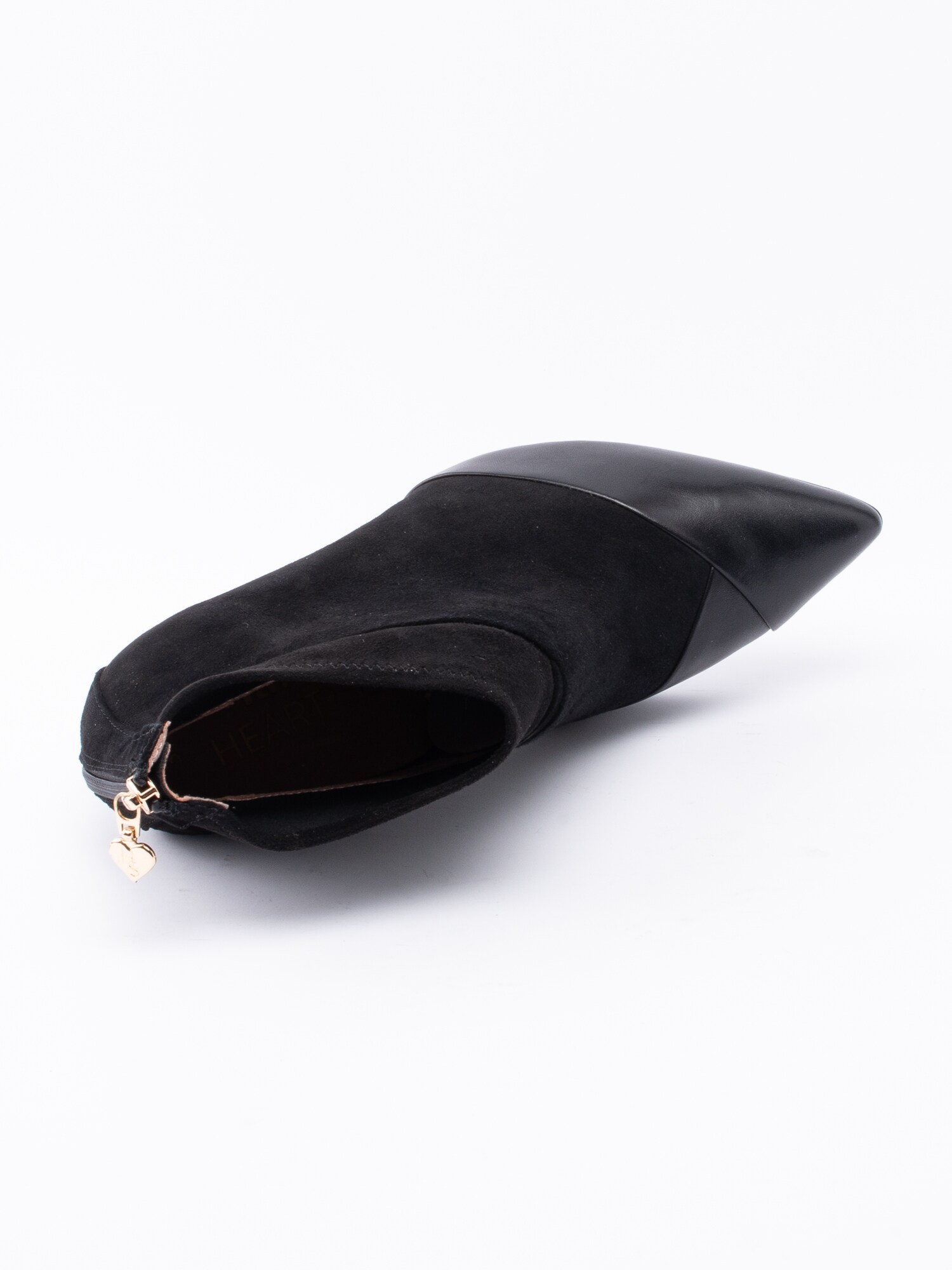 Svart stövlett från Tamaris Heart & Sole i mocka. Skaftkant i mjuk textil för en skönare känsla. Spetsig tå i skinn. Dragkedja på baksidan med ett hjärta i guld som öppning. Svart foder i textil och rosa, löstagbar innersula i mocka med präglad logga. Klädd stilettklack i syntet på ca 9 cm höjd. Mörklila yttersula i syntet med slät yta och logga.