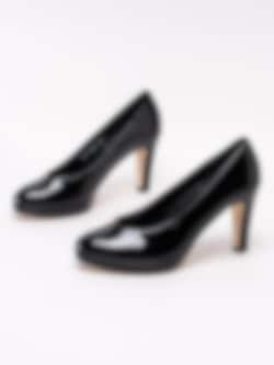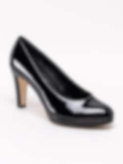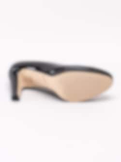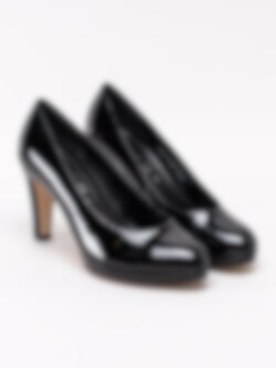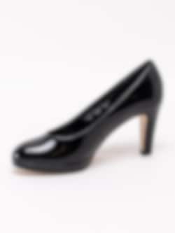Svarta klassiska pumps från Gabor tillverkade i syntetlack. Tidlös modell med sin lackade design passar utmärkt till en dressad look. Rund tå och rund skurning. Foder i syntet med innersula i skinn. Klädd klack på ca 9 cm med platå på ca 1.5 cm.