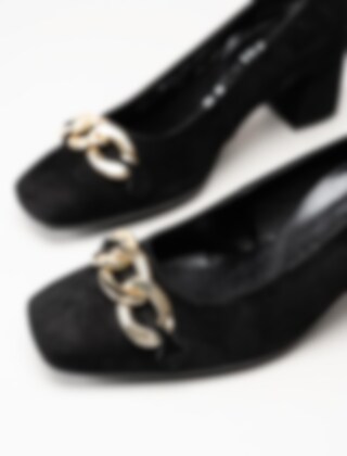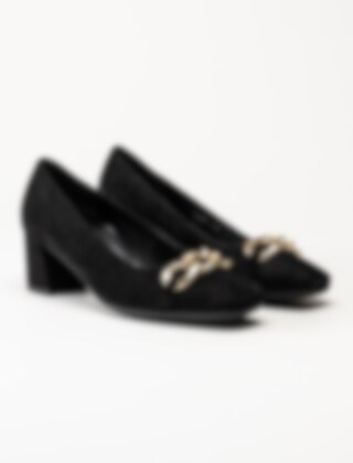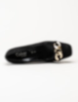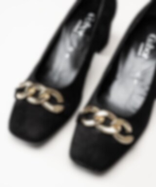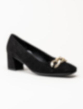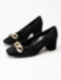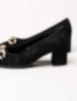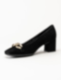 Svarta pumps i mocka från Gabor. Klassiska pumps med fyrkantig tå och dekorativt spänne ovantill. Mockaklädd klossklack på ca 6 cm. Räfflad yttersula för bättre grepp.