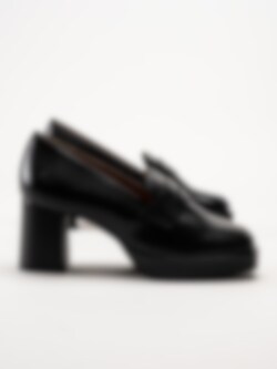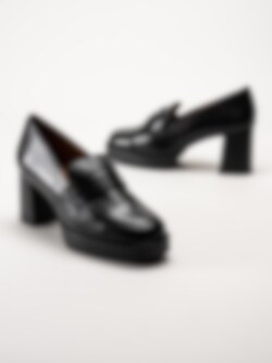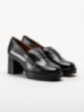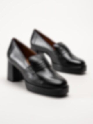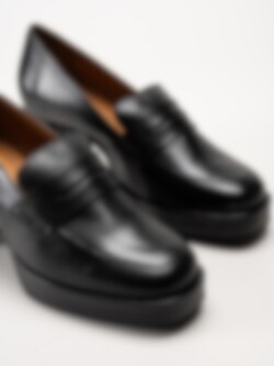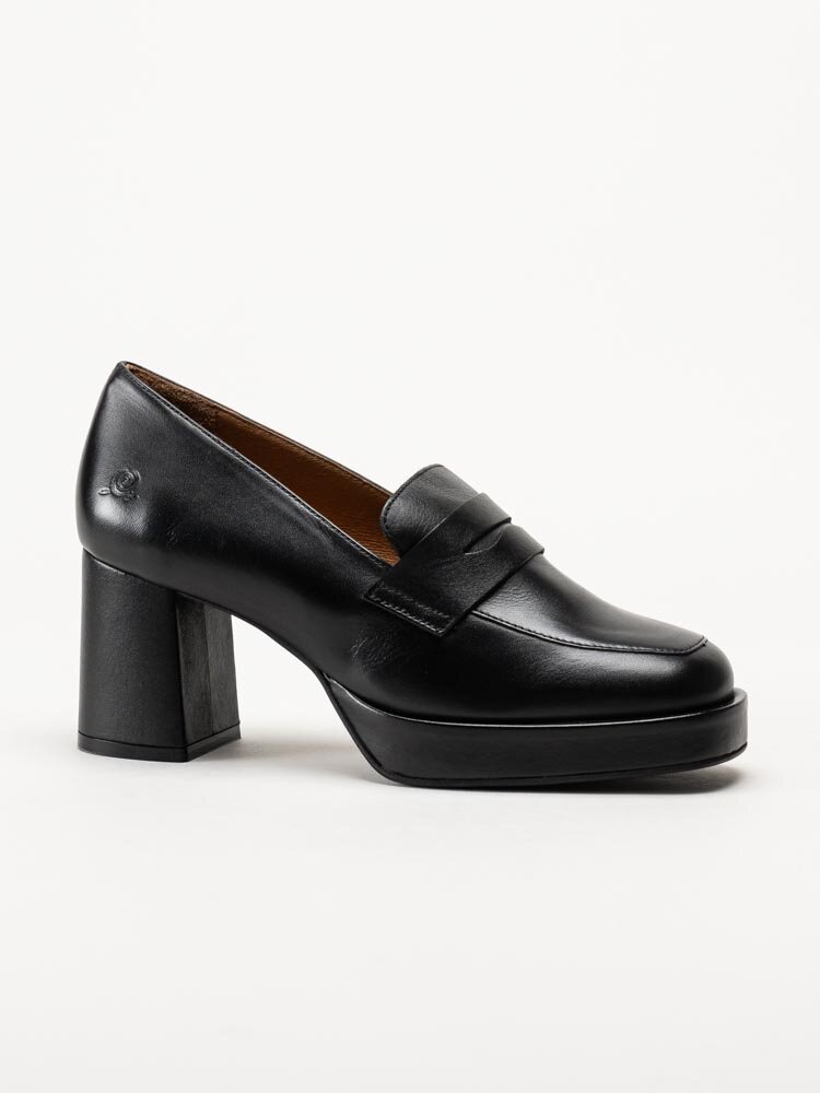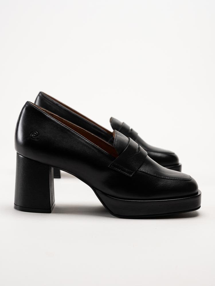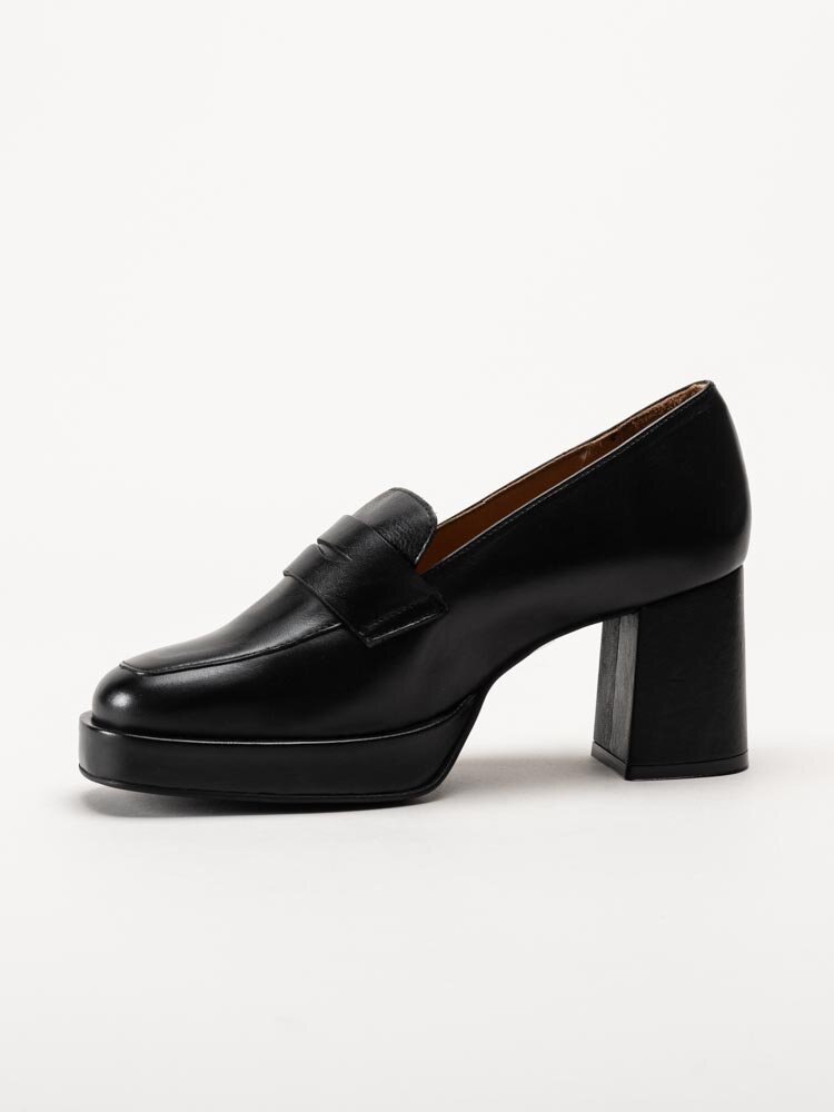 Svarta platåpumps i skinn från Rosa Negra. Snygga, loafersliknande pumps medd bekväm klackhöjd på ca 7 cm. En cool modell som passar lika bra till vardags som till fest!