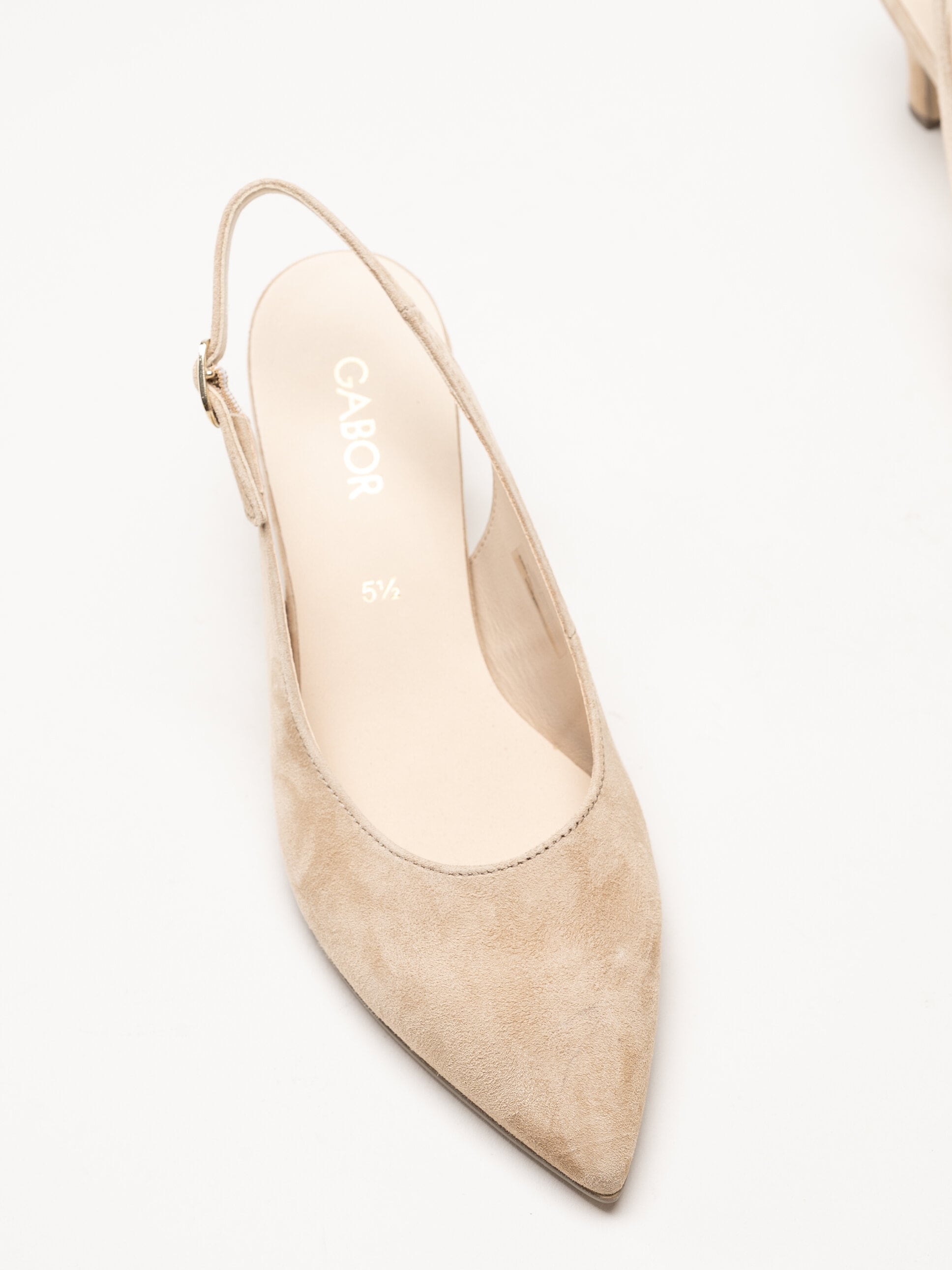 Beige slingback pumps i mocka från Gabor i färgen Sand. Skorna är tillverkade i mjuk mocka som ger ett elegant och sofistikerat uttryck. Slingback-designen med öppen häl skapar en luftig känsla och har ett litet spänne som kan justeras för optimal passform. Den feminina siluetten passar både till vardag och mer uppklädda tillfällen.