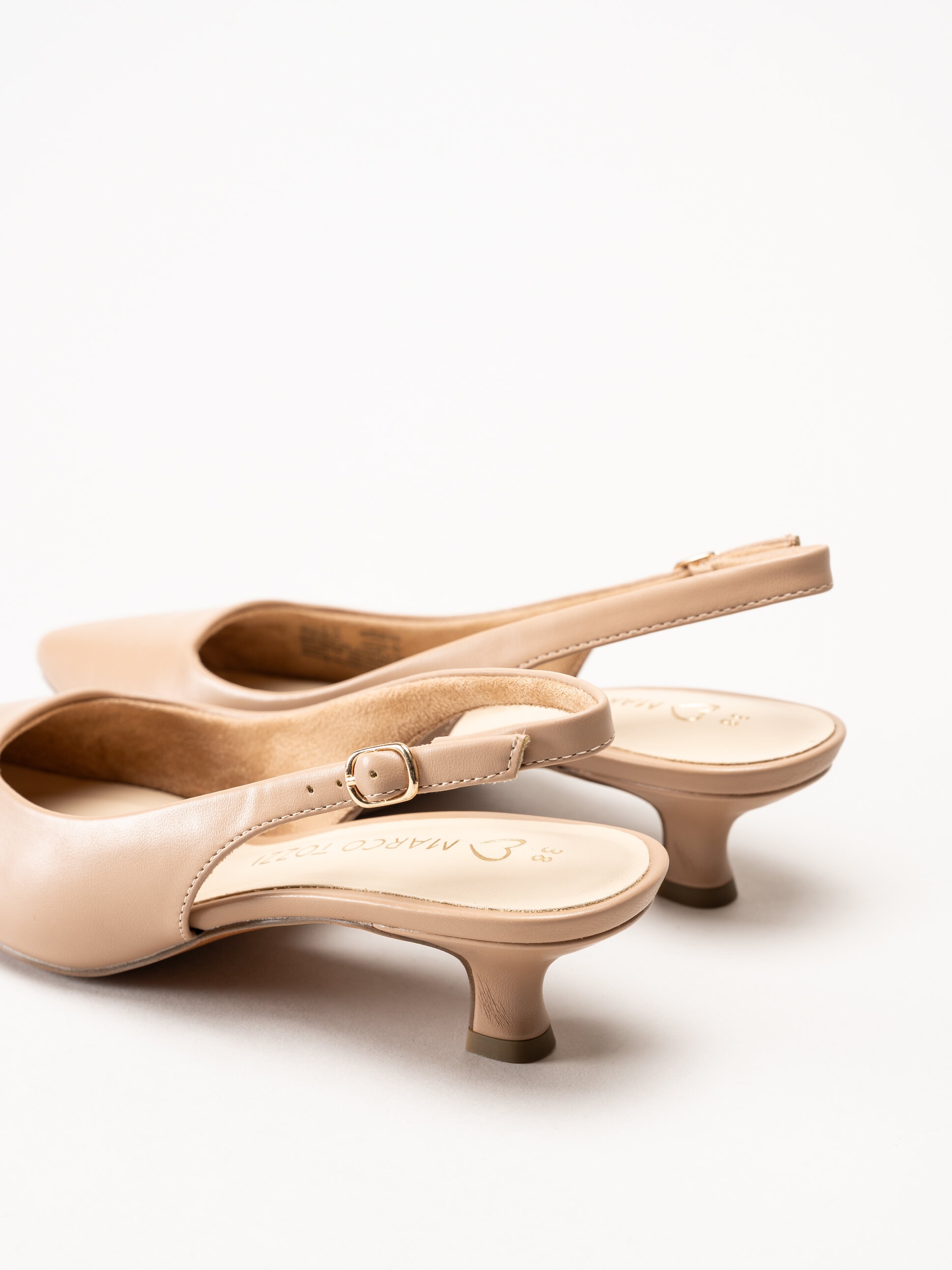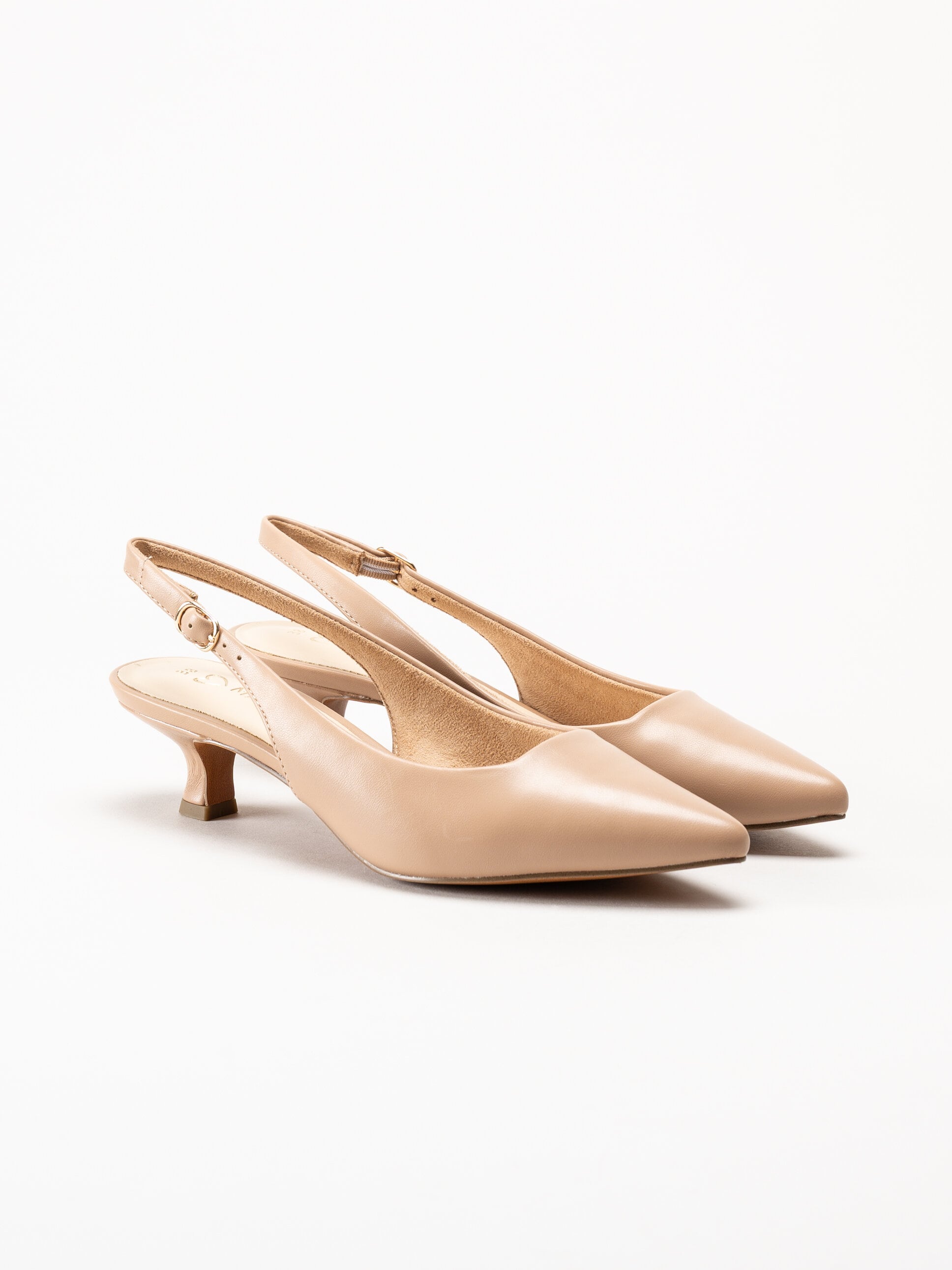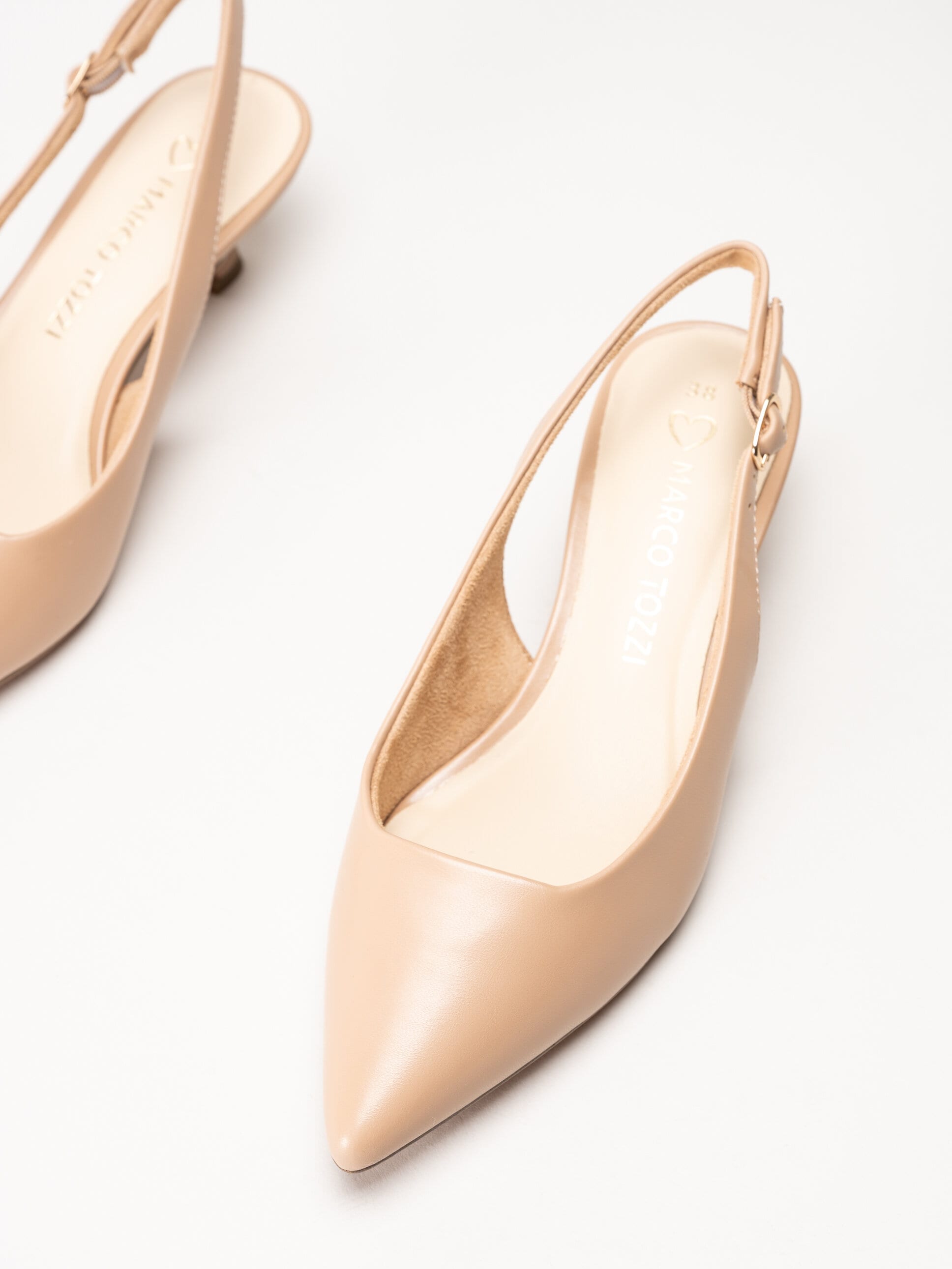 Beige slingback pumps från Marco Tozzi i färgen Cappuccino. Skorna är tillverkade i syntetmaterial och har en stilren och feminin design som passar perfekt för både vardag och festligare tillfällen. Den öppna hälen med justerbar slingback-rem ger en säker och bekväm passform.
