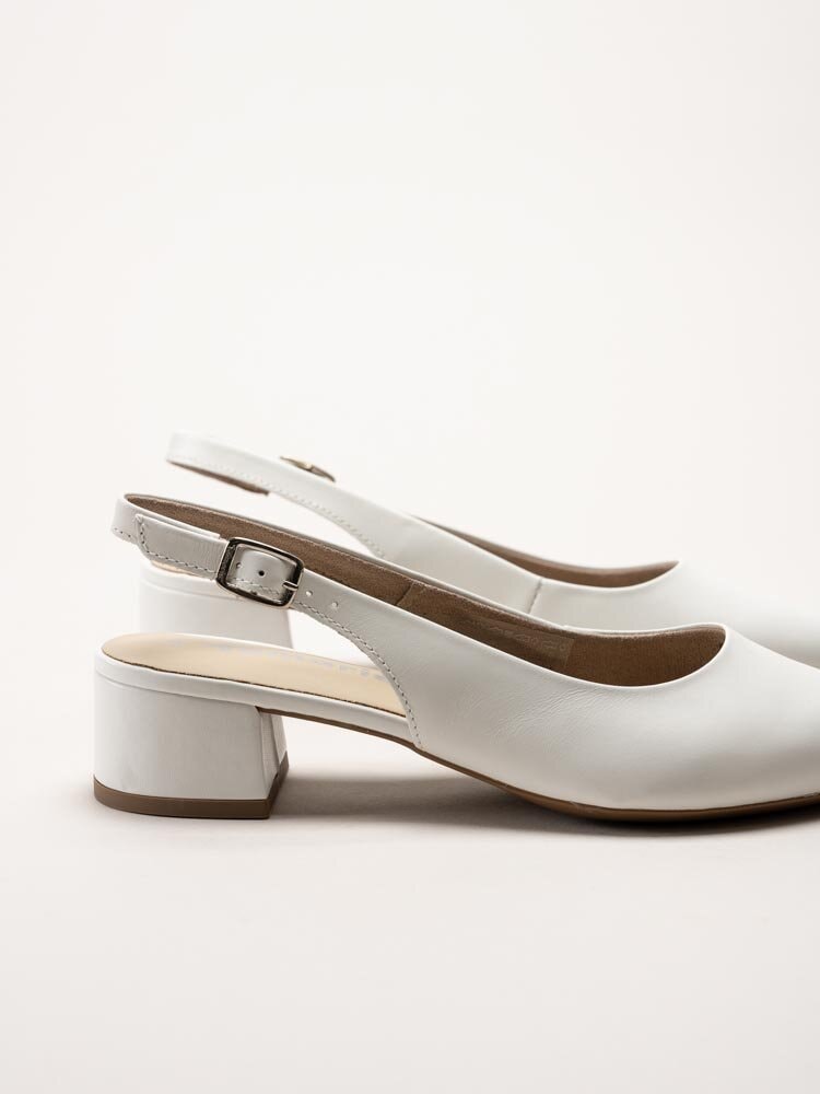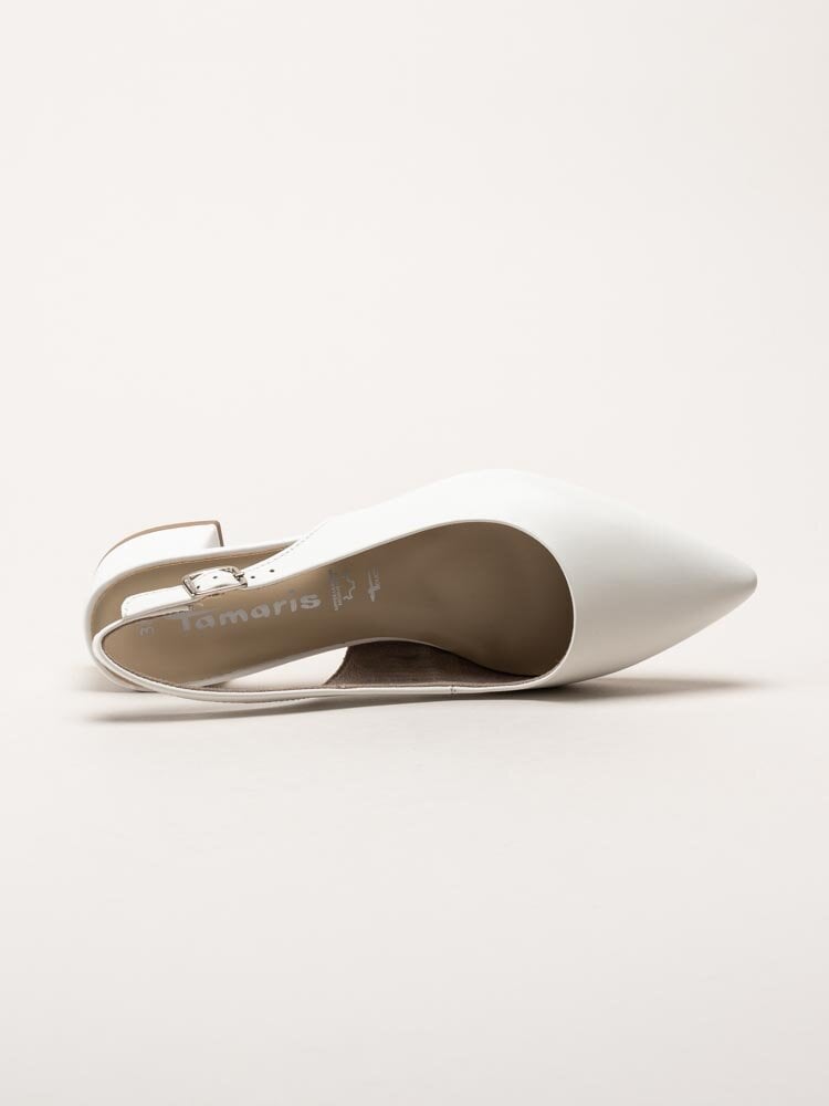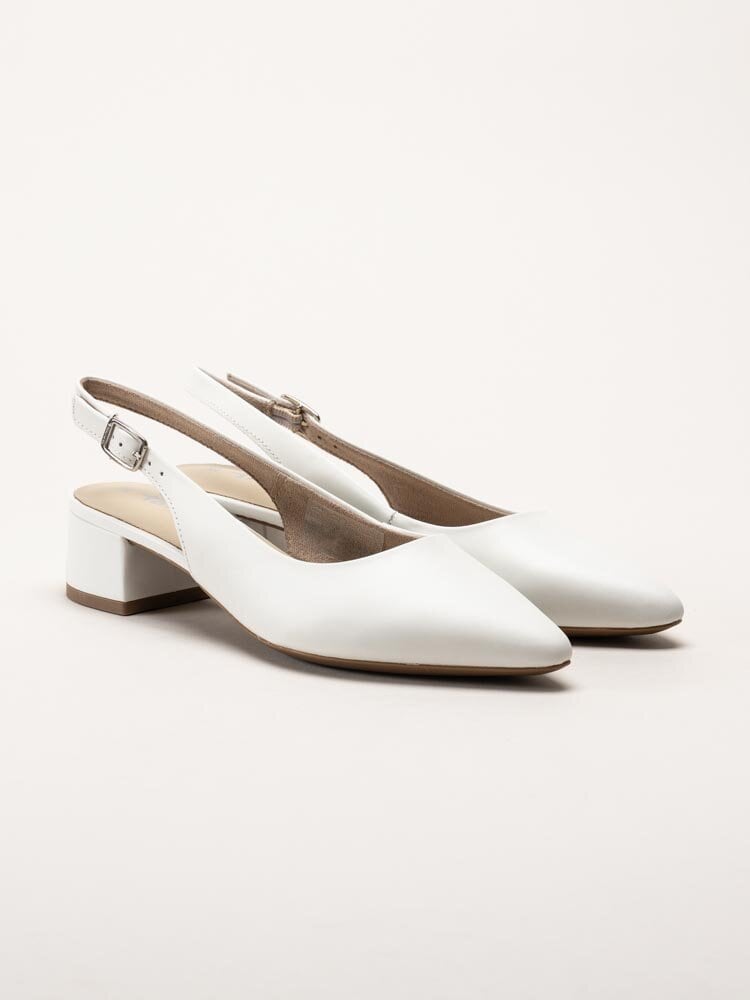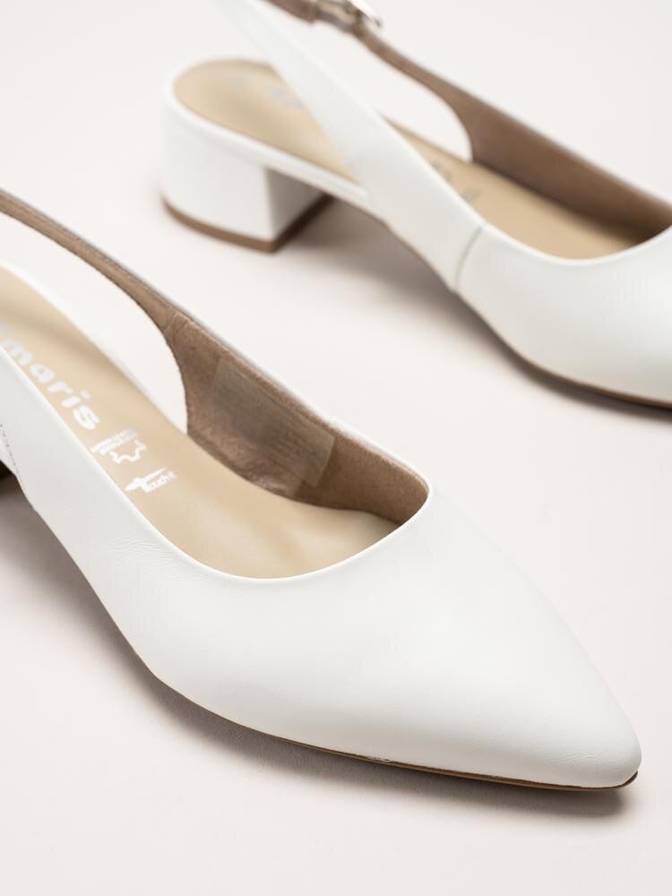 Vita slingback pumps i skinn från Tamaris i färgen White Leather. En elegant och feminin modell i mjukt skinn som ger ett klassiskt och sofistikerat helhetsintryck, lika fin till kontoret som till festligare sammanhang. Slingback-designen skapar en luftig känsla och ger samtidigt en trygg och följsam passform runt foten.