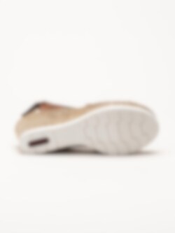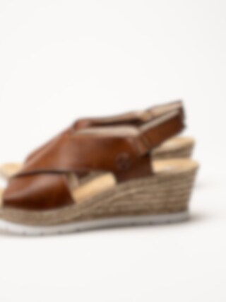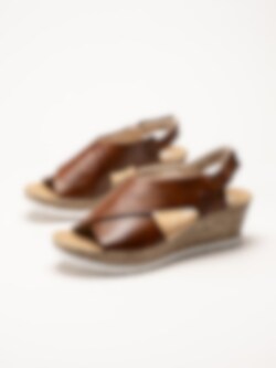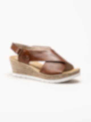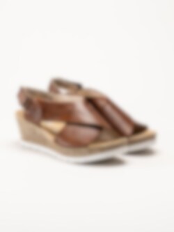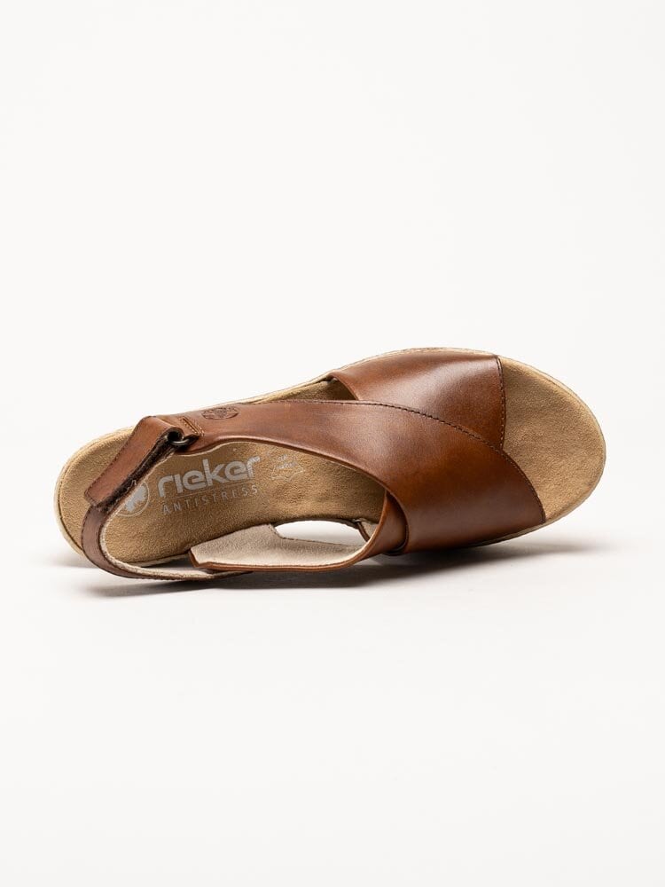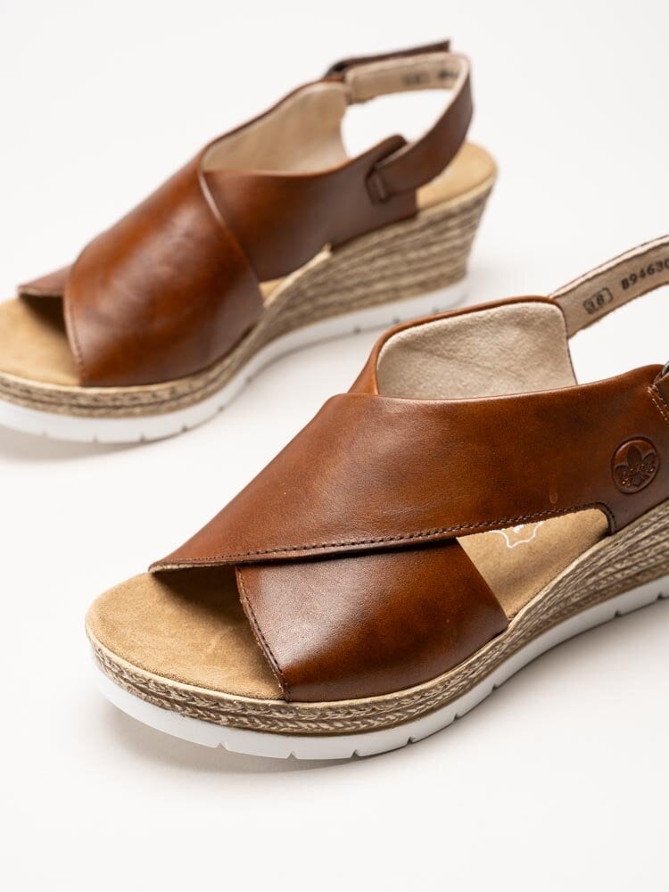 Bruna kilklackade sandaletter från Rieker i färgen Reh. Sandaletterna är tillverkade i mjukt skinn som ger ett stilrent och elegant uttryck. Den feminina designen med krysslagda remmar över foten kombineras med en stabil kilklack som ger både höjd och komfort. Bak vid hälen finns en kardborre som gör det enkelt att justera passformen.