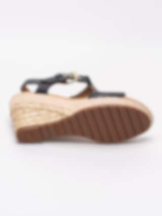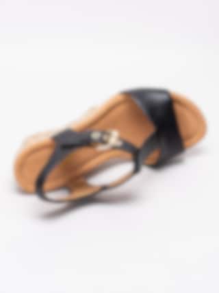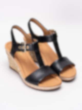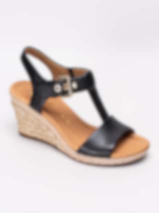 Svarta sandaletter från Gabor i skinn. Stilrena och snygga sandaletter med repklädd kilklack. Utrustad med en bred G läst för att passa den bredare foten. Hälrem som sitter ihop med justerbar vristrem med guldspänne som öppning samt för att anpassa passformen. Beigt foder i textil och innersula i skinn med mjuk fotbädd. Kilklack på ca 8.5 cm med platå på ca 2.5 cm. Brun yttersula i syntet randigt mönster och präglad logga.