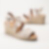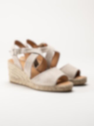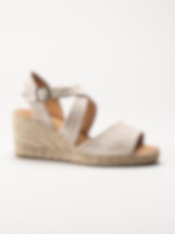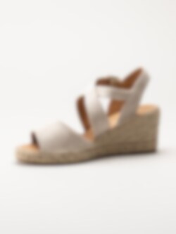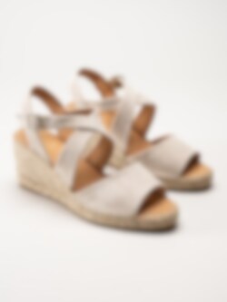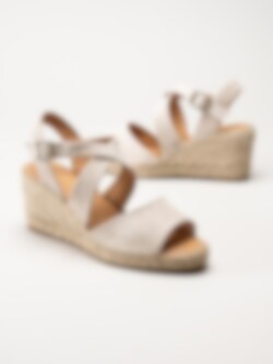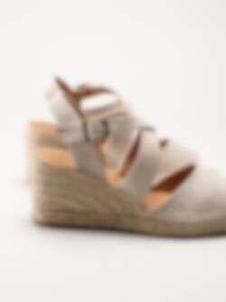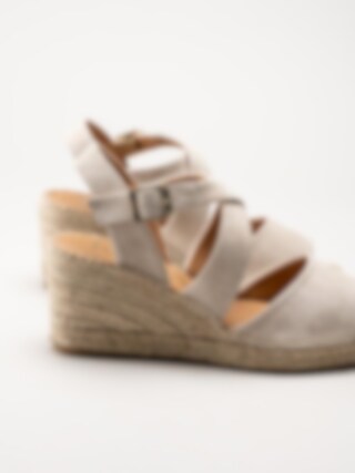 Beige kilklackade sandaletter i mocka från Kanna. Festliga kilklackade espadrillos med öppen tå, guldfärgat spänne och korsade band i mocka. Ofodrad insida med skön och mjuk innersula i syntet. Repklädd kilklack som passar utmärkt till sommarens outfits. Bekväm klack på ca 7 cm med platå på ca 2 cm. Fin modell för våren och sommarens fester!