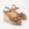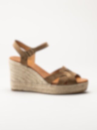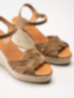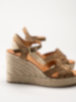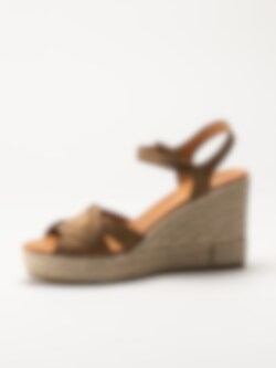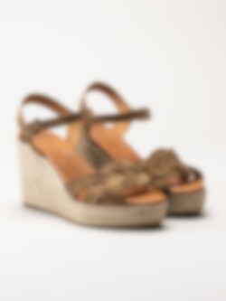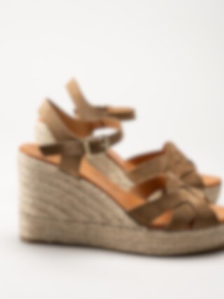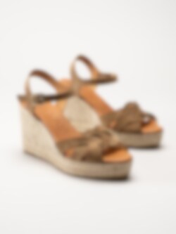 Bruna kilklackade sandaletter i mocka från Kanna. Festliga kilklackade espadrillos med öppen tå, guldfärgat spänne och snyggt flätat band i mocka. Ofodrad insida med skön och mjuk innersula i skinn. Repklädd kilklack som passar utmärkt till sommarens outfits. Bekväm klack på ca 9,5 cm med platå på ca 3,5 cm. Fin modell för våren och sommarens fester!