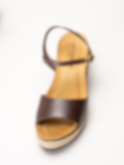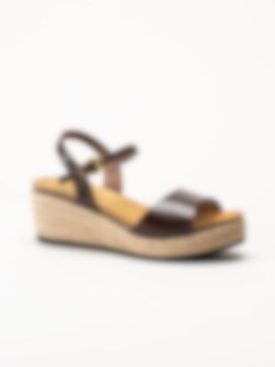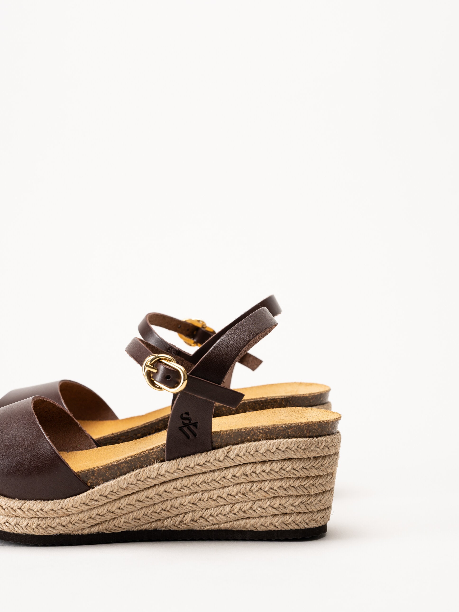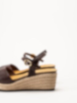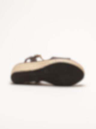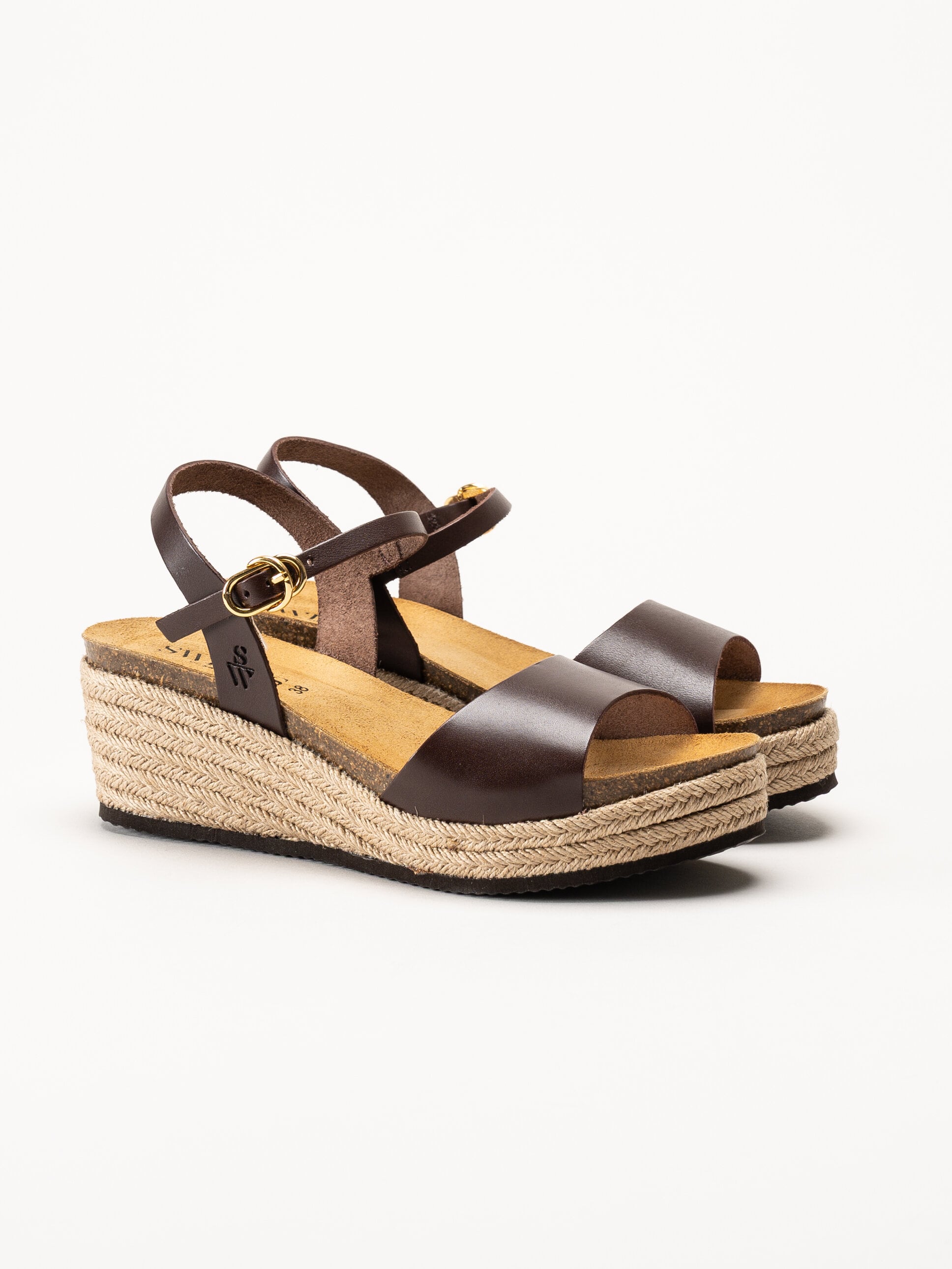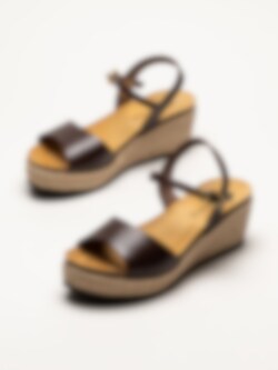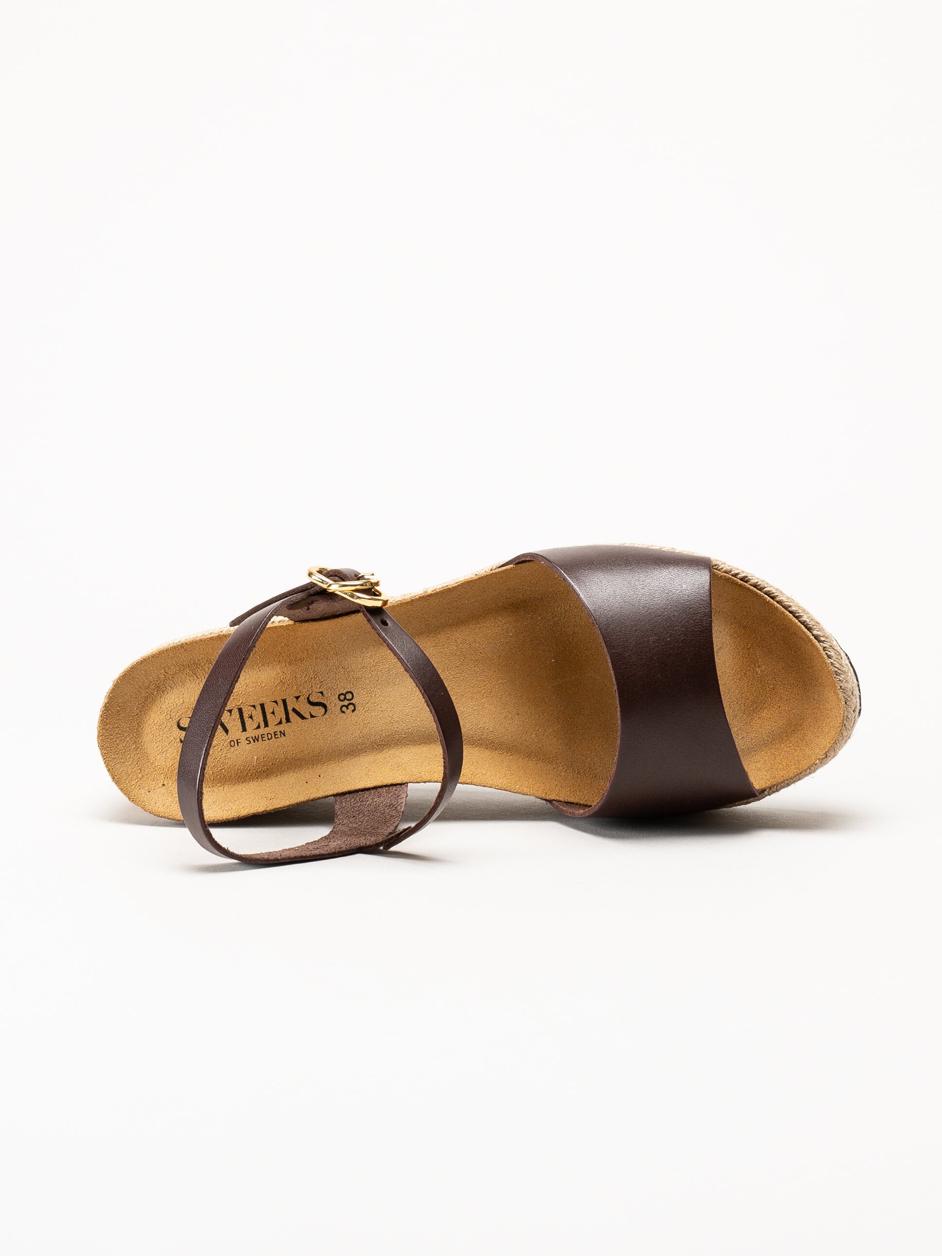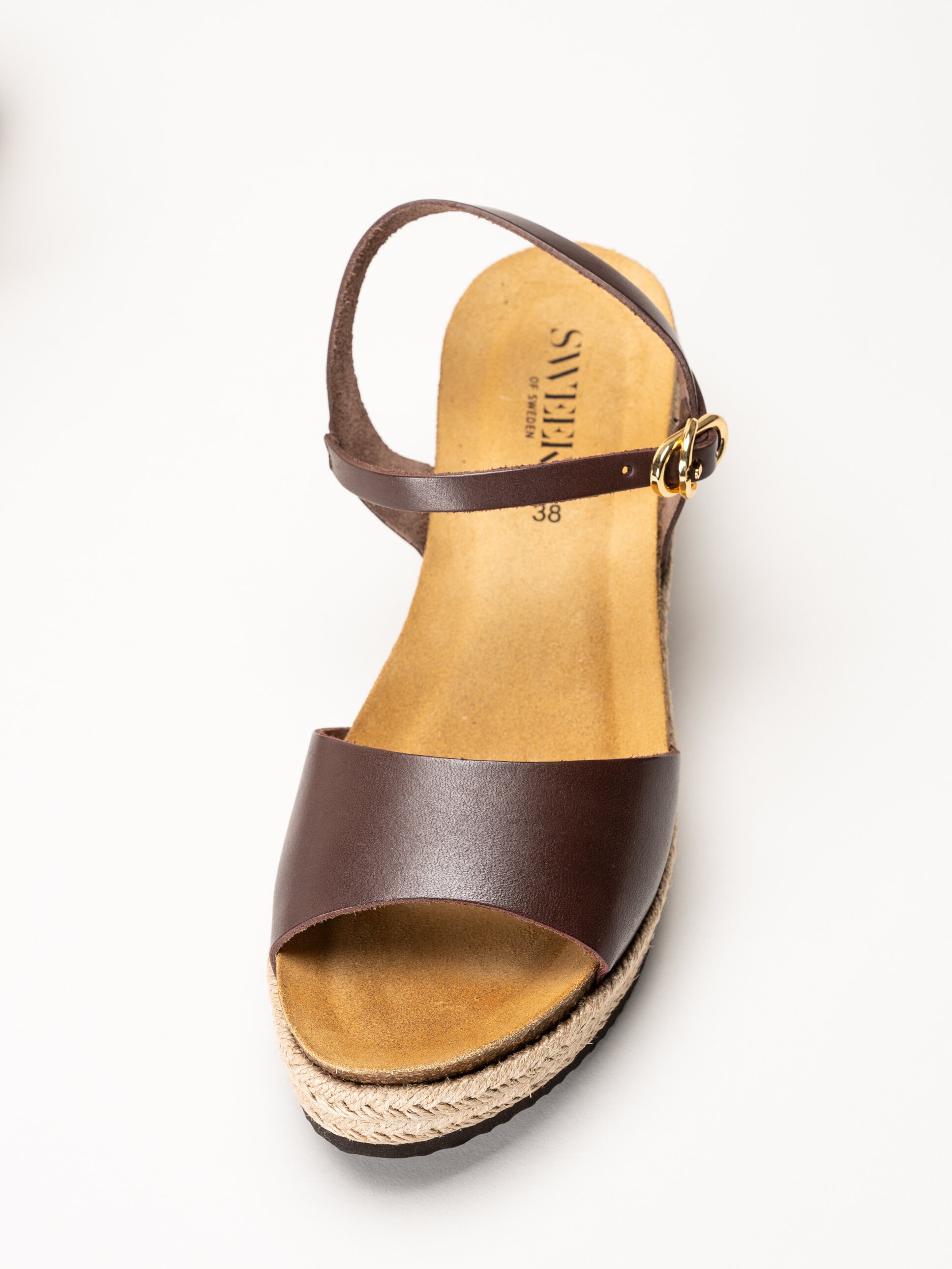 Mörkbruna espadrillos från Sweeks med en somrig och elegant design. Ovandelen är tillverkad i skinn och har en bred rem framtill som ger ett stilrent och stabilt uttryck. Modellen har en justerbar rem med spänne som gör det enkelt att anpassa passformen efter foten. Kilklacken ger en bekväm höjd och bidrar till en feminin och stabil gång.