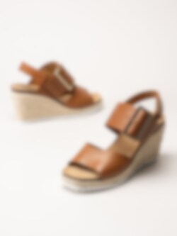 Bruna kilklackade sandaletter Tyra Cognac i skinn från Sweeks. Fina sommarskor med hälrem som stängs med velcro och justerbart guldspänne i metall. Repklädd kilklack som blir riktigt snygg till sommarens outfits. Klackhöjd på ca 8 cm med platå på ca 2.5 cm. Vit yttersula i ett lite vågigt synestetiskt material. Snygg och skön sommarsandal när du vill vara lite mera klädd.