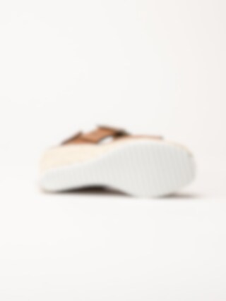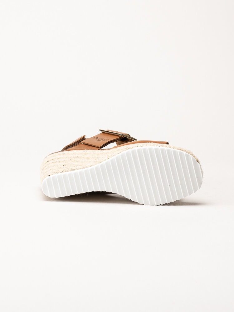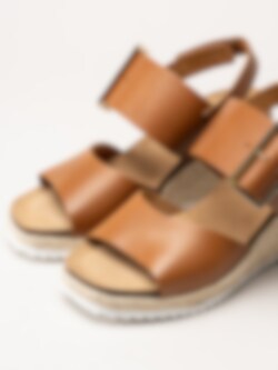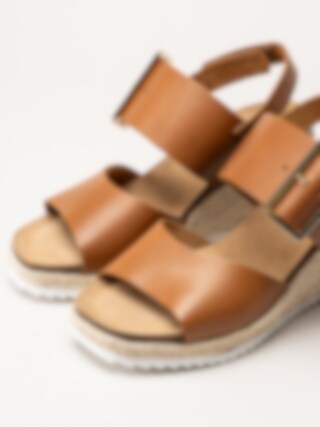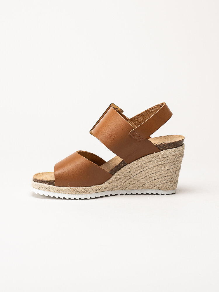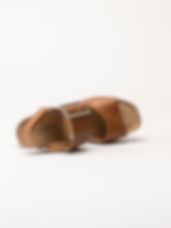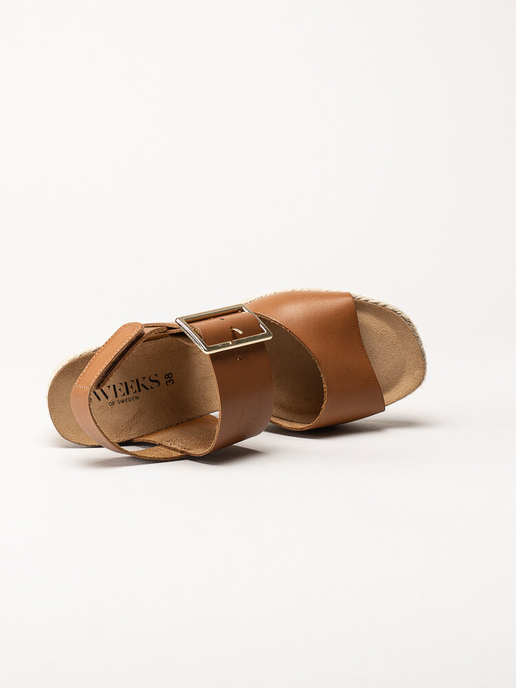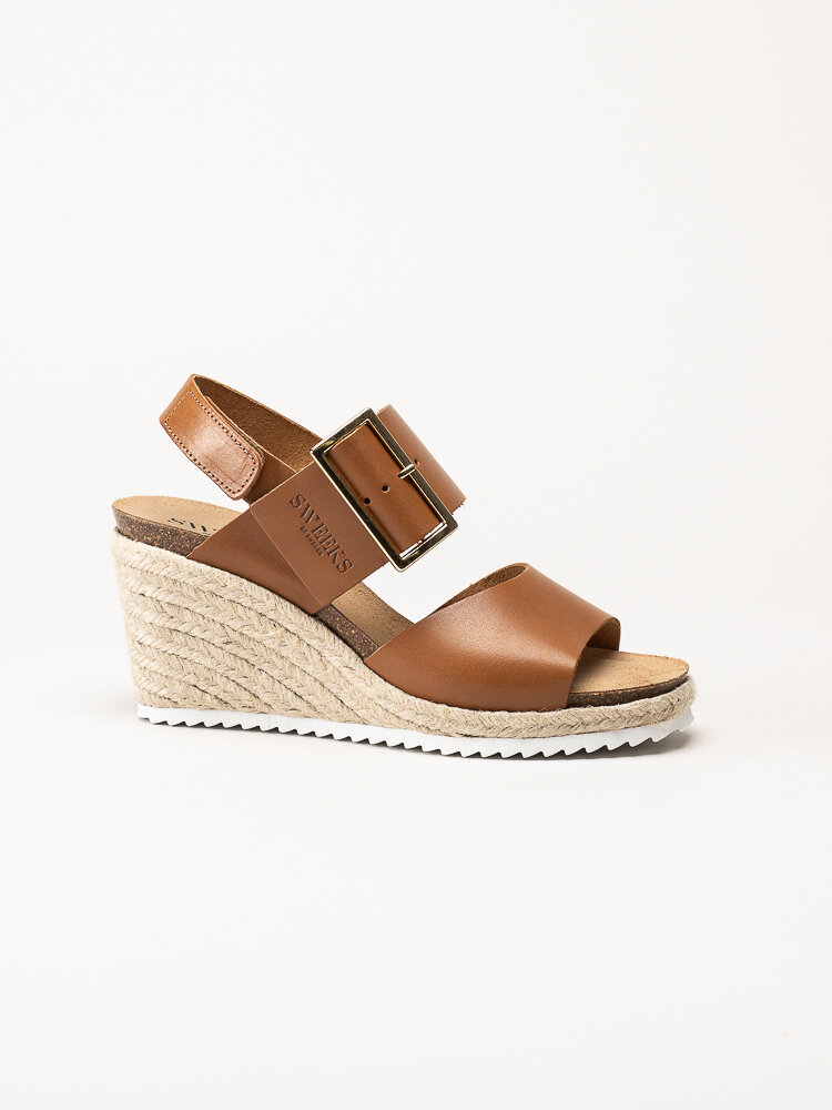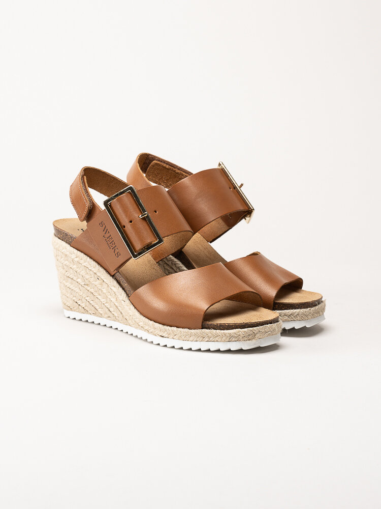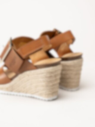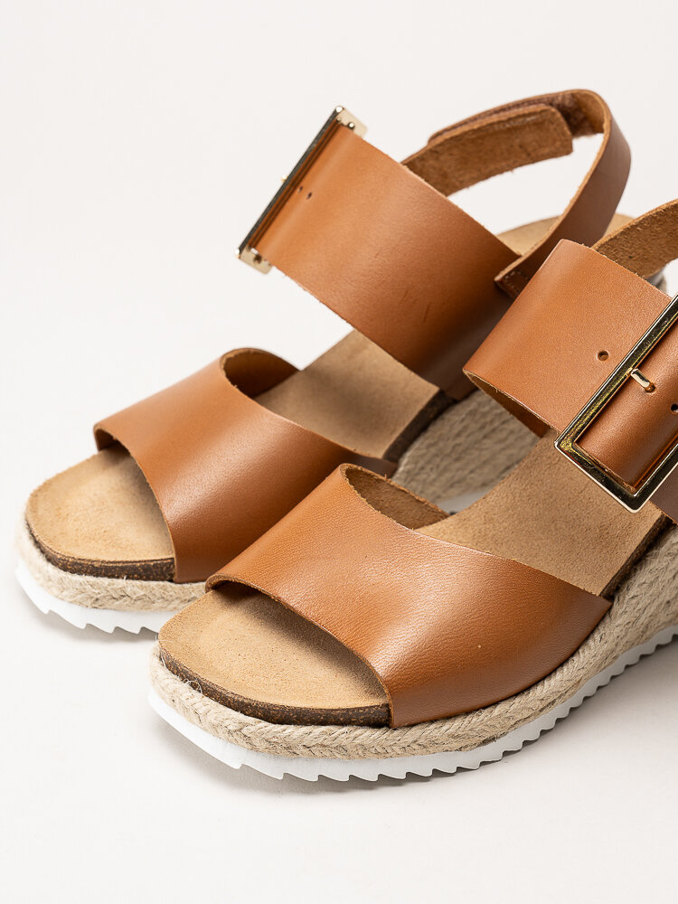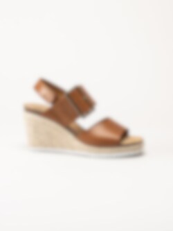 Mörkbruna sandaletter med kilklack i färgen Cognac från Sweeks i en stilren och somrig design. Ovandelen är tillverkad i skinn som ger ett mjukt och följsamt uttryck, och den repklädda kilklacken ger ett trendigt uttryck som passar perfekt till sommarens outfits. Modellen har en hälrem med kardborrestängning samt ett justerbart guldspänne över foten som gör det enkelt att anpassa passformen. Klackhöjden är ca 8 cm med en platå på ca 2,5 cm, vilket ger både höjd och stabilitet.
