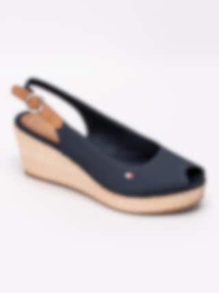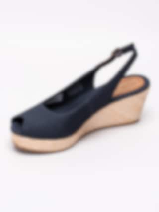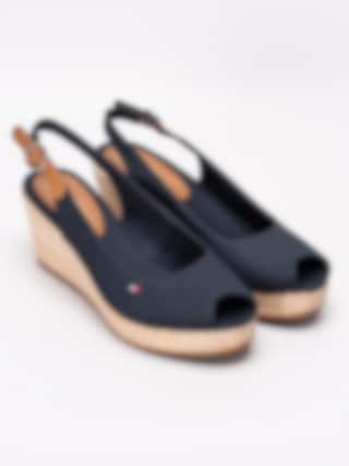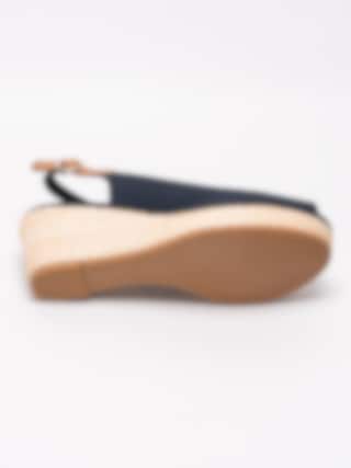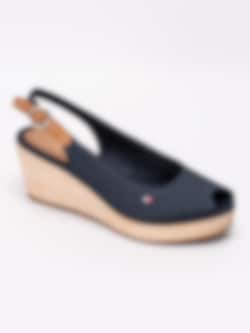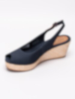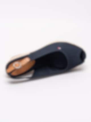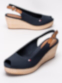 Mörkblå sandaletter Iconic Elba Basic från Tommy Hilfiger tillverkade i bomull. Liten rund öppen tå med broderad logga på utsidan. Brun vristrem i skinn med runt spänne i metall för att anpassa passformen. Mörkblått foder och innersula i linnetyg med sydd brun skinnbit med präglad logga i hälen. Flätad kilklack med bastkaraktär på ca 7 cm med platå på ca 3 cm. Brun yttersula i syntet med repmönster och präglad logga.