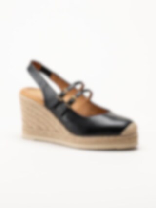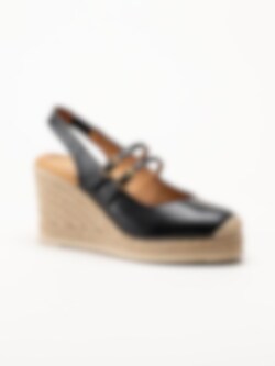 Svarta kilklackade espadrillos i skinn Caceres_25 Mumm från Unisa. Dessa eleganta espadrillos med hälrem i mjuk och två tunna remmar som ger en lyxig känsla. Den justerbara vristremmen i skinn ger både stabilitet och en elegant detalj som ramar in foten vackert. Innersulan i mjukt skinn erbjuder optimal komfort, medan den klassiska kilklacken i jute ger skorna dess tidlösa, somriga karaktär. Med en klackhöjd på ca 8 cm får du både en bekväm och förlängande effekt som passar perfekt för både vardag och mer uppklädda tillfällen. Unisa kilklackade espadrillos - sommarens perfekta kombination av stil och komfort!