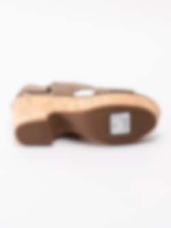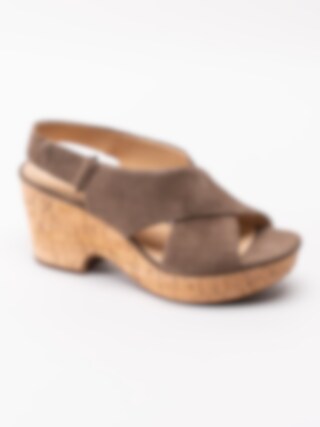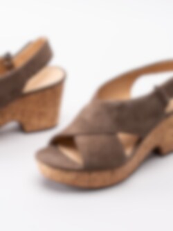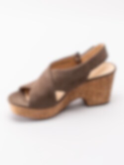 Mörkgröna sandaletter Maritsa Lara från Clarks tillverkade i mocka. Korslagda band som sitter ihop med hälrem. Hälrem med kardborre som öppning. Beigt foder och mjuk innersula i skinn med konturerad logga i hälen och mörkgrön tå i mocka. Tjock korkbeklädd klack på ca 8.5 cm med platå på ca 3.5 cm. Brun yttersula i syntet med mönstrat framparti och konturerad logga i mitten.