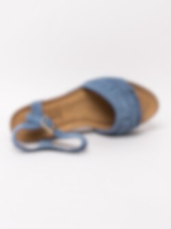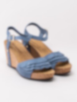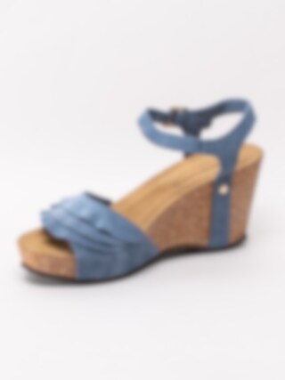 Blå sandaletter Elvira från Copenhagen Shoes i mocka. Stilrena klackskor med volangdekor vid tåparti som en snygg och subtil detalj. Dessa är inte bara snygga, utan också bekväma! Vadderad sula med en stadig kilklack och du kan gå i dessa länge. Guldfärgat spänne så du kan justera passformen. Korkklädd kilklack på ca 9 cm med platå på ca 3 cm. Brun yttersula i syntet med vågigt mönster.