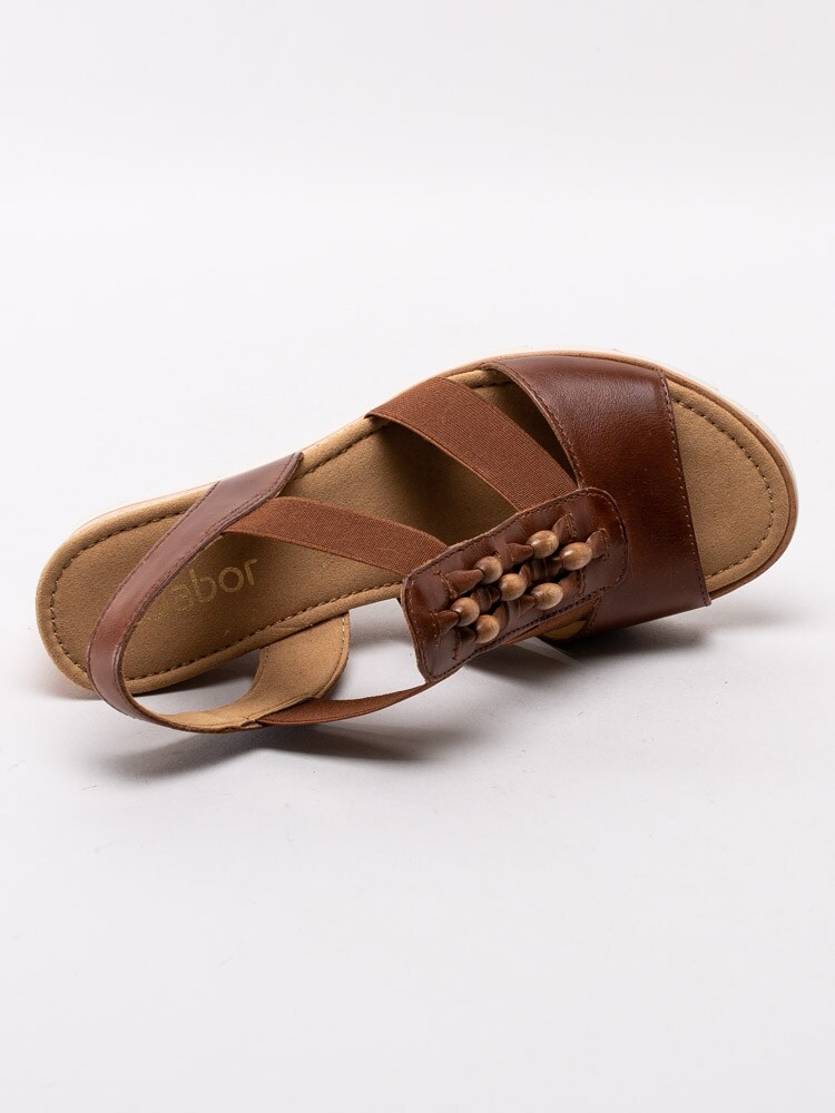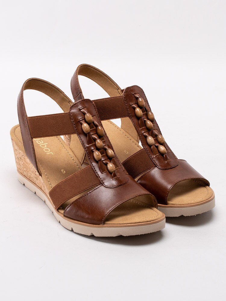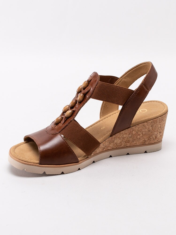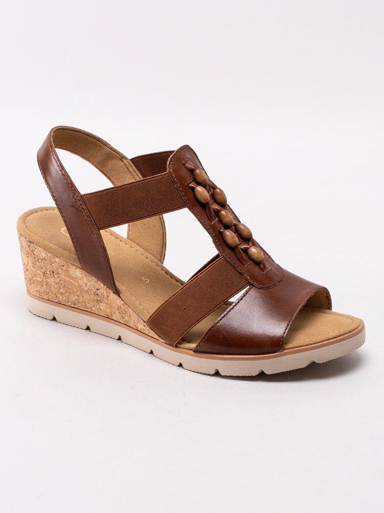 Bruna kilklackade sandaletter från Gabor i skinn med resårband. Trä på sandaletterna på fötterna genom att ta hjälp av hälremmen så kommer de enkelt och smidigt på tack vare de elastiska resårbanden. Utsmyckad T-slejf med brunmelerade pärlor som sitter fast med läderband. Foder och innersula i textil med sömlös logotyp i hälen. Korkklädd kilklack med beige yttersula i syntet.