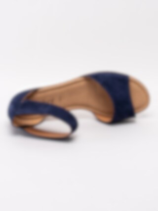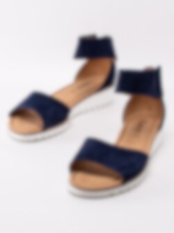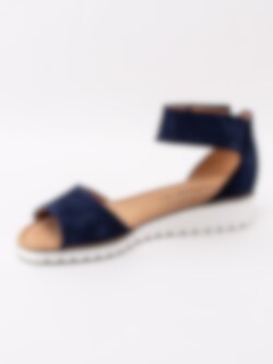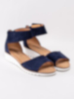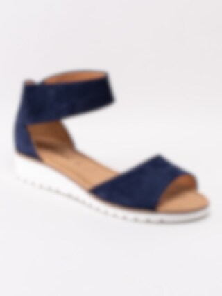 Mörkblå sandaletter från Gabor i mocka. Nätta sandaletter med låg klack för en behaglig lutning. Sommarens klassiska sandal som passar både till kjol som till byxor. Bred vristrem med kardborrefäste för enkel påtagning och individuell passform. Skinnfodrade med innersula i ett hi-tech textilmaterial som transporterar bort fukt. Brun rand längs sulkant i träimitation som detalj. Vit sula med kilklack på ca 3 cm.
