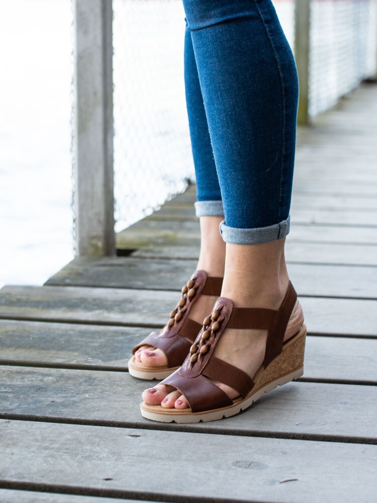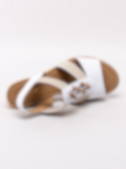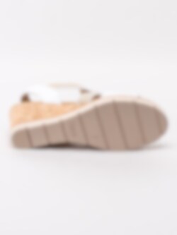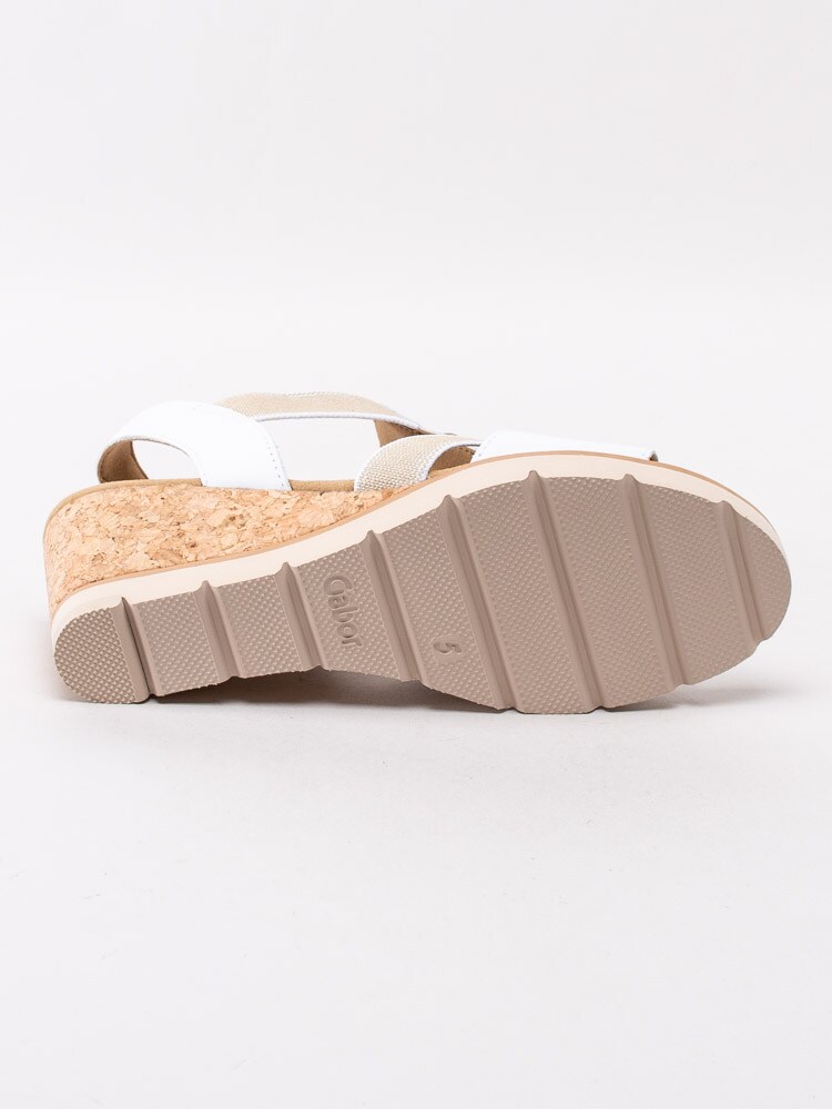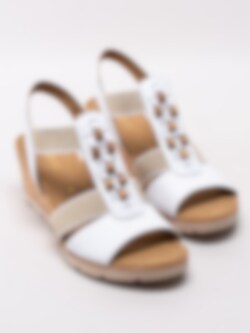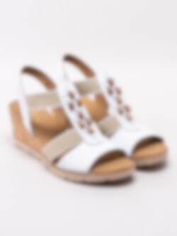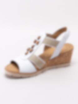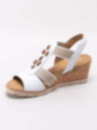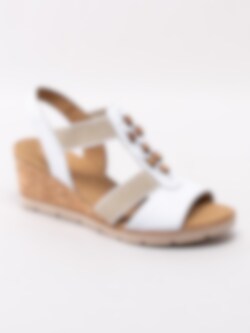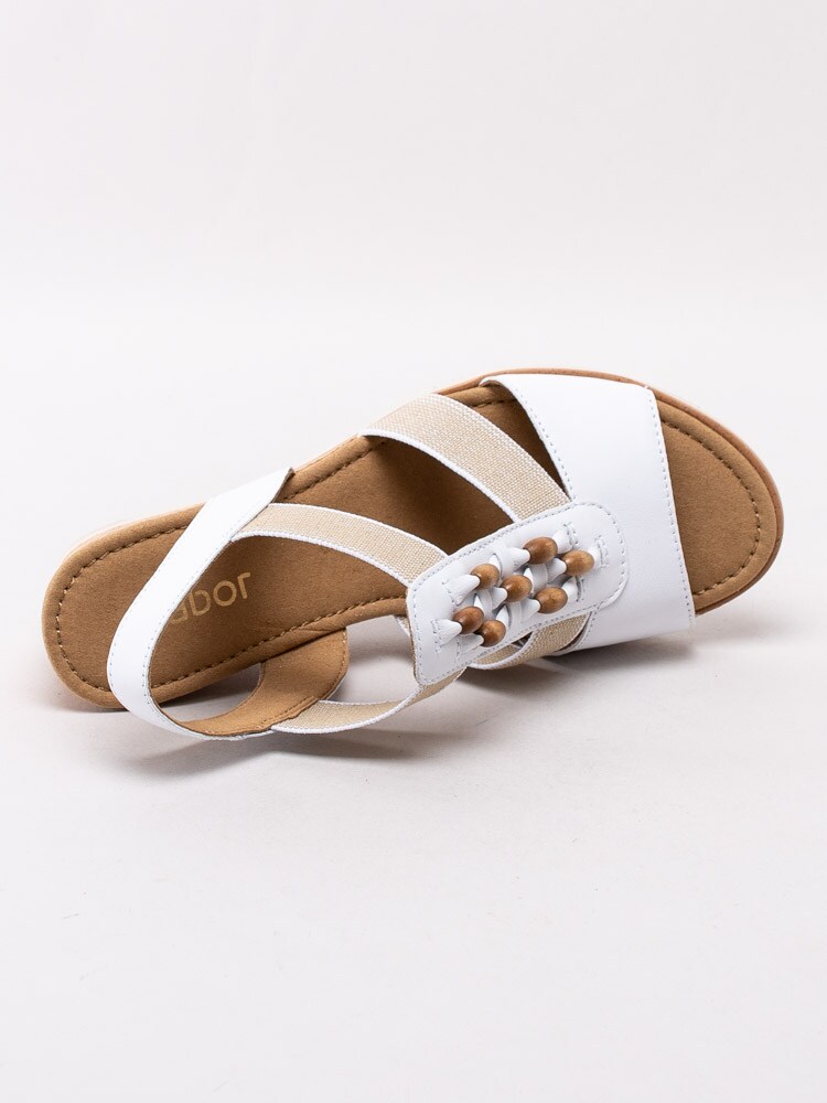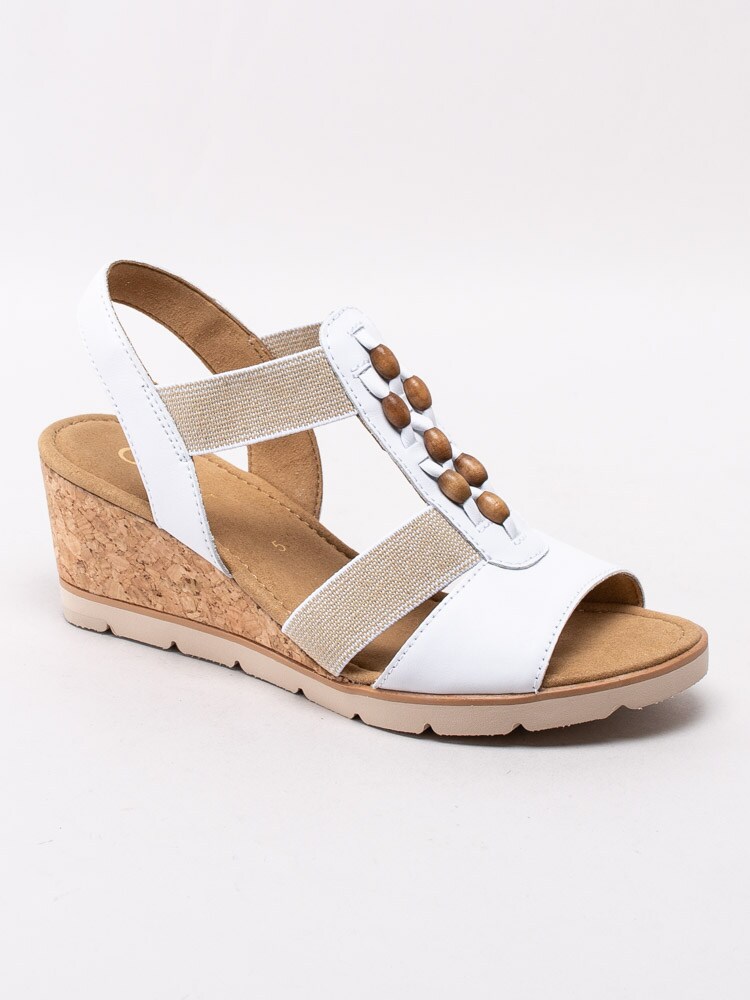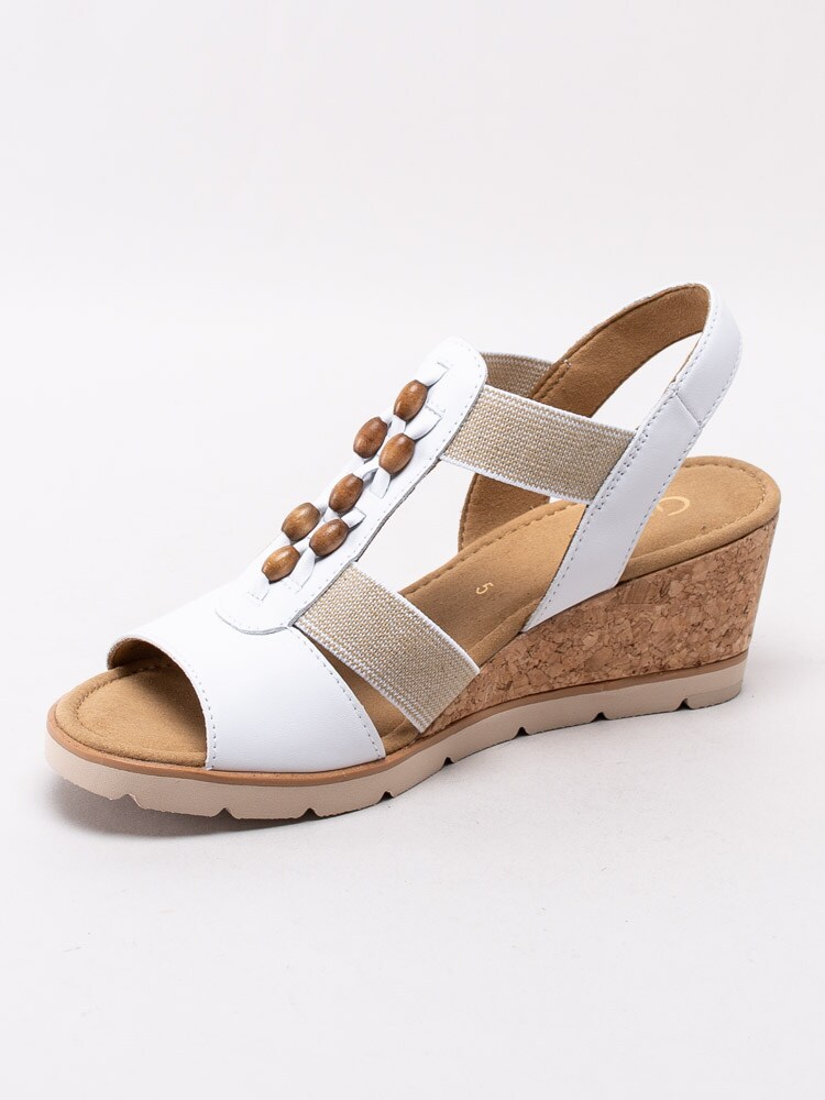 Vita kilklackade sandaletter från Gabor i skinn med resårband. Trä på sandaletterna på fötterna genom att ta hjälp av hälremmen så kommer de enkelt och smidigt på tack vare de elastiska resårbanden. Utsmyckad T-slejf med brunmelerade pärlor som sitter fast med läderband. Foder och innersula i textil med sömlös logotyp i hälen. Korkklädd kilklack med beige yttersula i syntet.