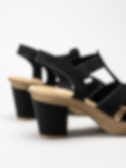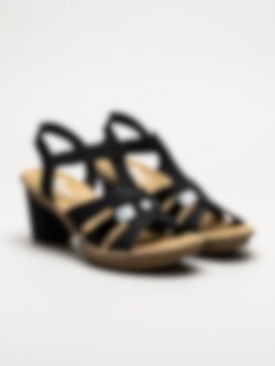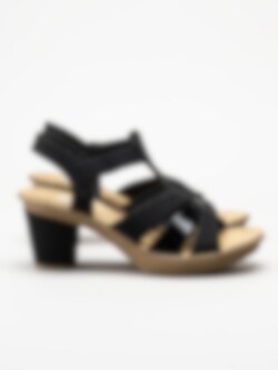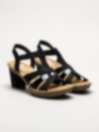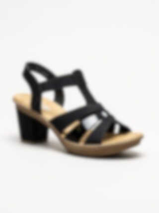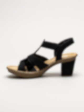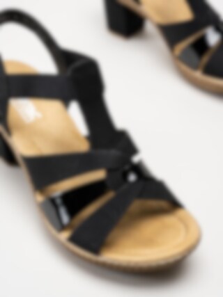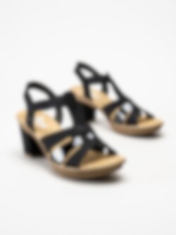 Svarta högklackade sandaletter i Black från Rieker. Dessa fina sandaletter har tre remmar över foten, varav en är i blankt lackmaterial för en elegant detalj. Med en klackhöjd på cirka 6,5 cm och en platå på ca 1,5 cm får du både höjd och stabilitet. Den vadderade innersulan med Riekers Antistress-teknologi ger extra komfort vid varje steg. Perfekta för både festliga och mer avslappnade sommartillfällen.