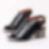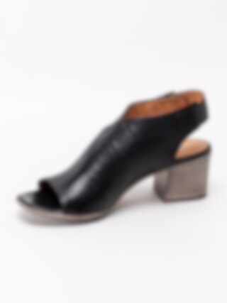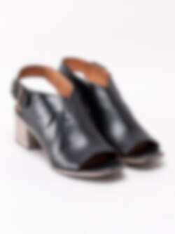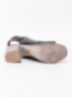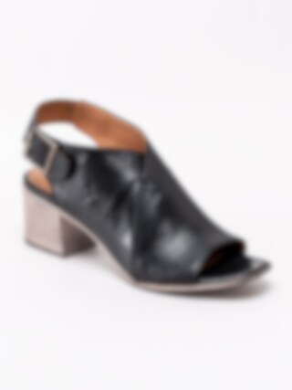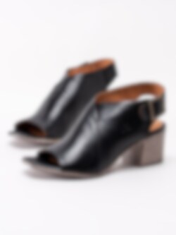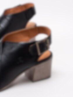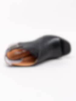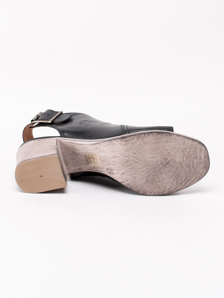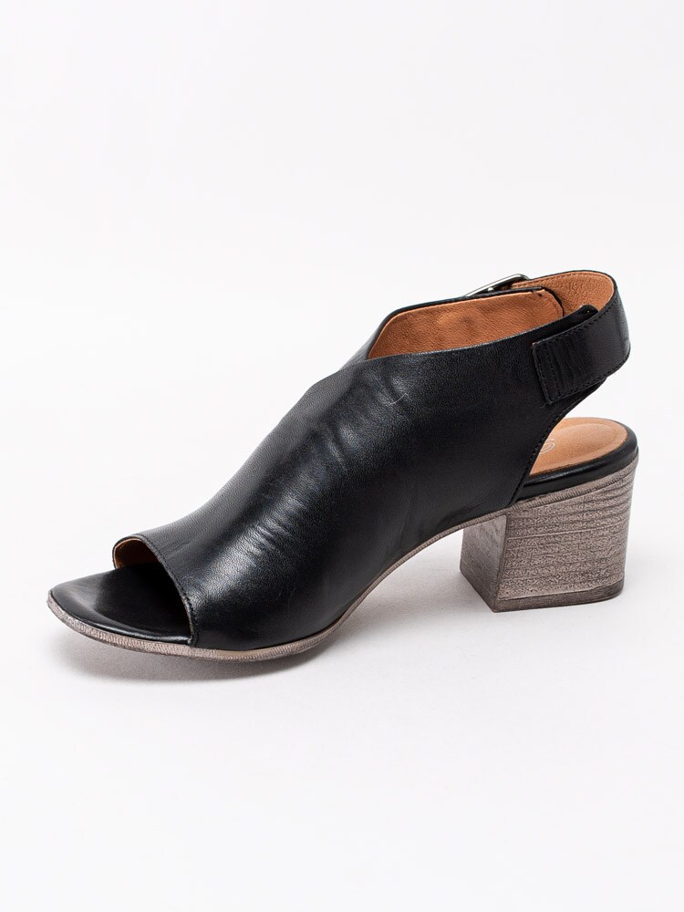 Svarta sandaletter från Rosa Negra tillverkade i skinn med korsat framparti. Präglad logga på utsidan. Svart justerbar hälrem med spänne i silver som öppning. Brunt foder och innersula i skinn med sömlös logga i silver och svart tå. Klossklack i träimitation på ca 6 cm. Beige yttersula i syntet med slät yta.