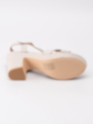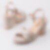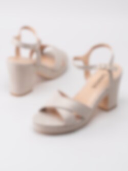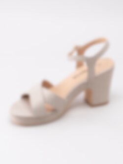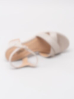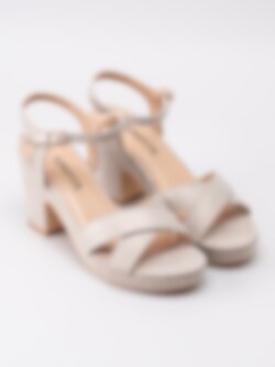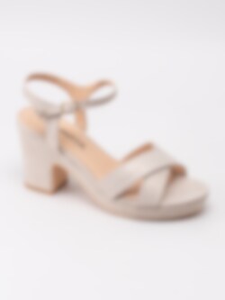Beige skimrande sandaletter från Savita tillverkade i textil. Korslagda band över framparti. Passar perfekt som fest- eller studentskor. Hälrem med juserbar rem runt vrist med spänne i guld. Beiget foder och innersula i syntet med sömlös logga. Klädd klack i textil på ca 9 cm och platå på ca 2.5 cm. Beige yttersula i syntet med slät yta.