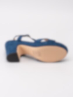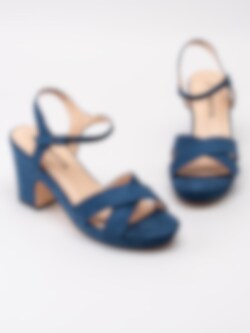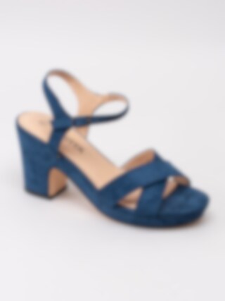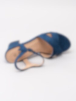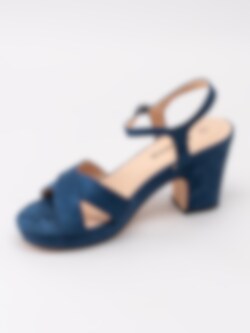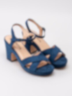 Mörkblå sandaletter från Savita tillverkad i textil. Korslagda band över framparti. Passar perfekt som fest- eller studentskor. Hälrem med juserbar rem runt vrist med spänne i guld. Beiget foder och innersula i syntet med sömlös logga. Klädd klack i textil på ca 9 cm och platå på ca 2.5 cm. Beige yttersula i syntet med slät yta och svart klack.