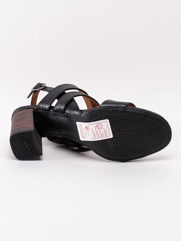 Svarta sandaletter från Tamaris i skinn med ormskinnsmönstrade remmar. Nätta sandaletter med hög klossklack i träimitation som ger skorna en retro-känsla. Låga vristband som sitter ihop med hälrem som har ett metallspänne som öppning samt för att justera till individuell passform. Sköna sandaletter med en mjuk, vadderad Touch it innersula i skinn och en Anti-Shokk klack för en bra och skön stötdämpning för varje steg. Svart yttersula med en Anti-Slide klack för att motverka halka på halt underlag.