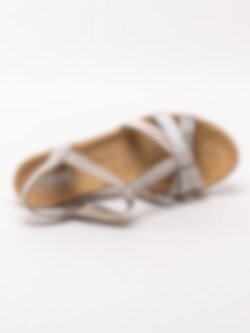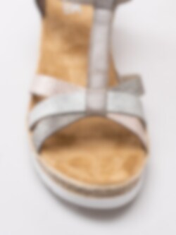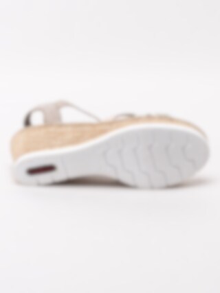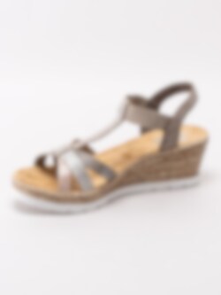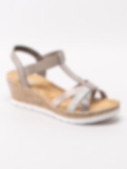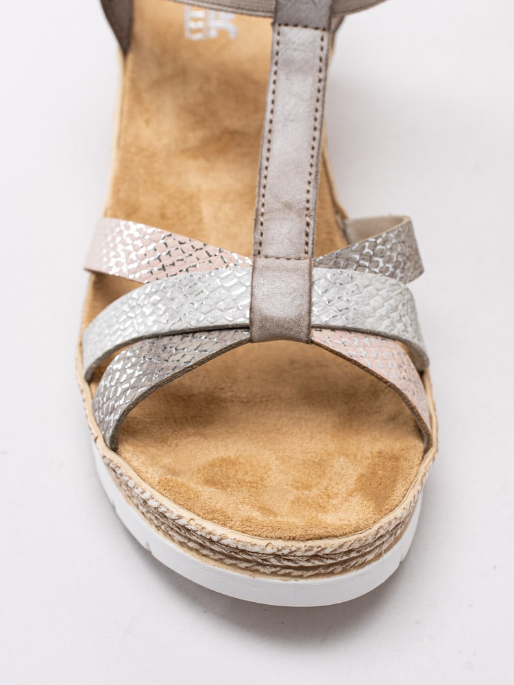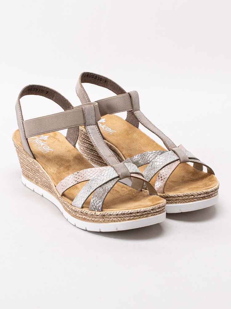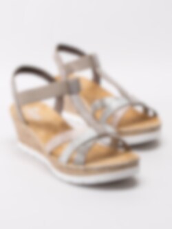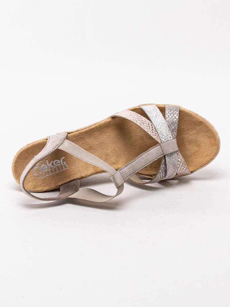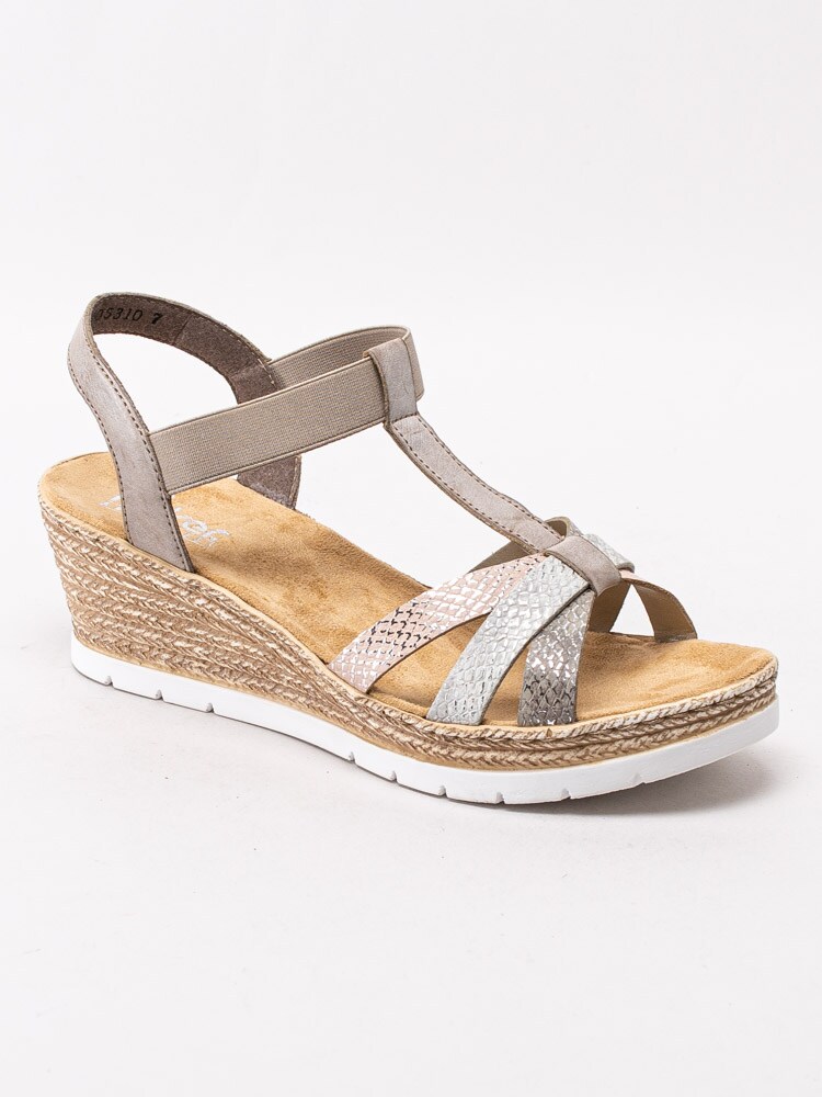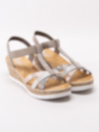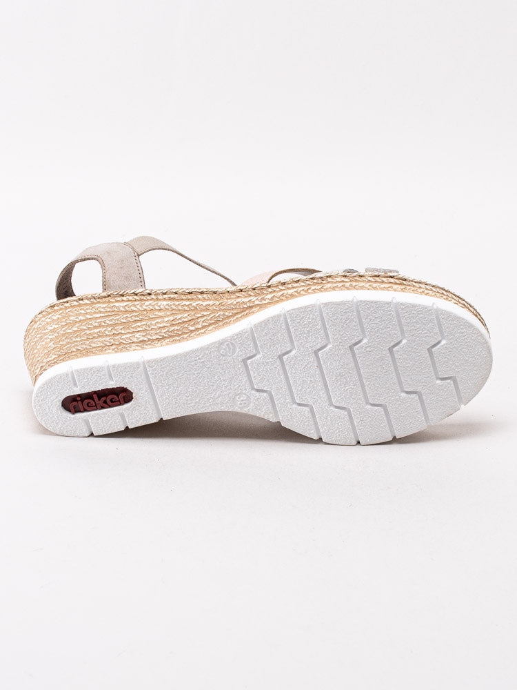Beige högklackade sandaletter från Rieker. Snygga sandaletter som passar perfekt till sommarfesten. Remmar på ovansidan av foten som korsas i metallicfärgade toner. Vristremmen är i elastisk textil för att enkelt kunna ta på skon. Skon har en mjuk innersula som följer fotens naturliga steg. Repklädd och stadig kilklack på 6 cm och platå på ca 2.5 cm. Vit yttersula med mönster i syntet.