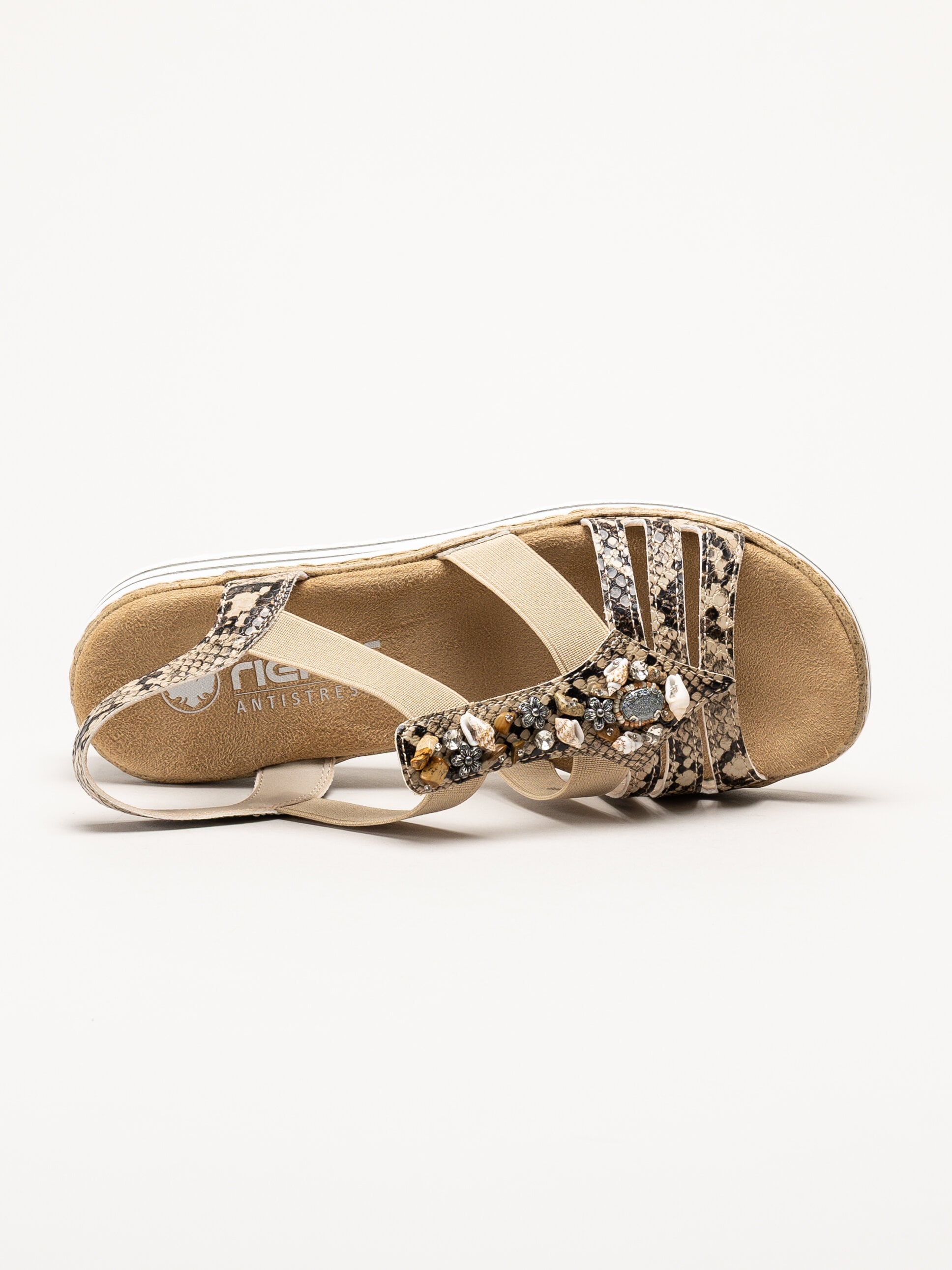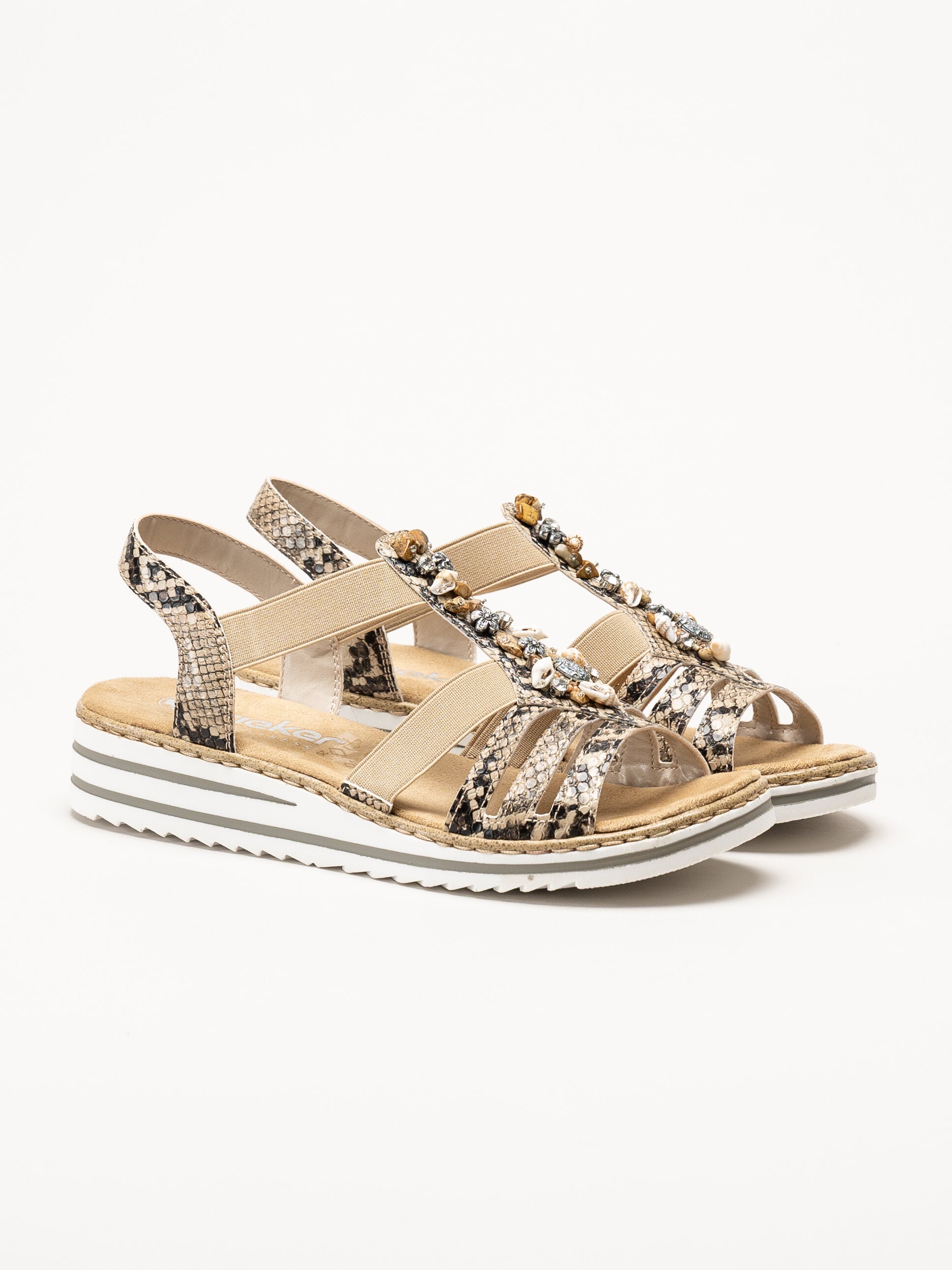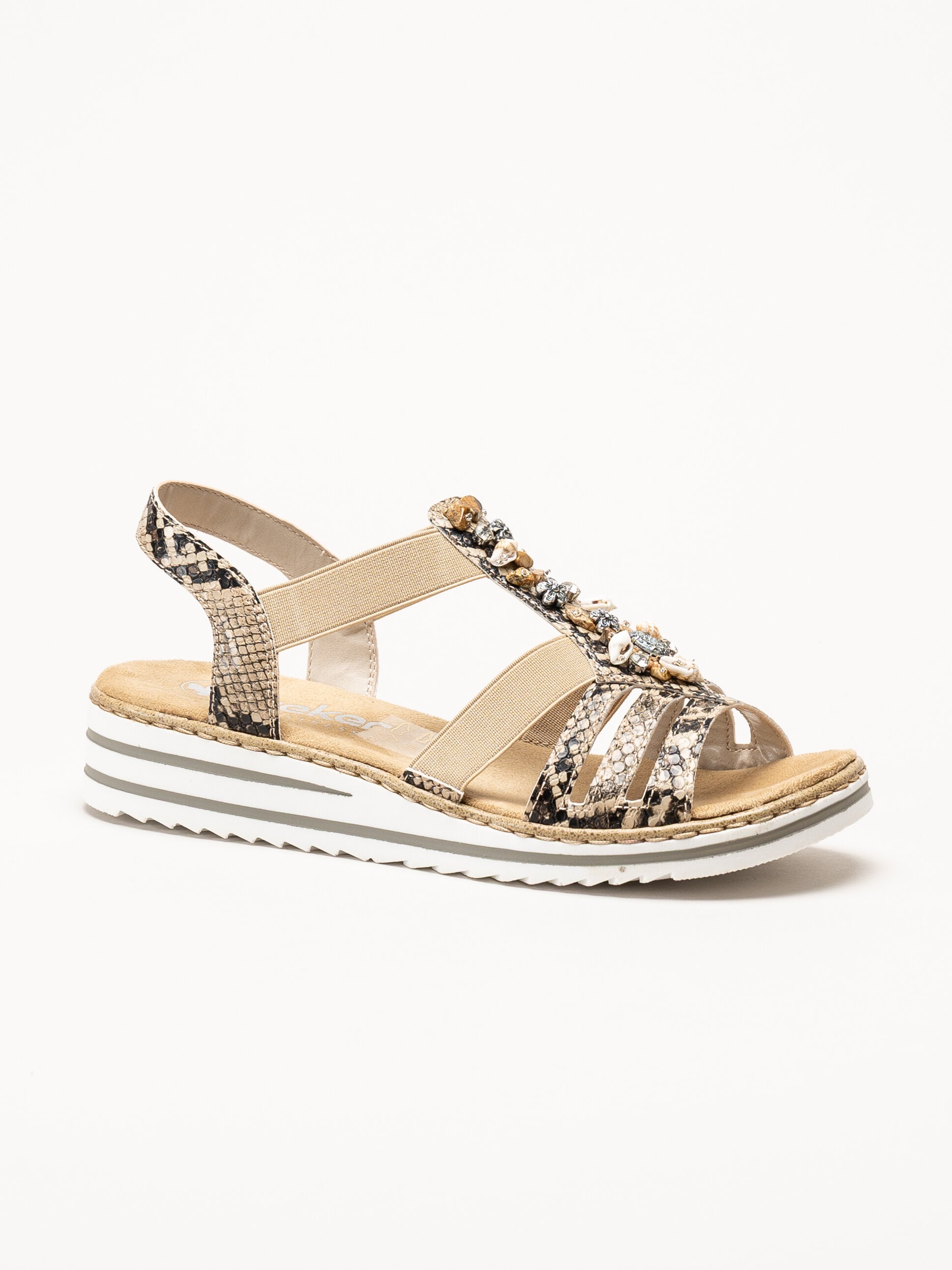 Bruna sandaletter från Rieker i färgen Natur med en elegant och dekorativ design. Ovandelen är tillverkad i en kombination av syntet och textil och har ett stilfullt ormskinnsmönster som ger ett trendigt uttryck, tillsammans med vacker pärldekor som tillför en feminin touch.