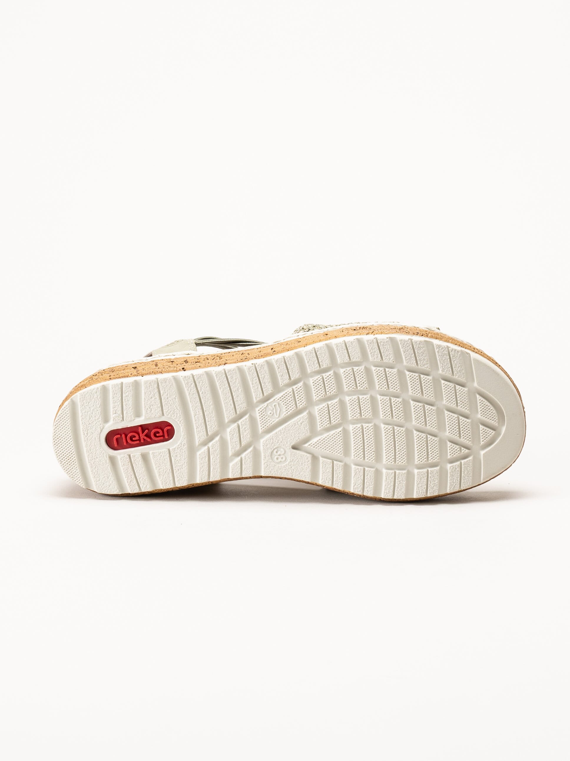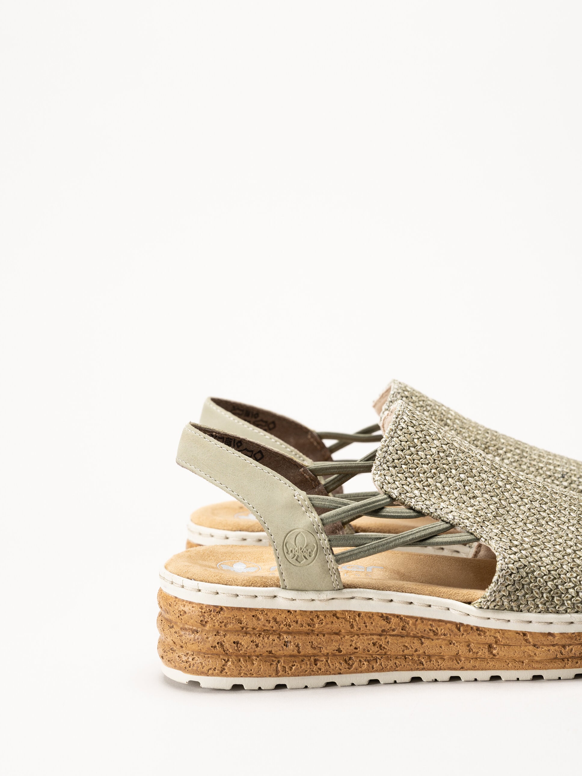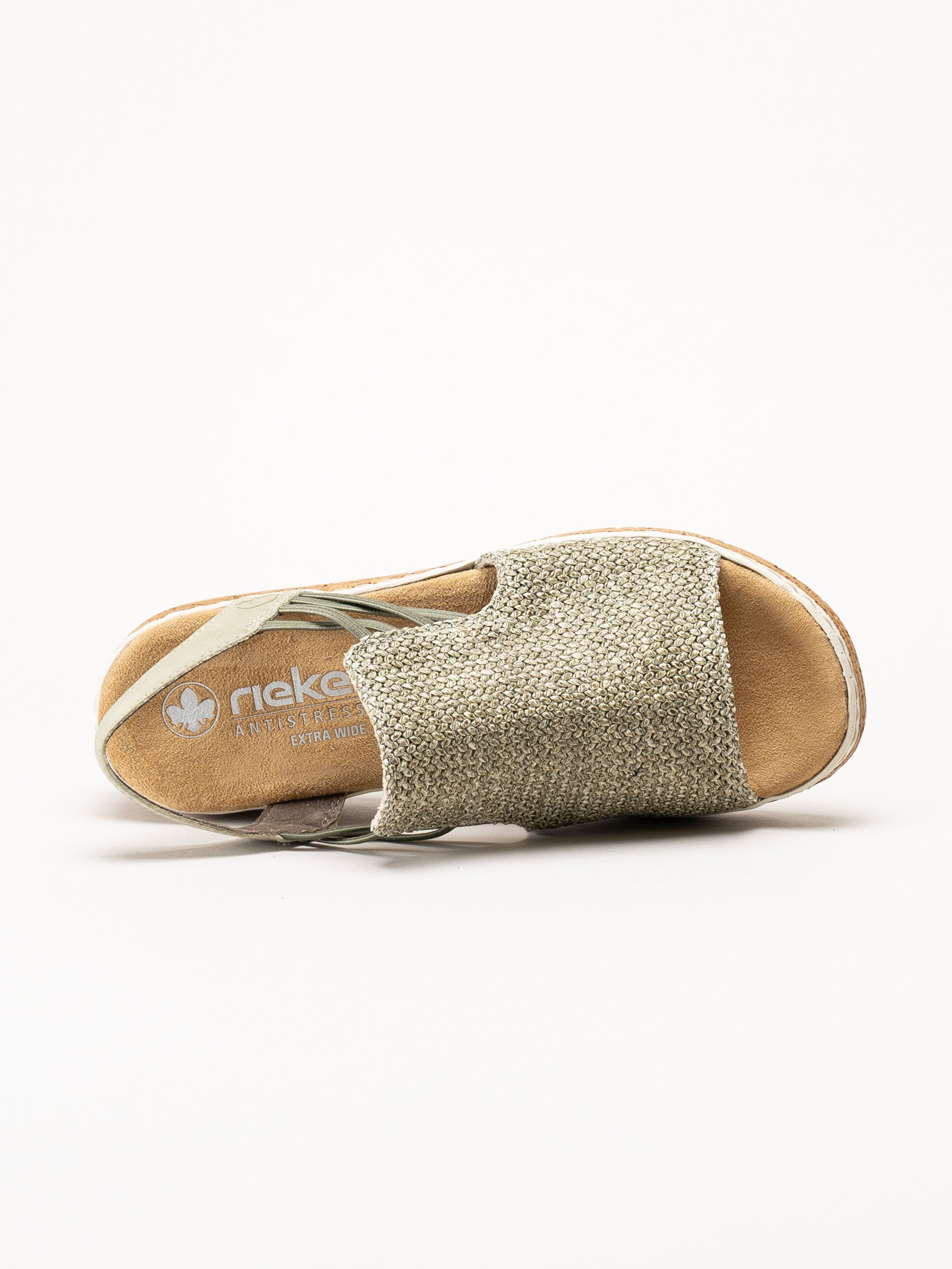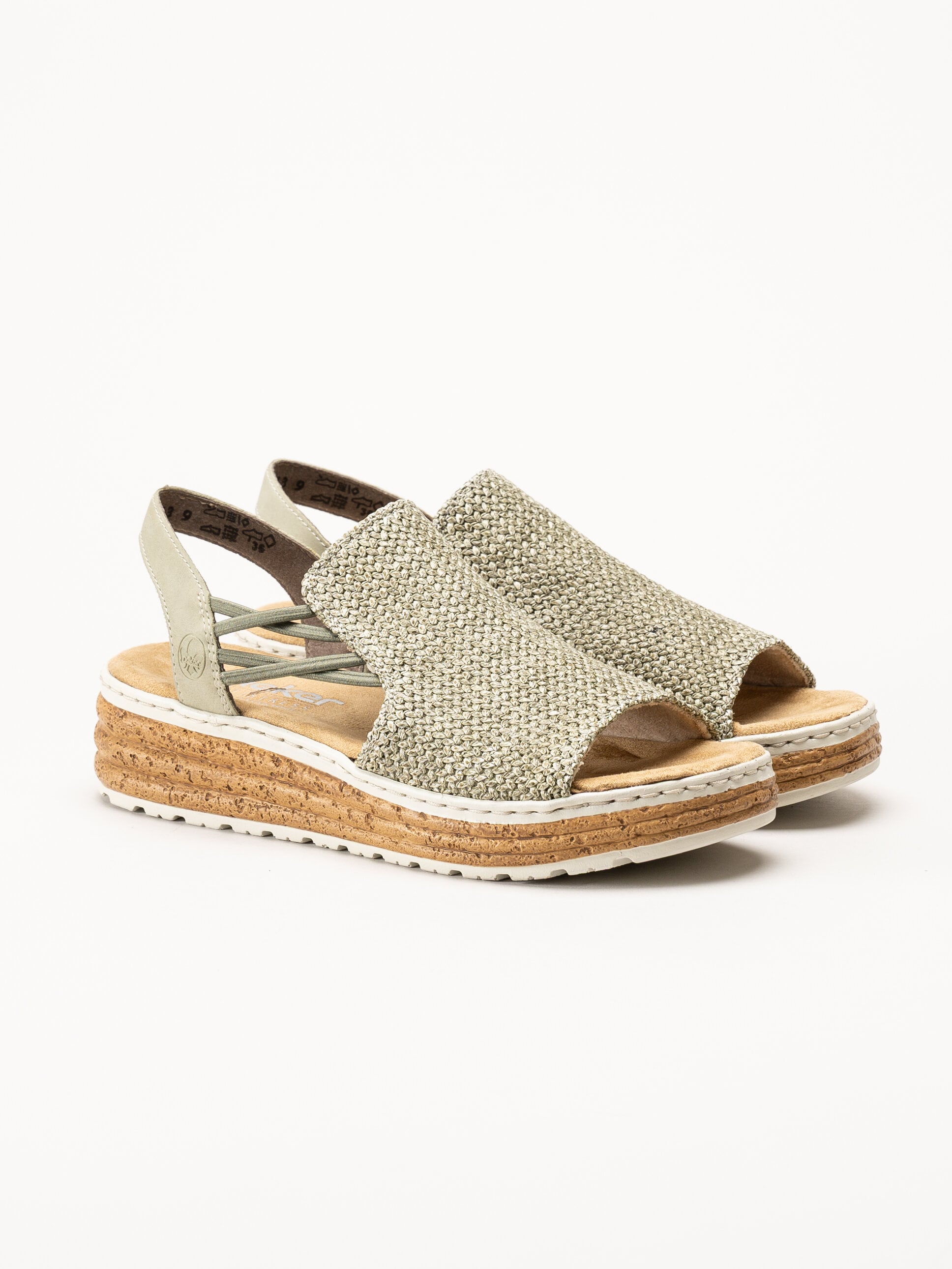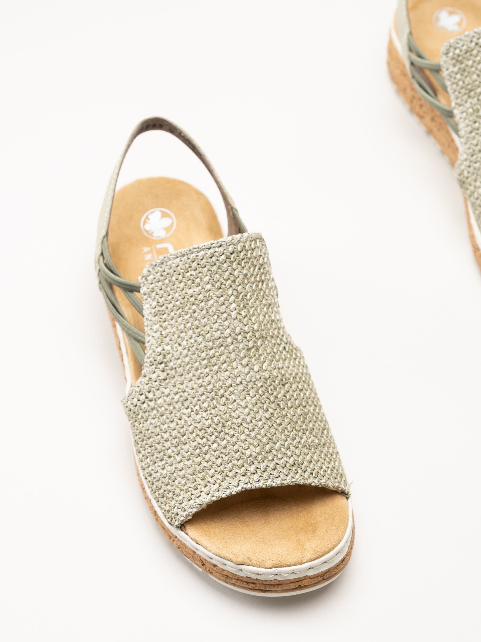 Gröna sandaletter från Rieker i färgen Schilf med en somrig och avslappnad design. Ovandelen är tillverkad i en kombination av raffia, textil och syntet som ger ett naturligt och stilfullt uttryck. Modellen har smala korslagda resårremmar på sidorna som ger en flexibel passform och gör sandalerna enkla att ta på och av. H-lästen ger extra utrymme och passar dig som önskar en bredare och bekväm passform. Den lilla kilklacken bidrar till en behaglig höjd och en stabil gång.