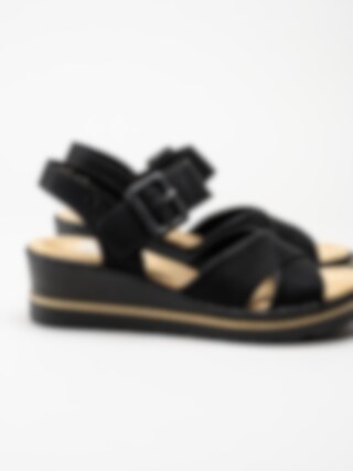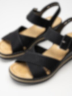 Svarta sandaletter med kryssomtag Black från Rieker. Denna svarta sandalett från Rieker kombinerar stil och komfort med ett elegant kryssomtag och en justerbar vristrem med kardborre och dekorativt spänne. Den vadderade innersulan med Riekers antistress-funktion ger optimal dämpning, medan textil- och syntetfodret skapar en mjuk känsla. Kilklacken på ca 5 cm, med en beige rand runt om, ger en snygg kontrast och en bekväm höjd. Yttersulan i syntet gör den lätt och smidig - perfekt för både vardag och fest!