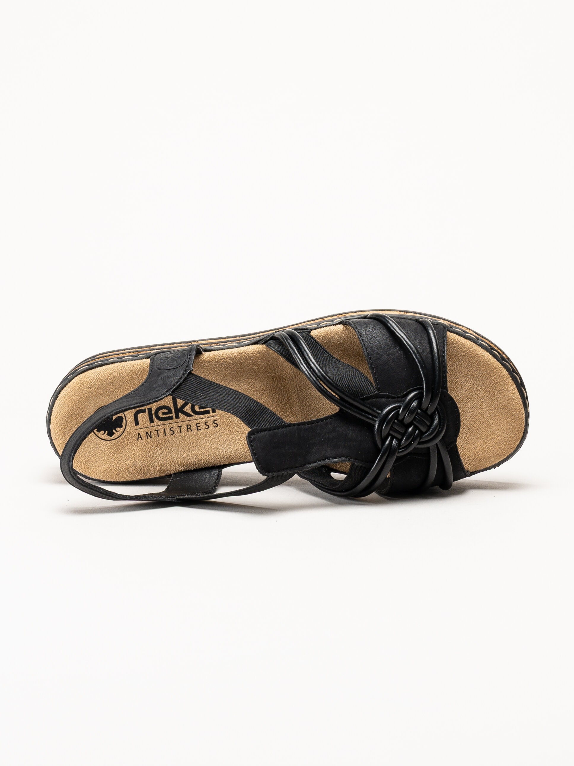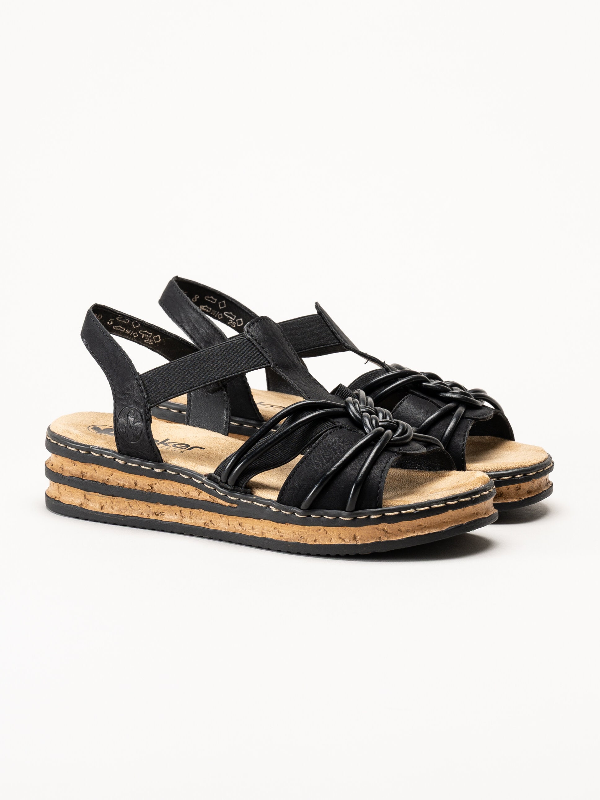 Svarta remsandaletter från Rieker med en stilren och bekväm design. Ovandelen är tillverkad i en kombination av syntet och textil och pryds av en dekorativ knut framtill som ger ett modernt och feminint uttryck. Modellen har elastiska remmar på sidorna som gör sandalerna enkla att ta på och av samt ger en flexibel och bekväm passform. Den korkliknande sulan tillsammans med den lilla kilklacken bidrar till en naturlig look, en bekväm höjd och en stabil gång.