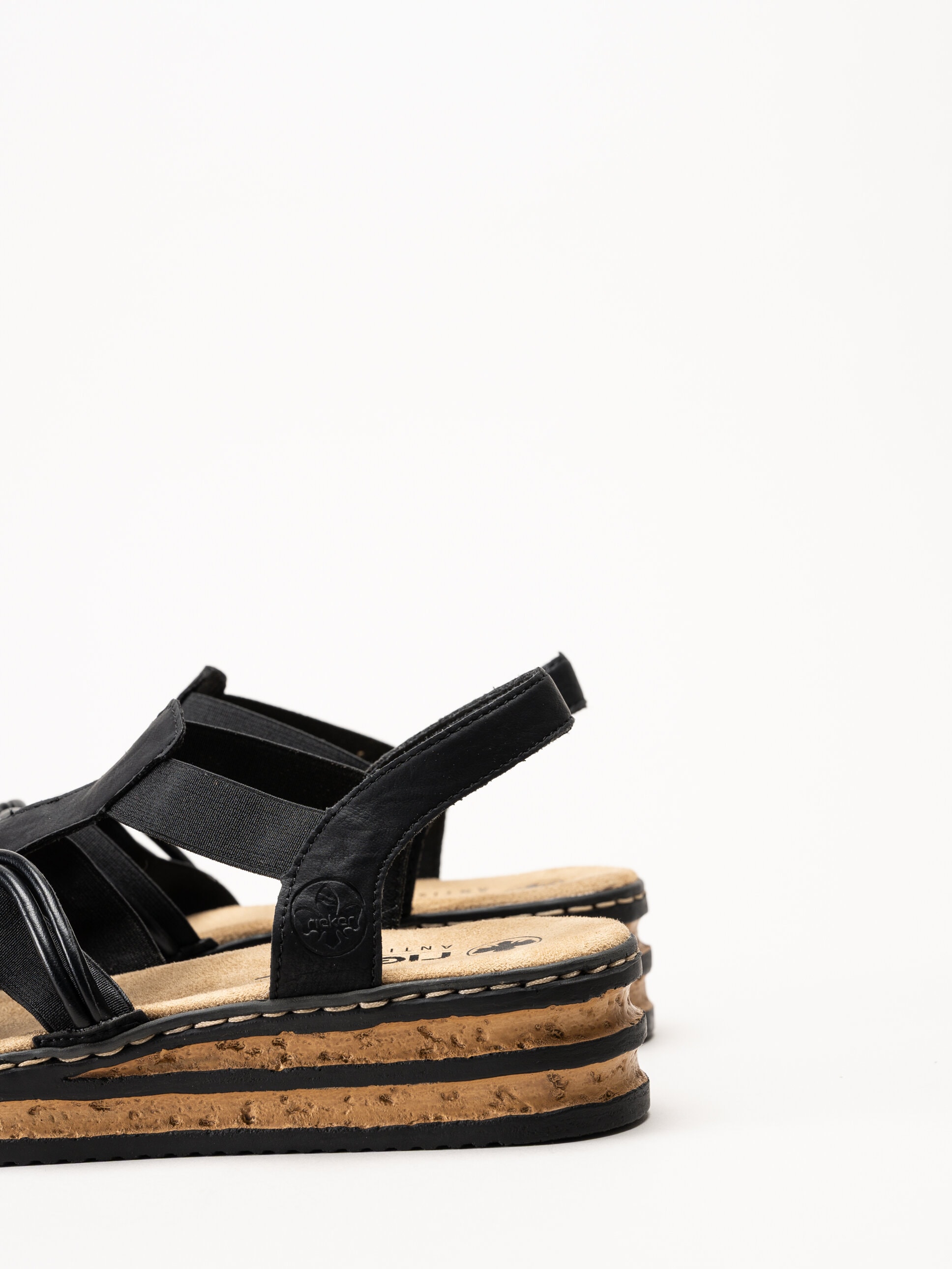 Invändigt är sandalen fodrad med syntet, och innersulan i textil med Riekers Antistress-teknologi ger mjuk dämpning och hög komfort under hela dagen.