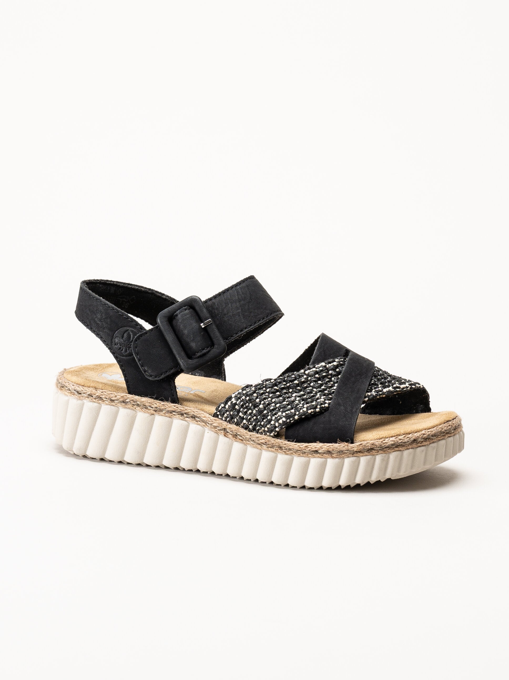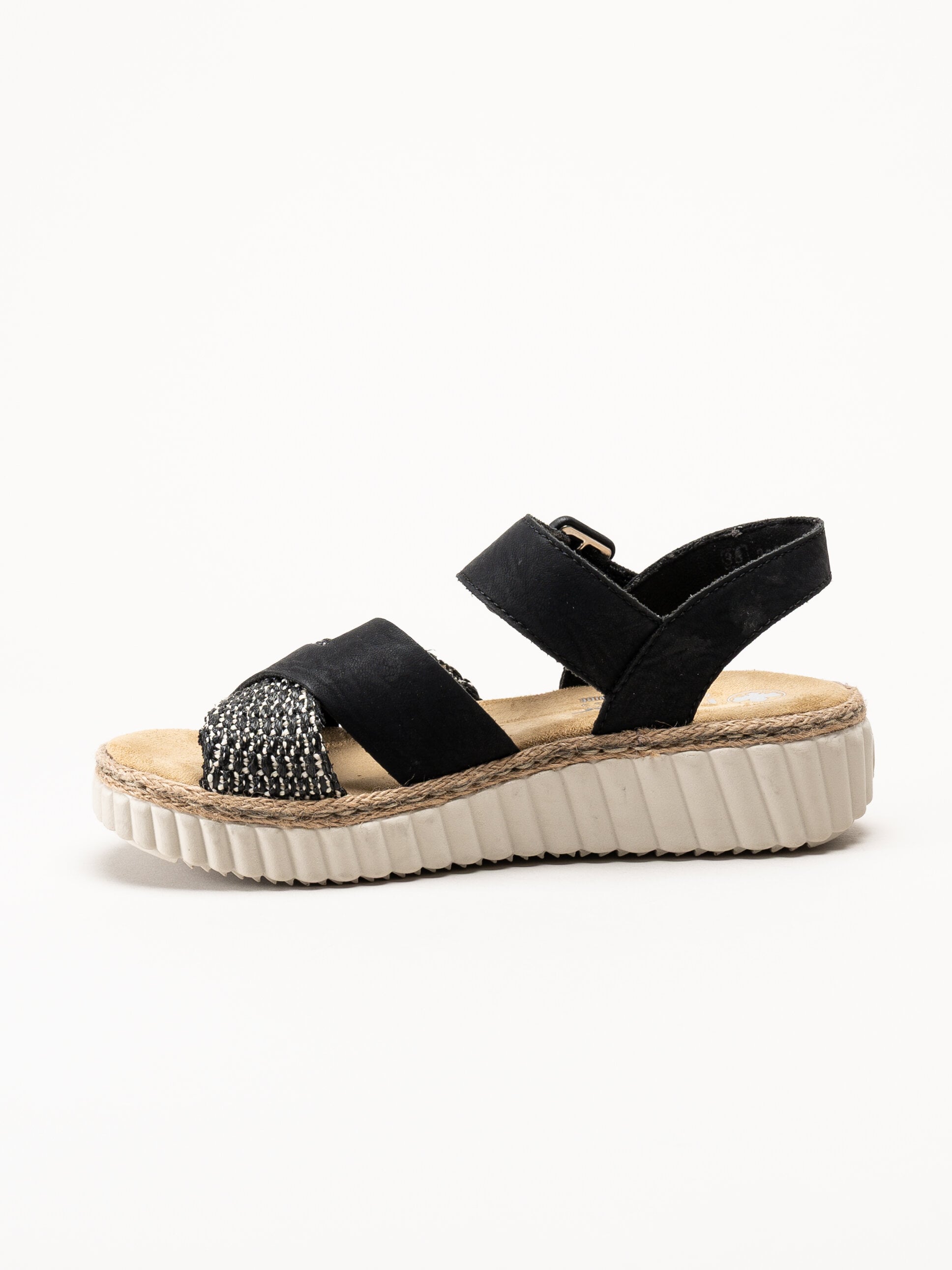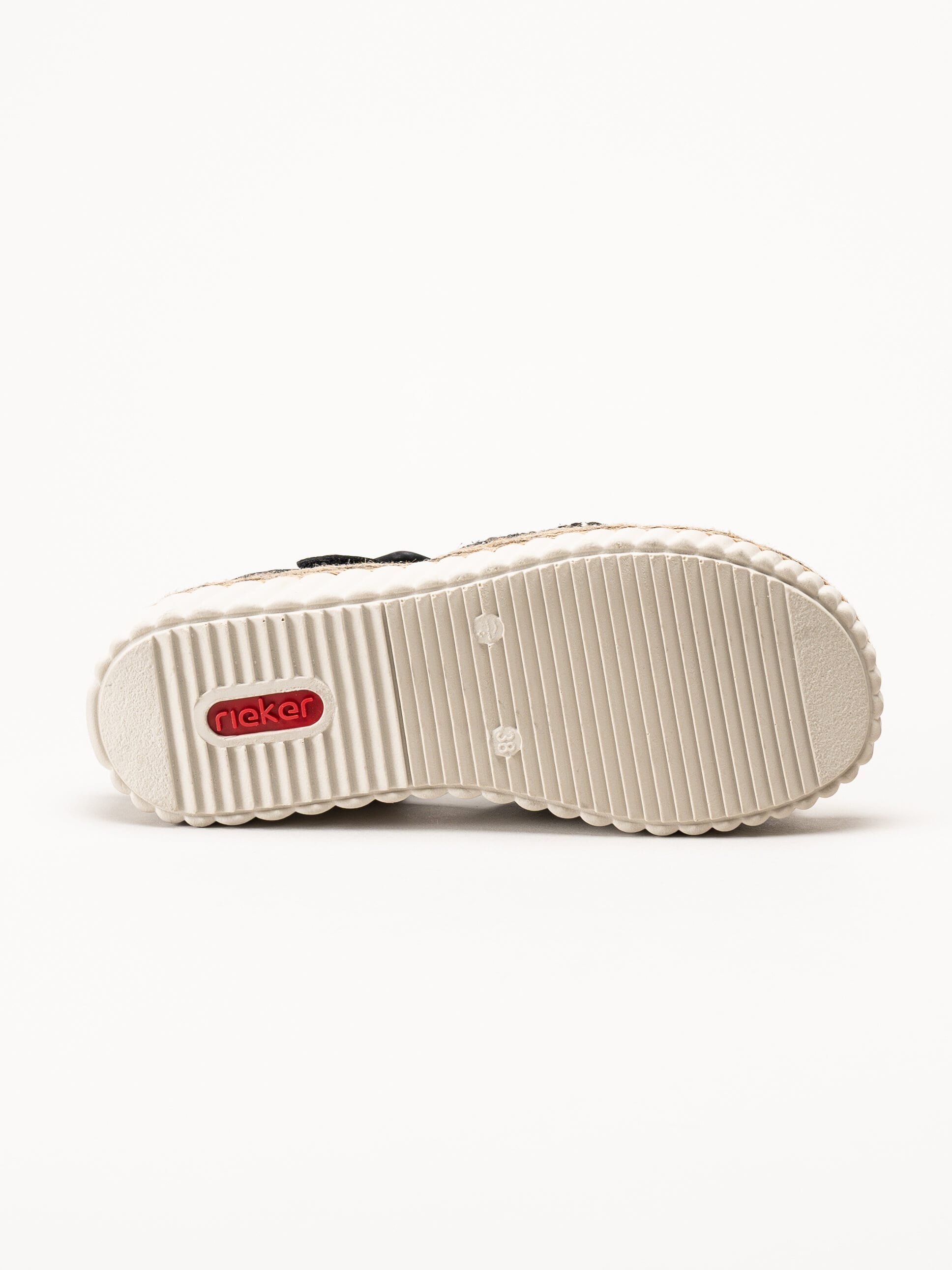 Svarta sandaler från Rieker med en stilren och bekväm design. Ovandelen är tillverkad i en kombination av syntet och raffia, där raffiadetaljen har ett stickat uttryck som ger en naturlig och trendig look. Modellen har en rem över vristen med kardborreöppning och dekorativt spänne som gör det enkelt att justera passformen efter foten. H-lästen ger extra utrymme och passar dig som önskar en bredare passform. Den lilla kilklacken bidrar till en bekväm höjd och stabil gång.