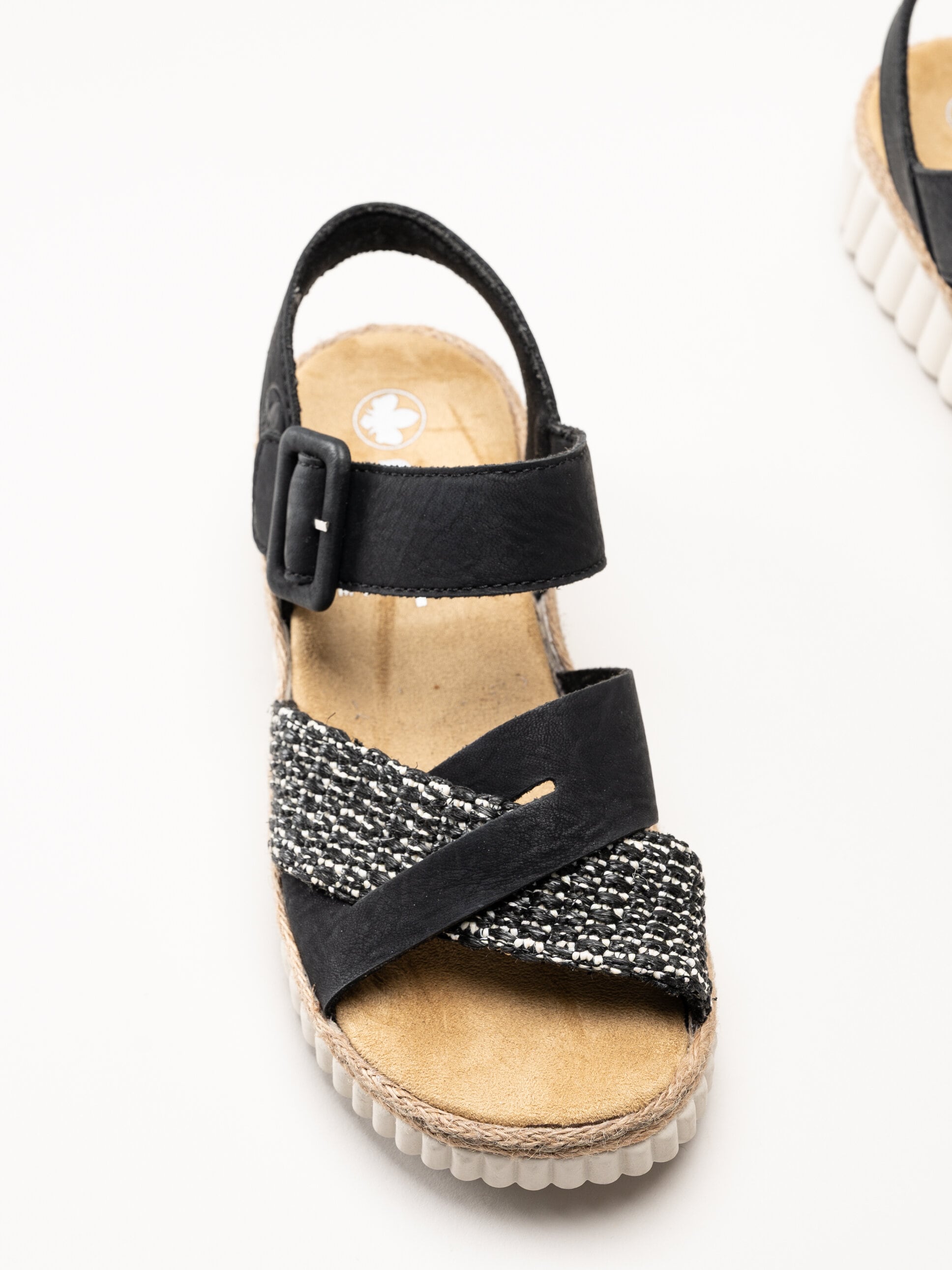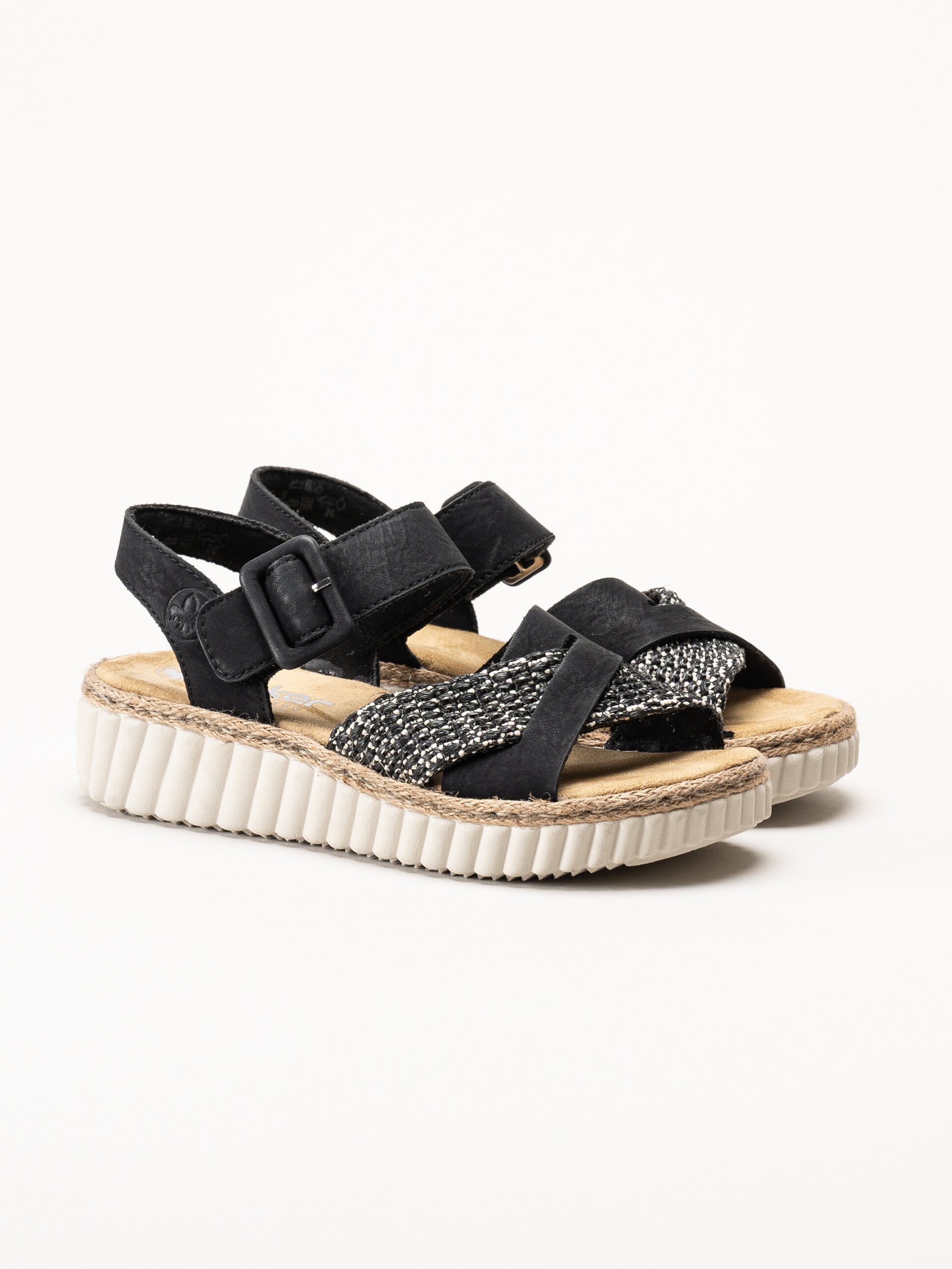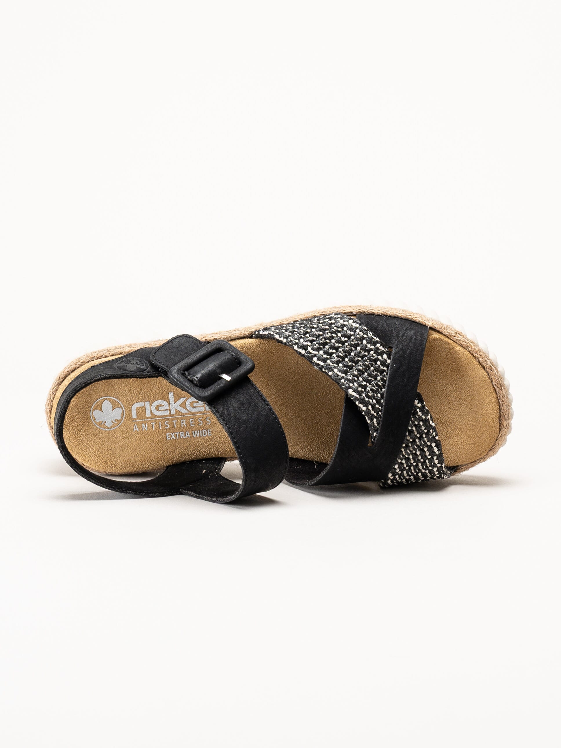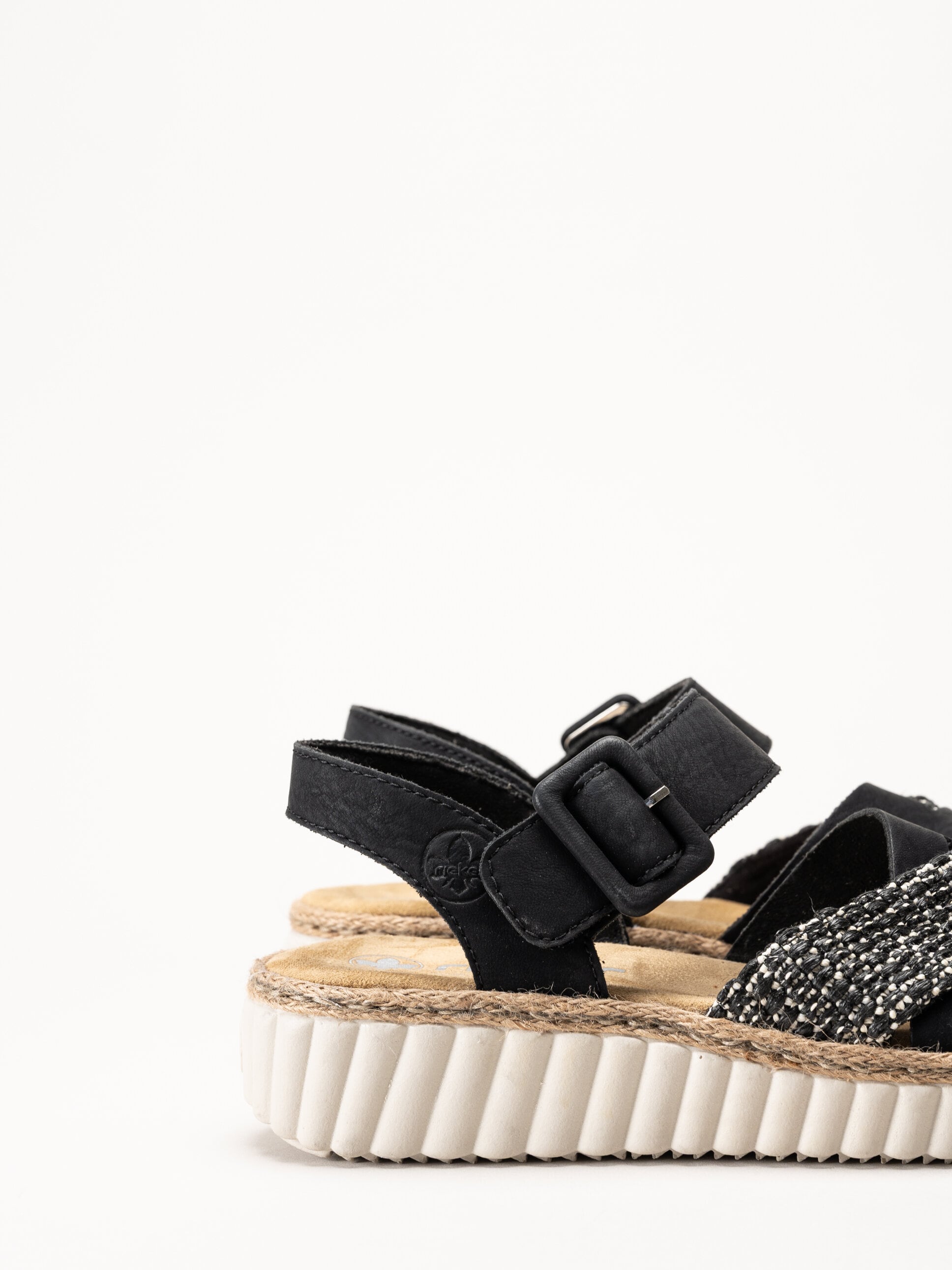 Svarta sandaler från Rieker med en stilren och bekväm design. Ovandelen är tillverkad i en kombination av syntet och raffia, där raffiadetaljen har ett stickat uttryck som ger en naturlig och trendig look. Modellen har en rem över vristen med kardborreöppning och dekorativt spänne som gör det enkelt att justera passformen efter foten. H-lästen ger extra utrymme och passar dig som önskar en bredare passform. Den lilla kilklacken bidrar till en bekväm höjd och stabil gång.