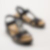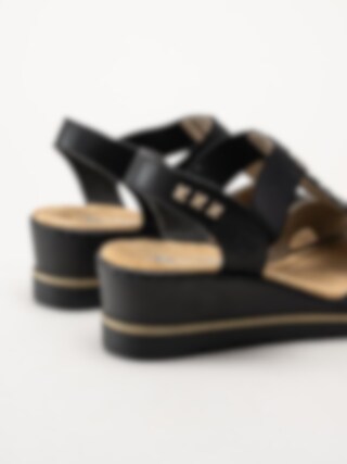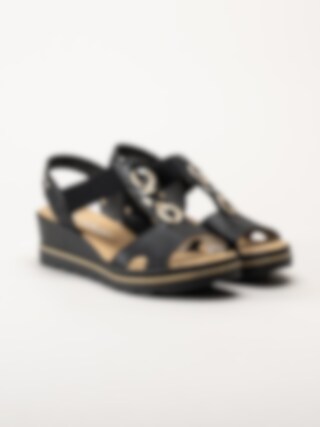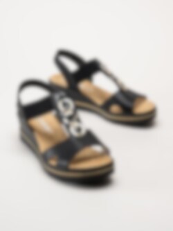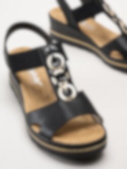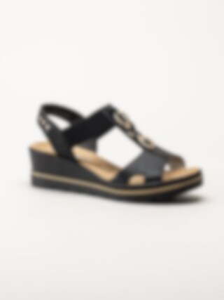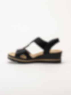 Svarta sandaletter med kilklack Black från Rieker. Denna fina Rieker sandalett har en vackert dekorerad T-slejf i syntet och resår på båda sidor för enkel av- och påtagning. Den mjuka innersulan i textil med Anti-Stress-funktion ger skön komfort hela dagen, medan den stilrena kilklacken ger en bekväm höjd och en smidig känsla i steget. Perfekt kombination av stil och bekvämlighet!