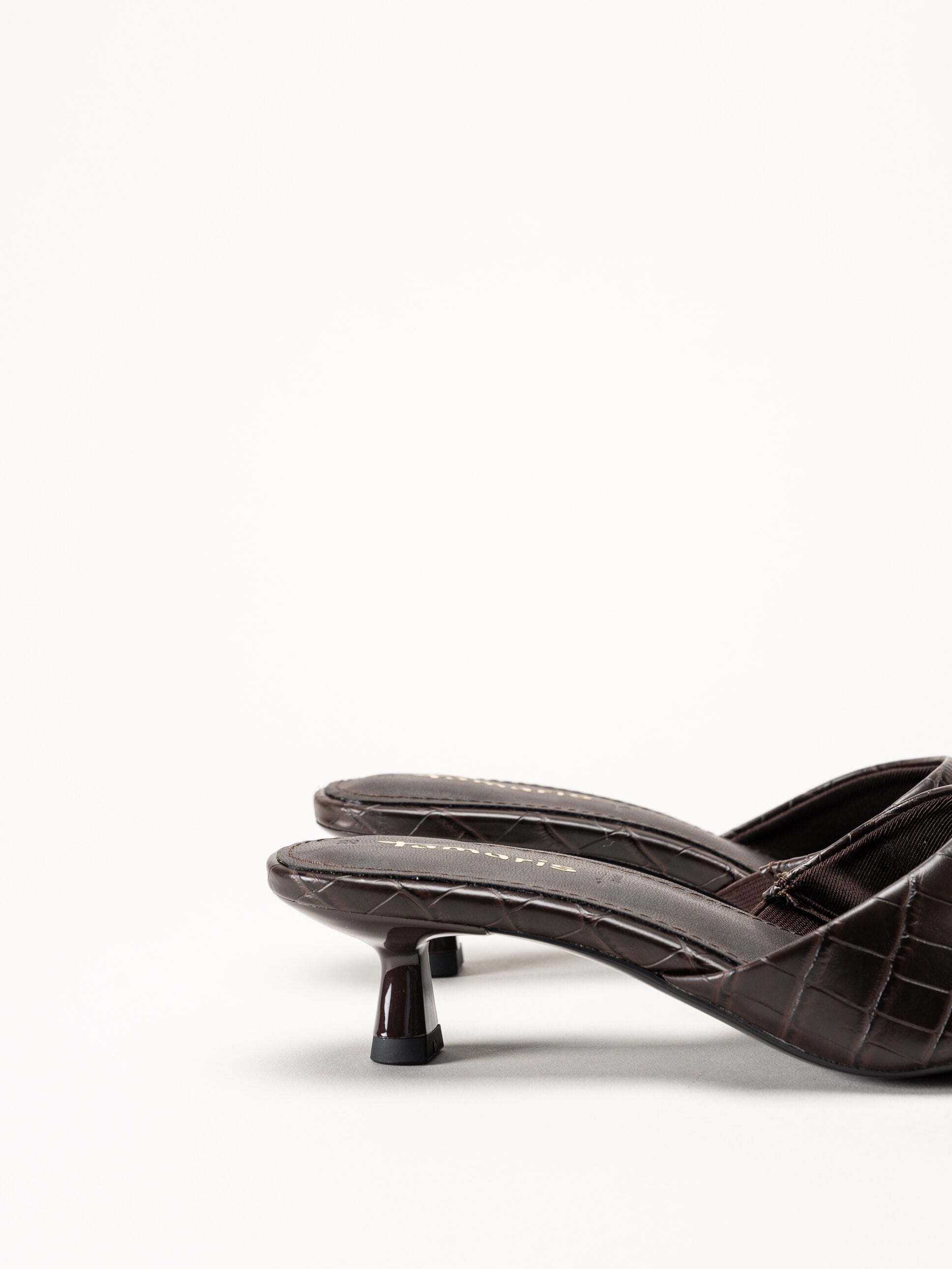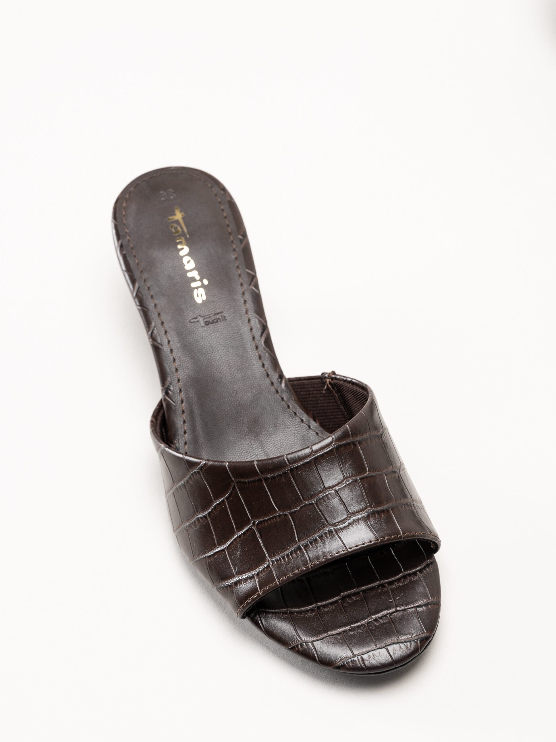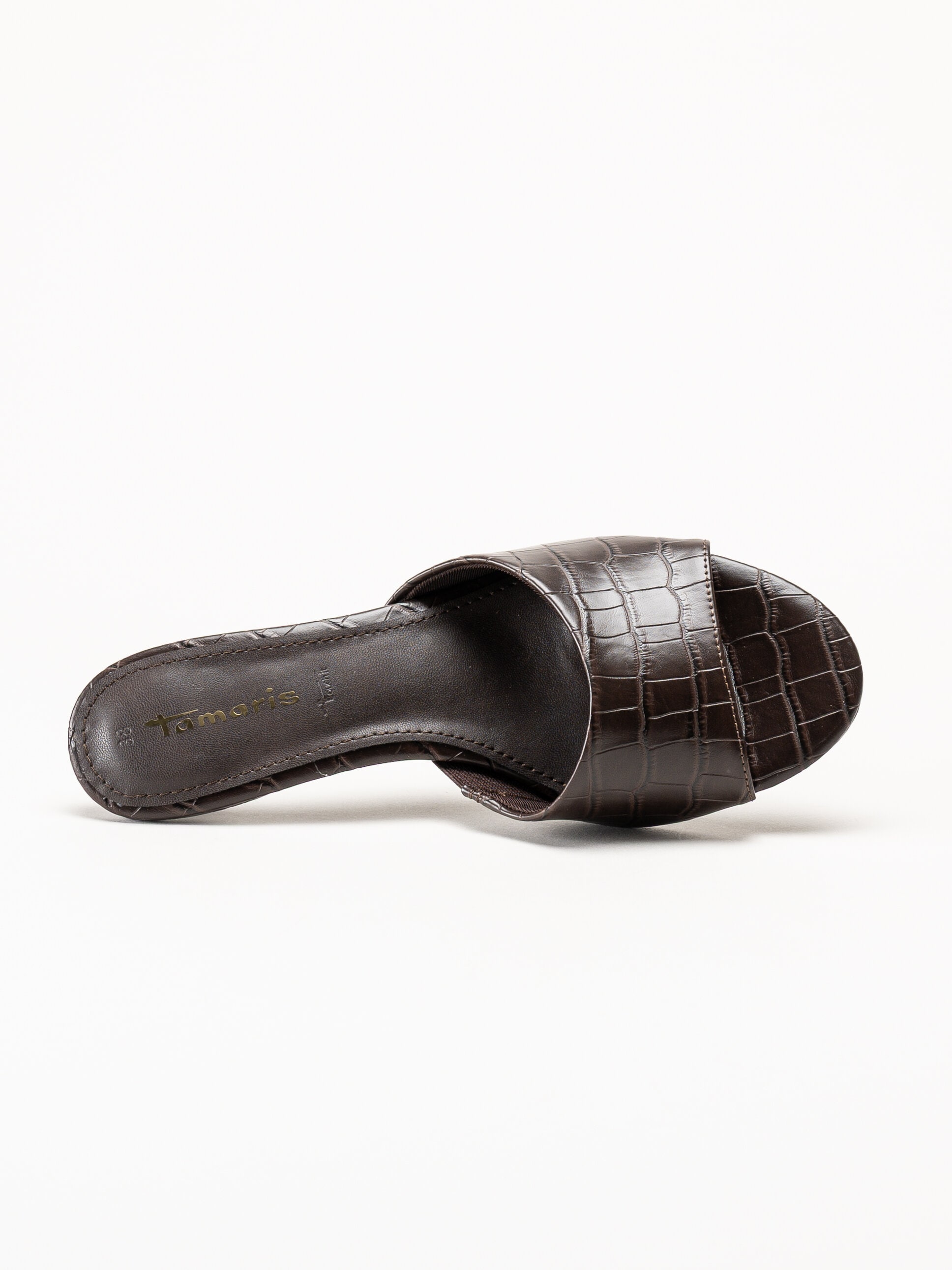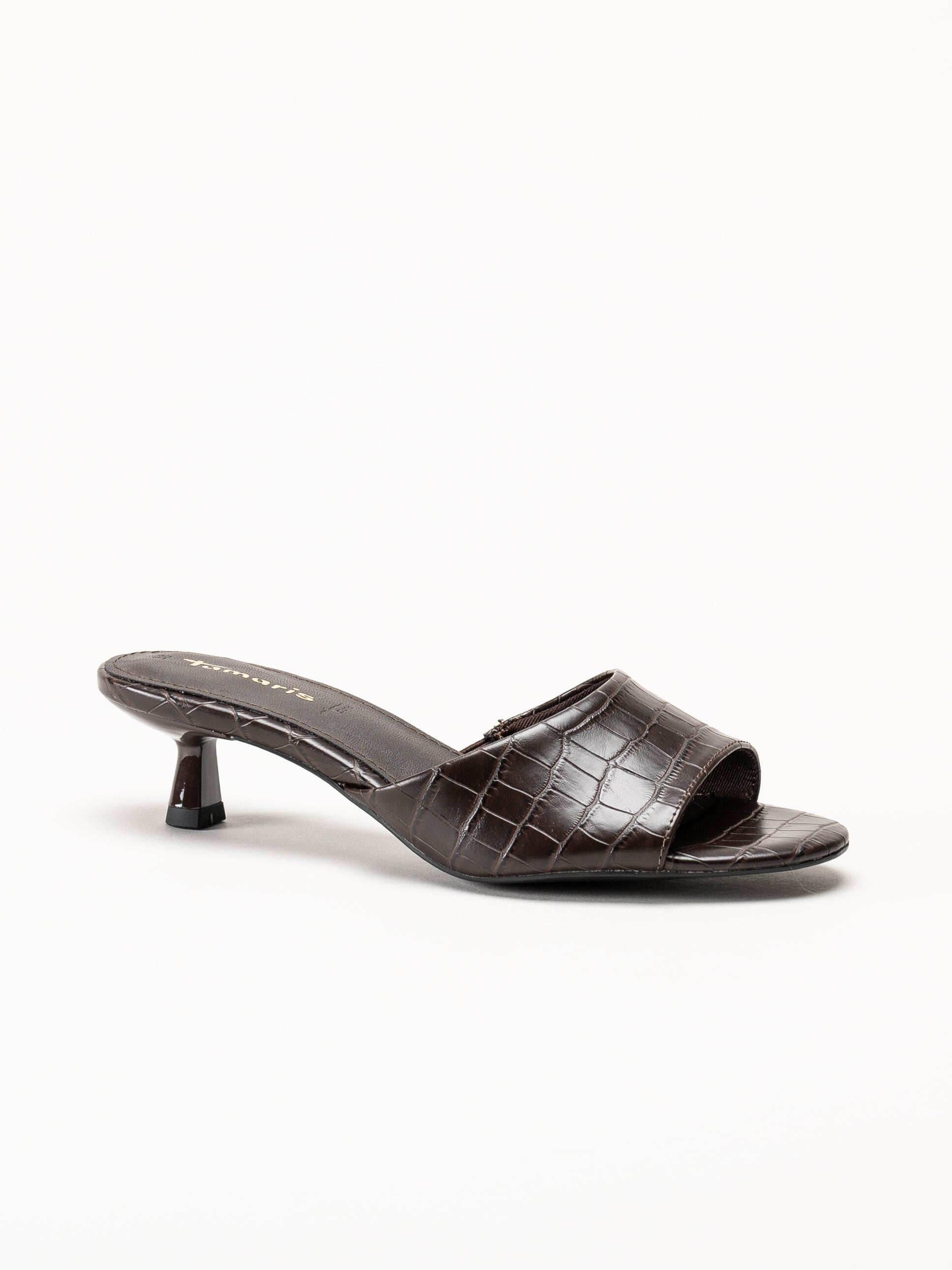 Mörkbruna mules från Tamaris i färgen Mocca Croco med en elegant och trendig design. Ovandelen är tillverkad i skinnimitation med ett dekorativt krokodilmönster som ger ett stilfullt och modernt uttryck. Den öppna slip-in modellen gör skorna enkla att ta på och av, och den lilla klacken ger en bekväm höjd samt ett feminint intryck.