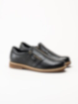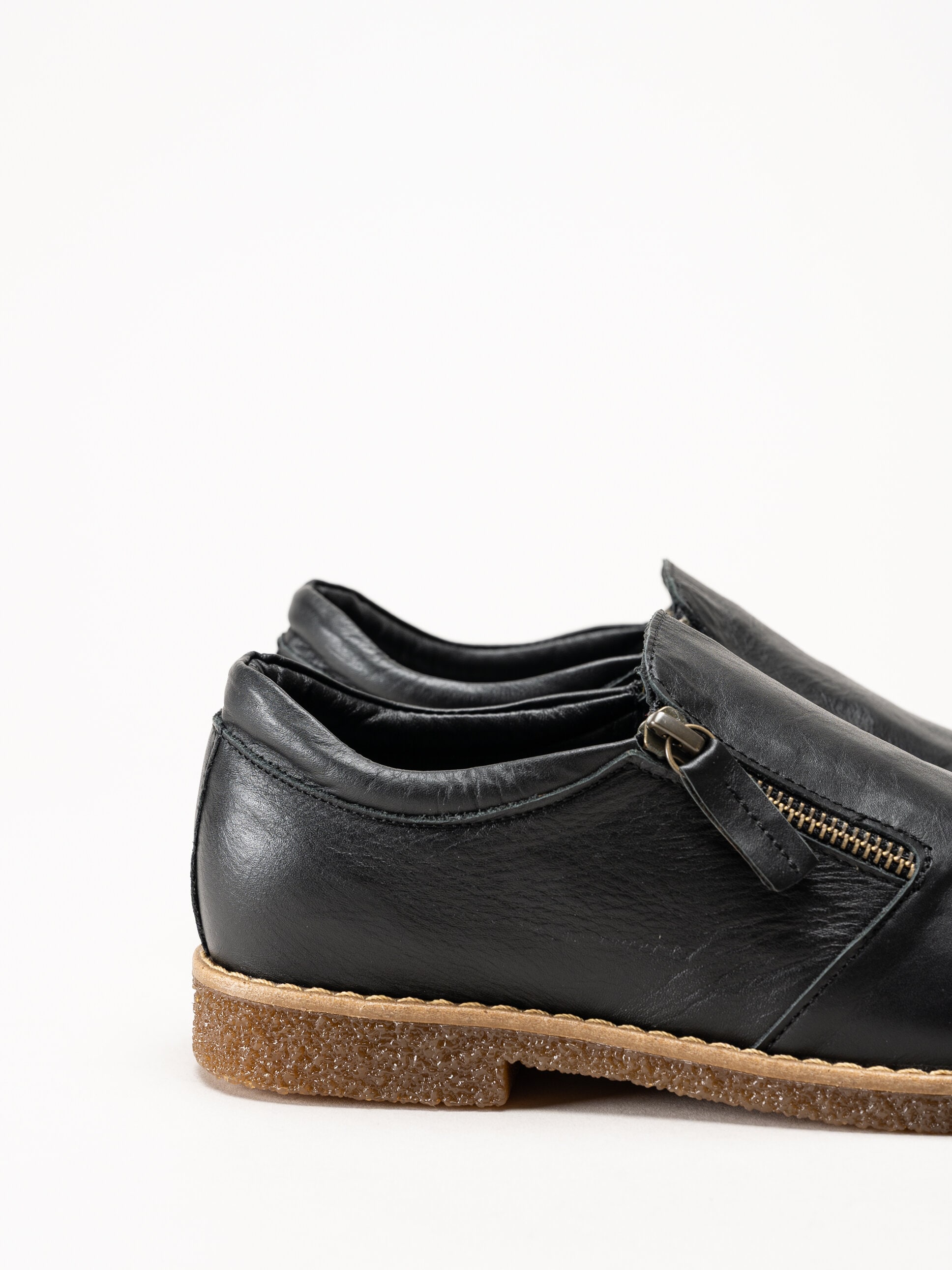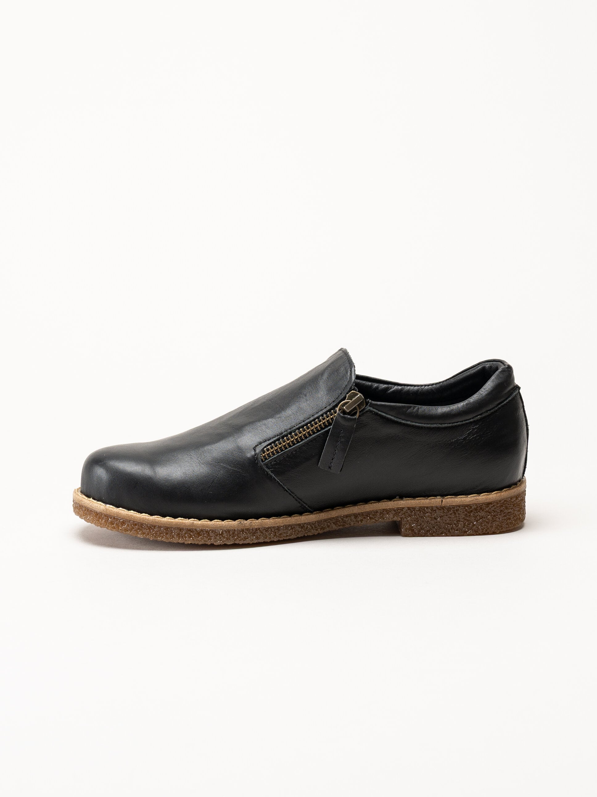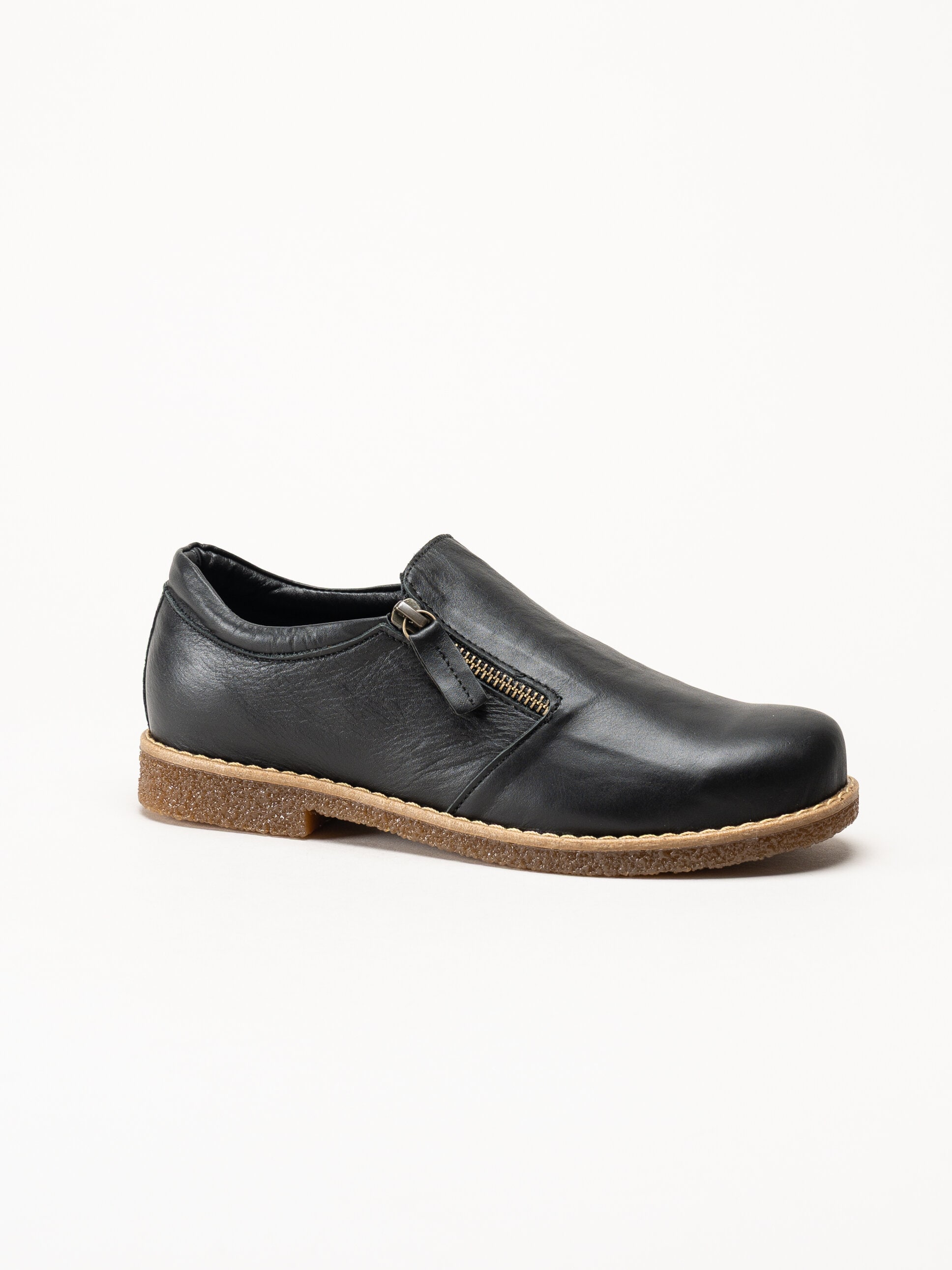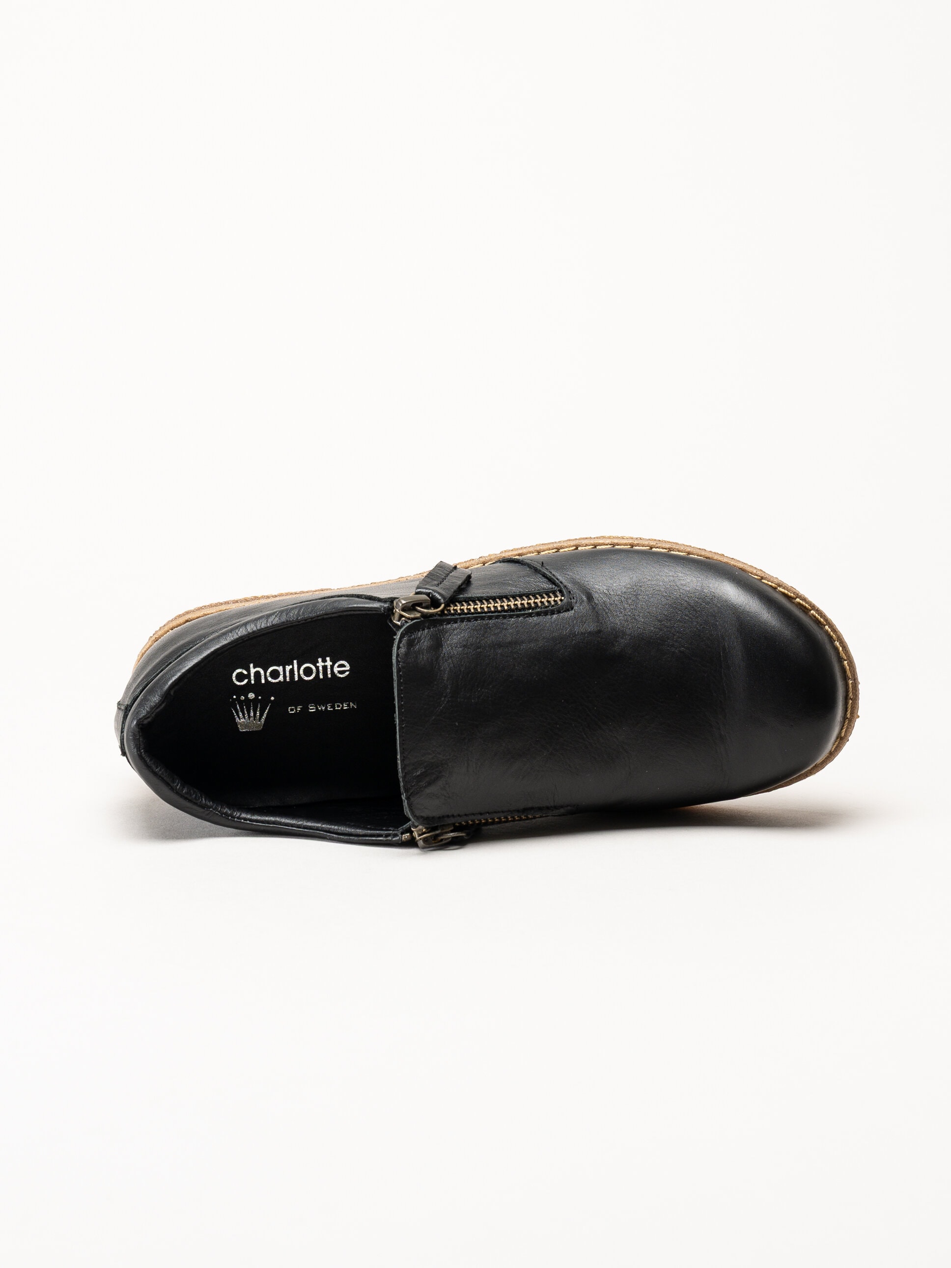 Svarta skinnskor med dragkedja från Charlotte of Sweden. Stilrena och bekväma skor tillverkade i mjukt och slitstarkt skinn som ger ett klassiskt och tidlöst intryck. Invändigt är modellen fodrad med skinn för en följsam och behaglig känsla mot foten, och den löstagbara innersulan i skinn är mjuk och skön samt ger god komfort och möjlighet att anpassa passformen eller använda egna iläggssulor.