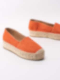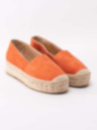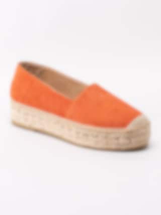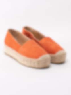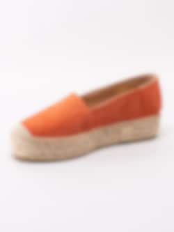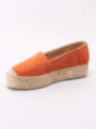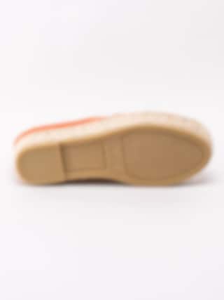 Orange espadrillos från Kanna i mocka med platåsula. Ett klassiskt sommarval i skoväg med en modern detalj som platåsula i en härlig sommarfärg. Foder och innersula i skinn med konturerad logotyp i hälen. Tråcklad söm längs sulkant som är karaktäristiskt för espadrillos. Flätad mellansula i bast på ca 4 cm. Beige yttersula i syntet.