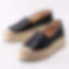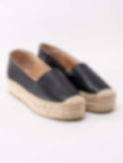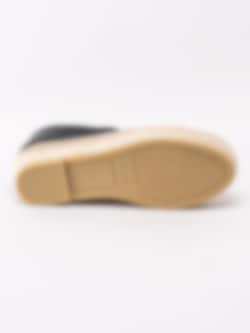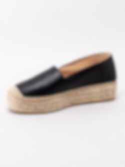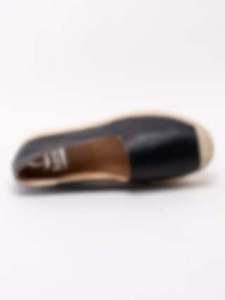 Svarta espadrillos från Kanna i skinn med platåsula. Ett klassiskt sommarval i skoväg med en modern detalj som platåsula. Foder och innersula i skinn med konturerad logotyp i hälen. Tråcklad söm längs sulkant som är karaktäristiskt för espadrillos. Flätad mellansula i bast på ca 4 cm. Beige yttersula i syntet.