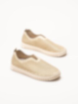 Beige slip-on skor Tulip Glitter från Ilse Jacobsen i färgen Platin Pearled Ivory. Skorna är tillverkade i syntet med en perforerad ovandel som har en subtil touch av glitter och skimmer, vilket ger ett lekfullt och elegant uttryck. Den dekorativa tråcklade sömmen längs sulkanten ger en fin detalj som lyfter designen.