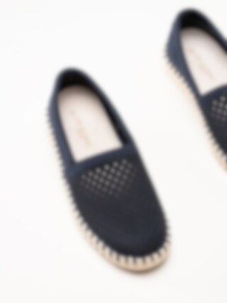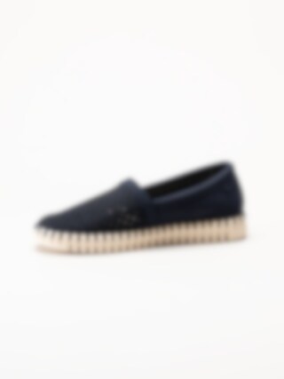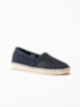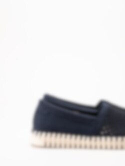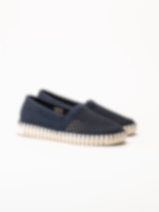 Mörkblå espadrillos Tulip från Ilse Jacobsen i färgen Dark Indigo Pearled Ivory. Skorna är tillverkade i syntet med en perforerad ovandel som ger ett luftigt och stilrent uttryck. Den dekorativa tråcklade sömmen längs sulkanten förstärker det klassiska espadrillutseendet och tillför en charmig detalj.
