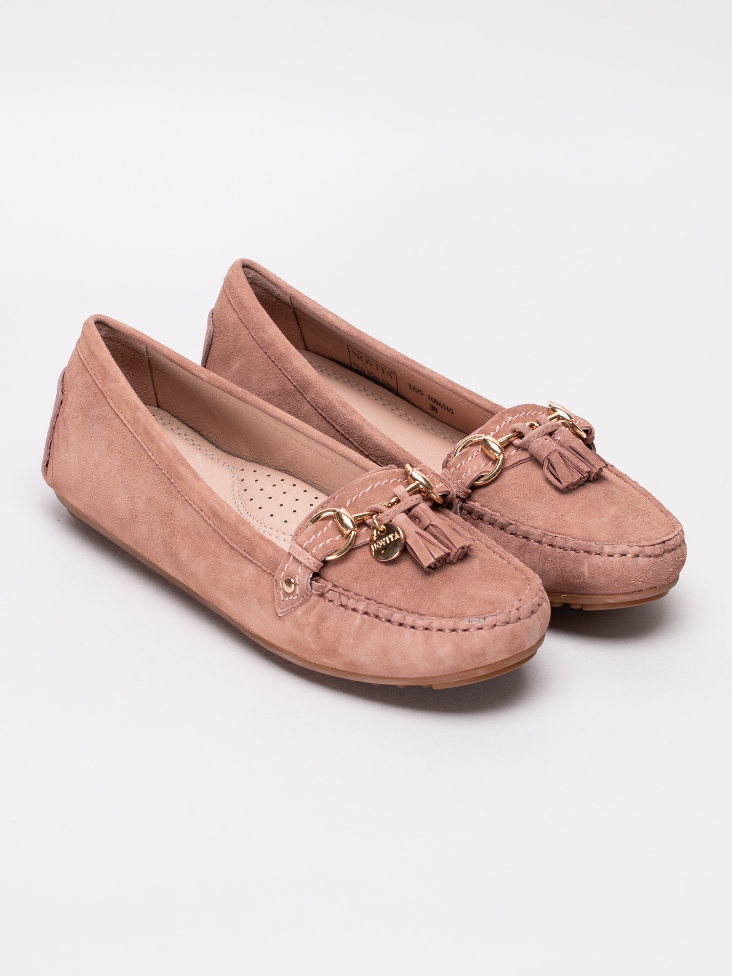 Rosa loafers Parma från Novita tillverkad i mocka. Populär modell med en dressad design. Rosa tofsar med betsel i guld på ovandel som detalj. Beigt foder och innersula i skinn med sydd tygbit med logga. Brun yttersula i gummi med prickigt mönster och logga.