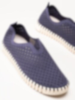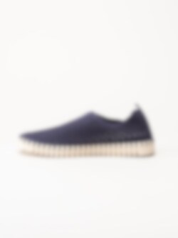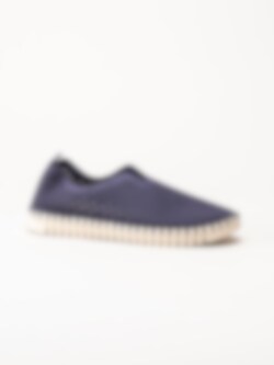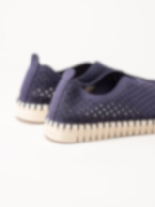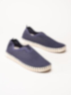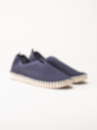 Lila slip on skor Tulip3275 Navy i återvunnen syntet från Ilse Jacobsen. Ovandel i perforeing och runda urskärningarna runt öppning. Hälla på bakskaft som hjälpmedel vid påtagning. Bekväm innersula i skinn. Dekorativ tråcklad söm längs sulkant. Ljus yttersula i gummi med randigt mönster med konturerad logga på häl och tå. Riktigt sköna och luftiga sommarskor. Leverantörens färgkod är Navy men vi upplever färgen som lila.