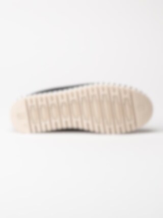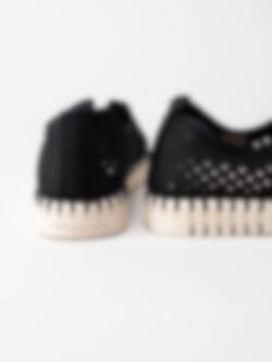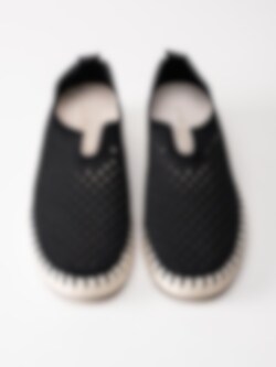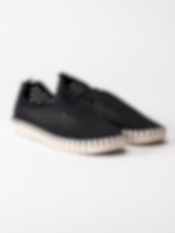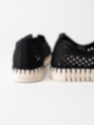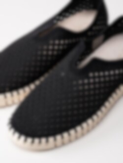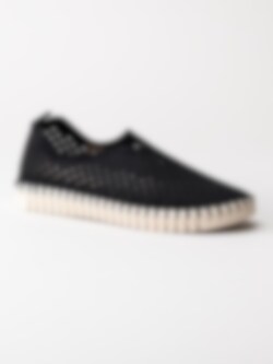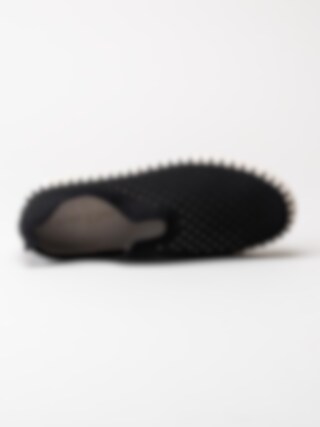 Svarta slip on skor Tulip3275 Black i återvunnen syntet från Ilse Jacobsen. Ovandel i perforeing och runda urskärningarna runt öppning. Hälla på bakskaft som hjälpmedel vid påtagning. Svart foder i syntet och ljus bekväm innersula i skinn. Dekorativ tråcklad söm längs sulkant. Ljus yttersula i gummi med randigt mönster med konturerad logga på häl och tå. Riktigt sköna slip on skor perfekta att möta vår och sommar i!