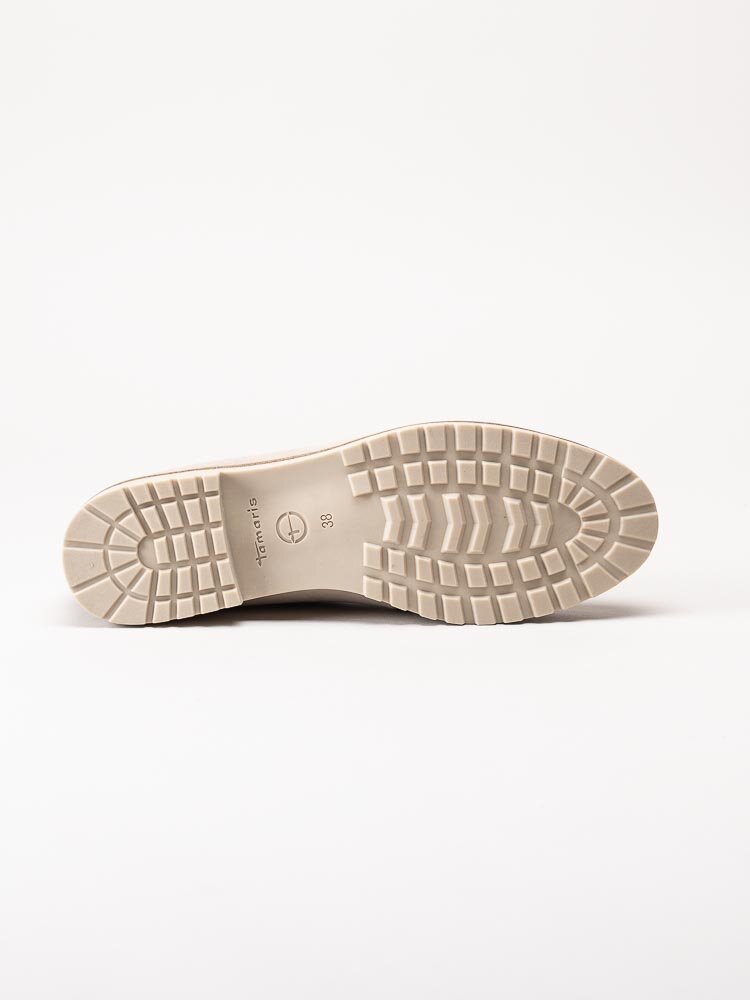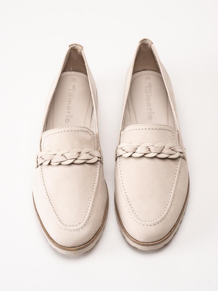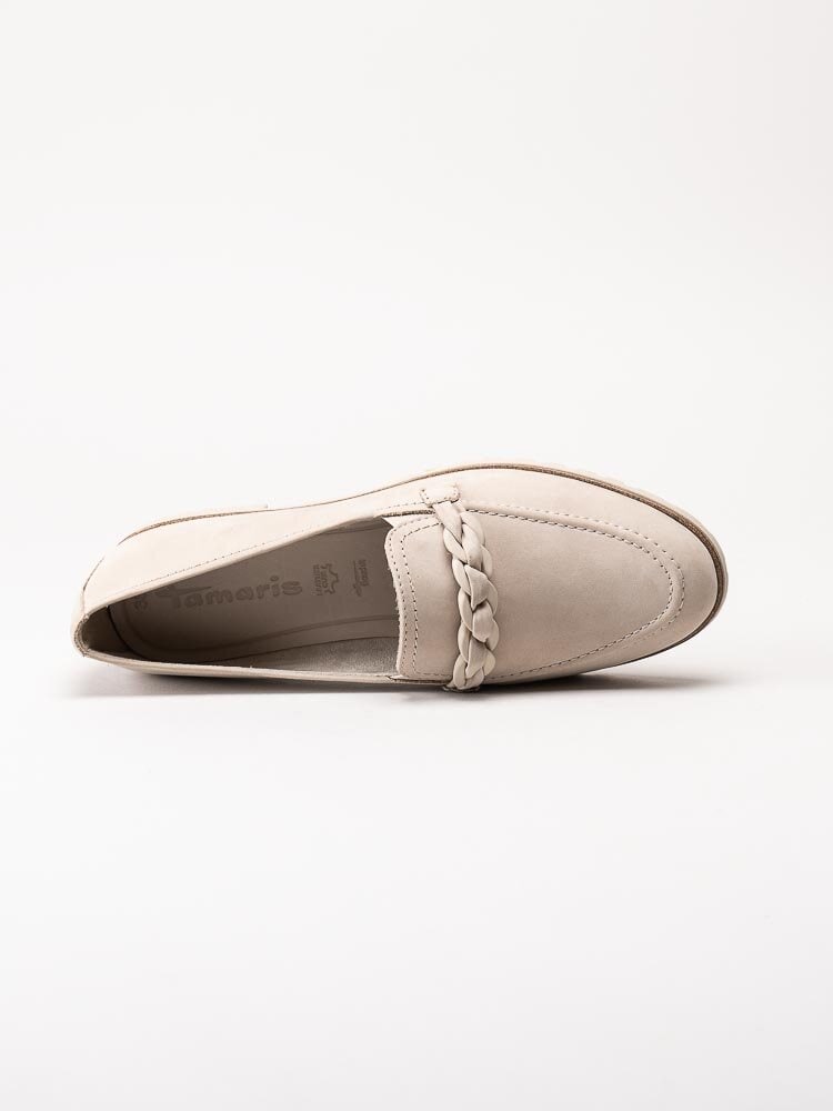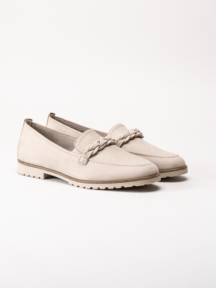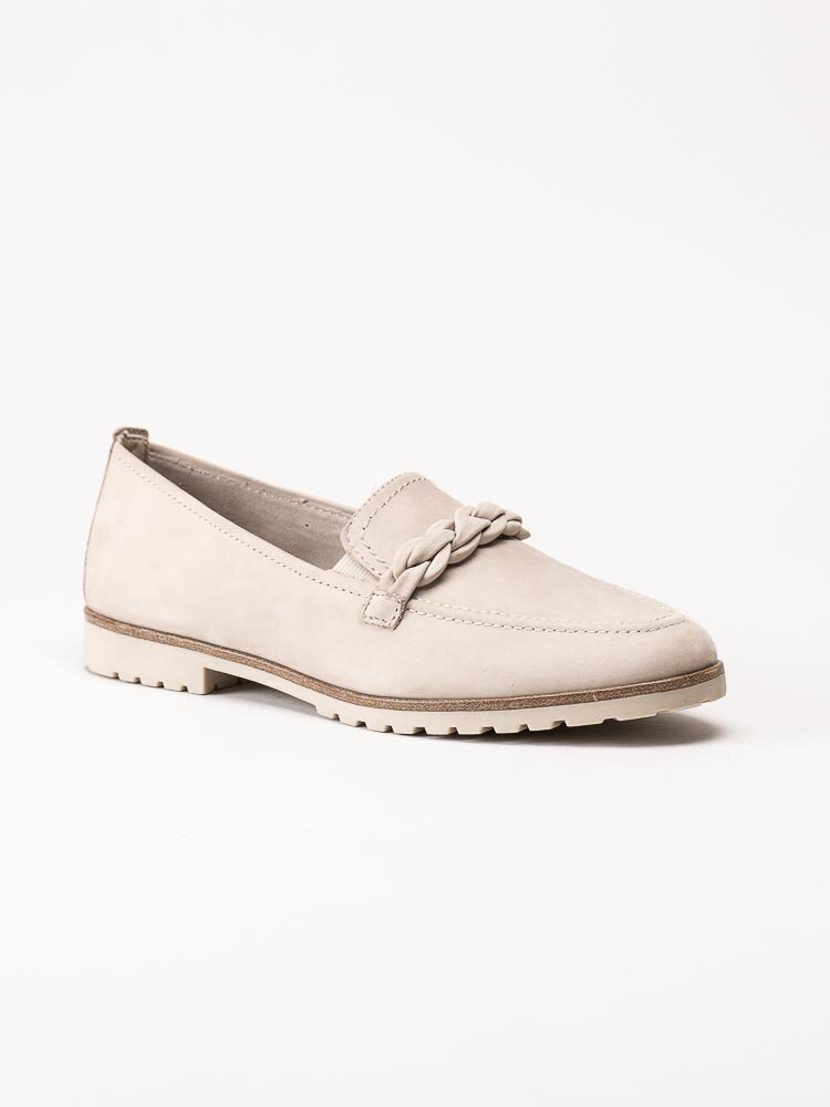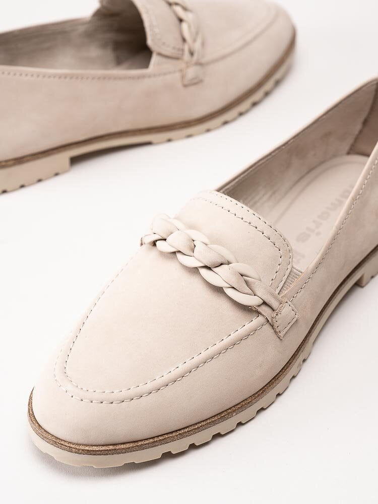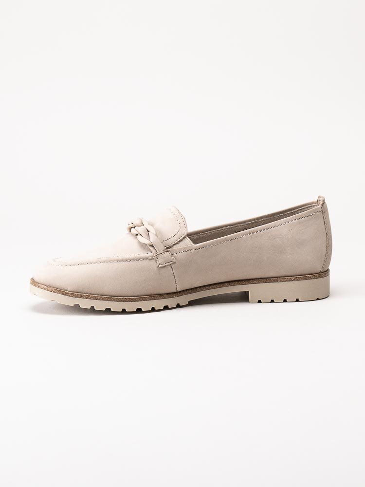 Beige loafers i nubuck från Tamaris. En snygg och stilren modell med Touch It sula i skinn och innerfoder i textil. Snygg markant brun kant runt sulan och en matt kedja som är inflätad i nubucken som skapar en klassiker att möta våren i.