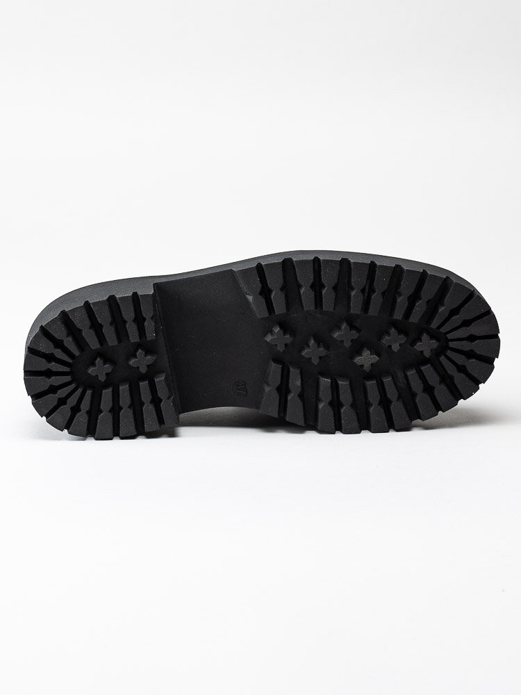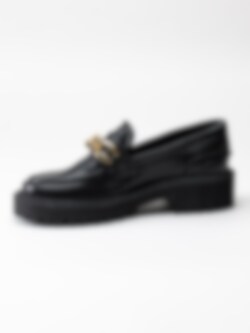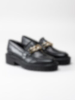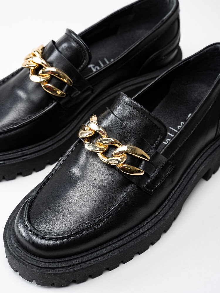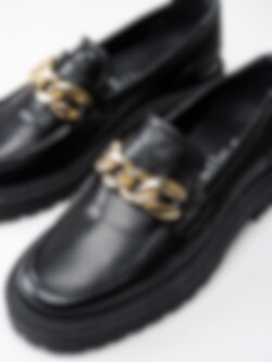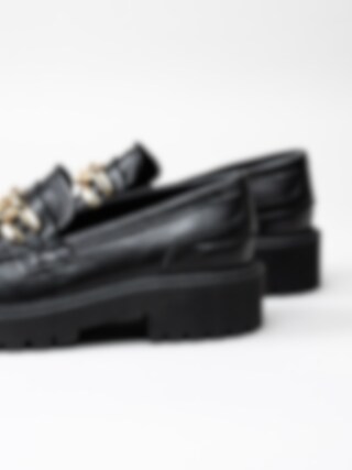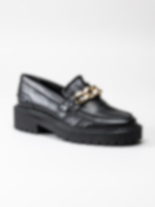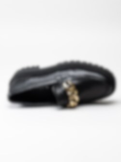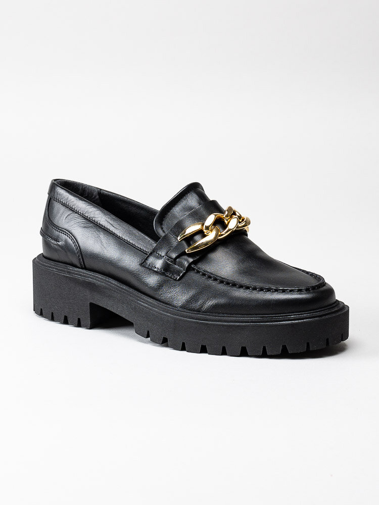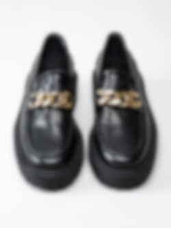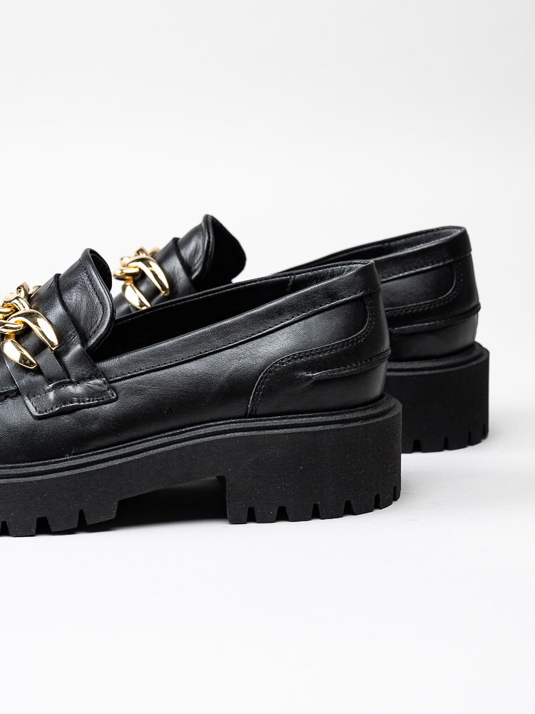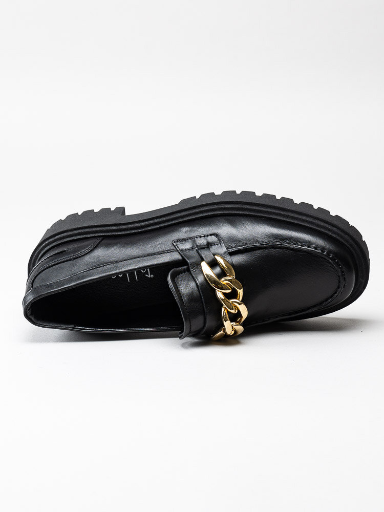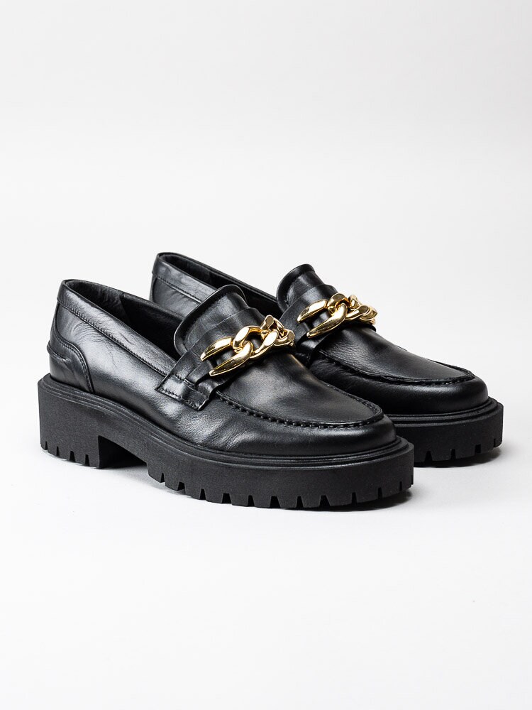 Svarta platåloafers i skinn från Duffy med grov guldfärgad kedja.