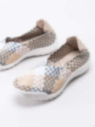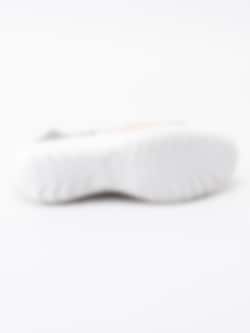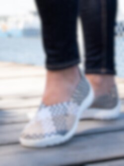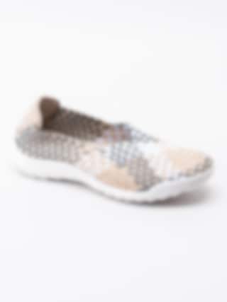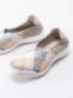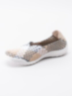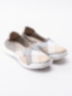 Beige slip ons skor Inoko från Rock Spring tillverkade i flätad resår med silverglittriga partier. Mjuk resår som omsluter foten som en handske och håller kvar skon på foten. Tvättbar i maskin 5 gånger i max 40 grader. Beigt foder och innersula i textil med mjuk fotbädd och upphöjd hålfot för ökad komfort. Låg klack på ca 3 cm med platå på ca 2 cm. Vit yttersula i syntet med konturerad logga i mitten.