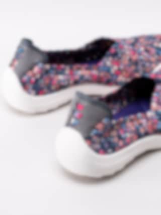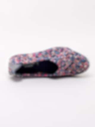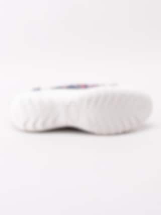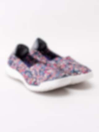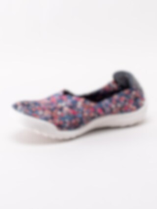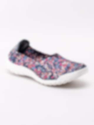 Mörkblå flerfärgade resårskor Inoko från Rock Spring i textil. Sköna elastiska promenadskor som du enkelt hoppar i. Tvättbara i maskin i 40 grader max 5 gånger. V-skärning som detalj. Förstärkt bakkappa med flätad detalj. Textilfodrade med mjuk och skön innersula i textil. Vit sula med klack på ca 3 cm och platå på ca 2 cm. V-mönstrad yttersula med konturerad logotyp i mitten.