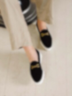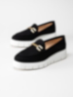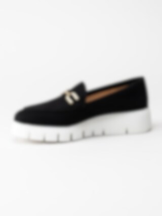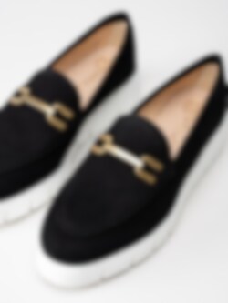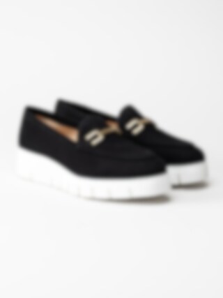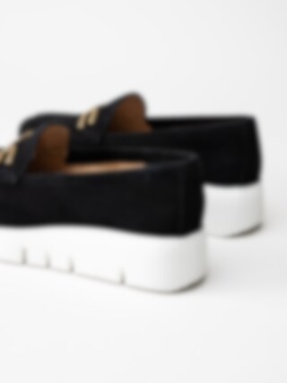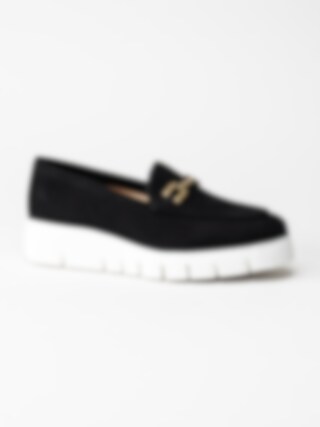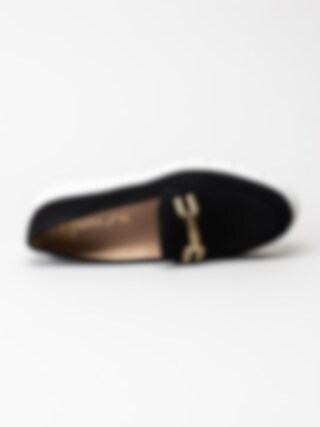 Svarta loafers i mocka från Unisa. Snygga platåloafers med guldfärgad spänne på framsidan. Foder i textil och innersula i skinn. Vit yttersula i syntet. Klackhöjd i 3.5 cm och platåhöjd i 2 cm.