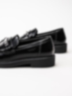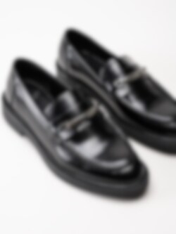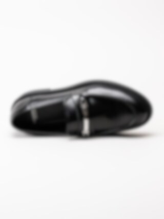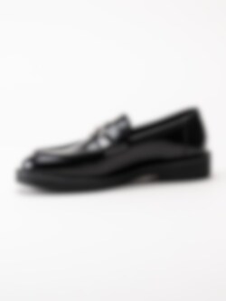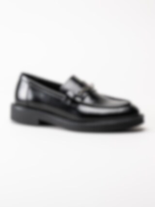 Svarta loafers i polidoskinn från Vagabond. Ett par tidlösa och stilrena skor med en spetsig tå och silverlänk framtill. Foder och innersula i skinn. Chunky yttersula i syntet med en klackhöjd på ca 2.5cm. Dessa skor är en mycket bra tillskott till garderoben!